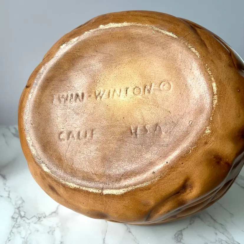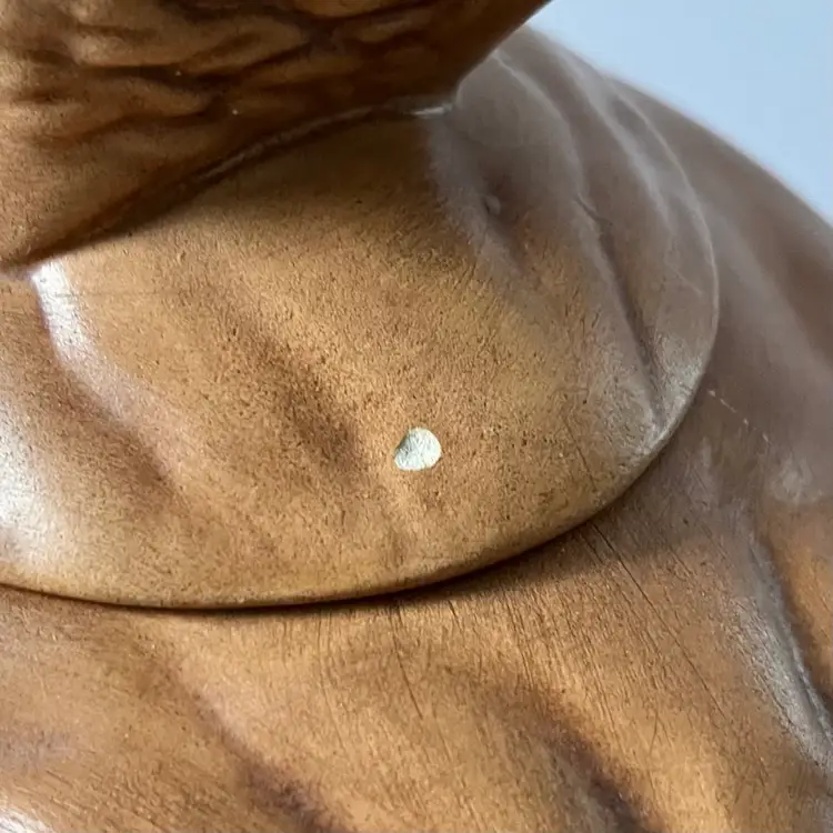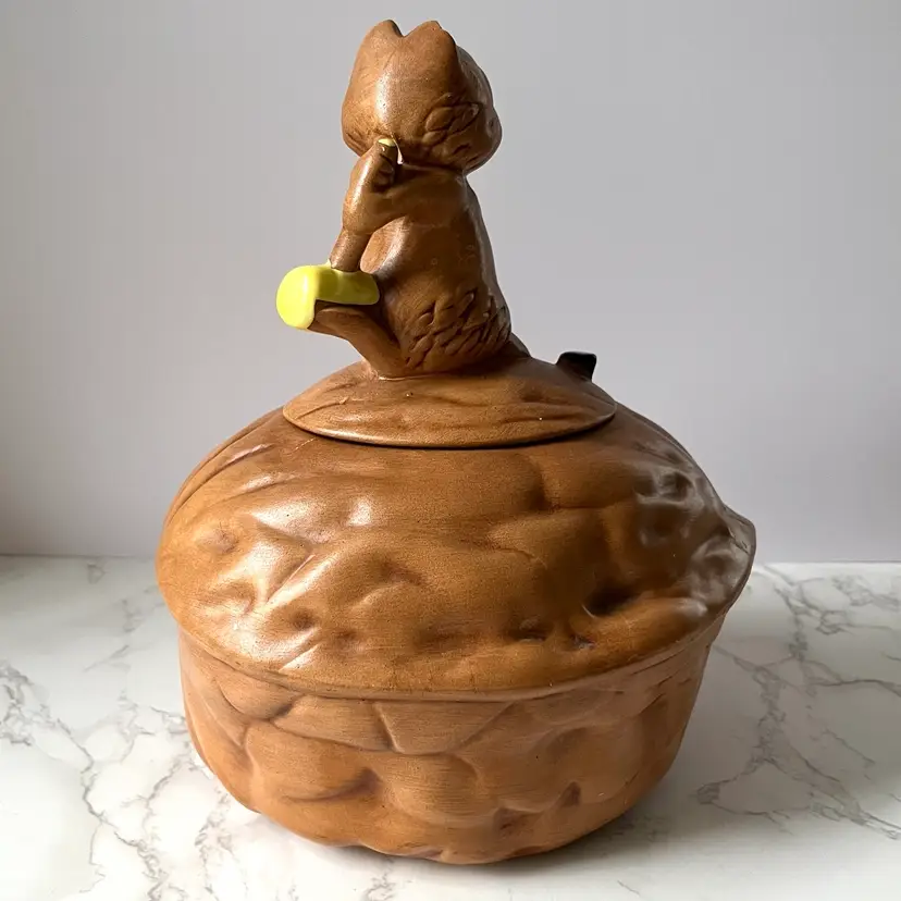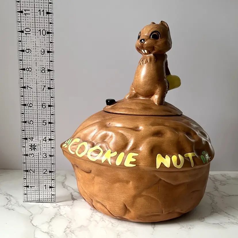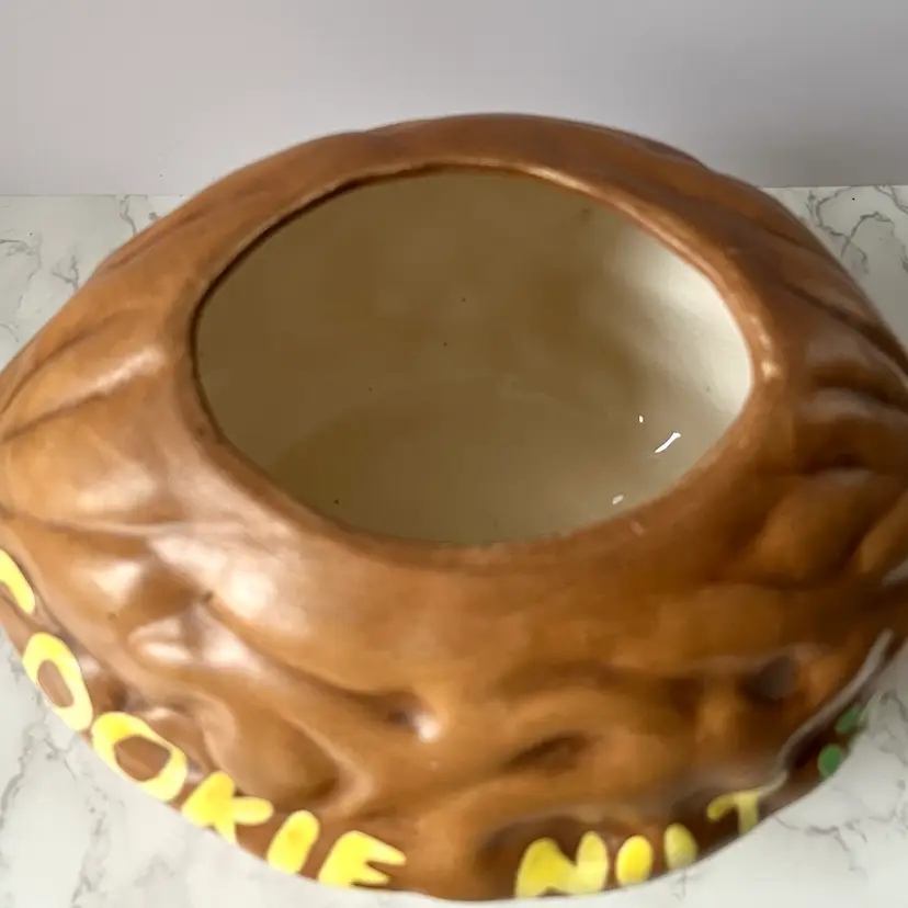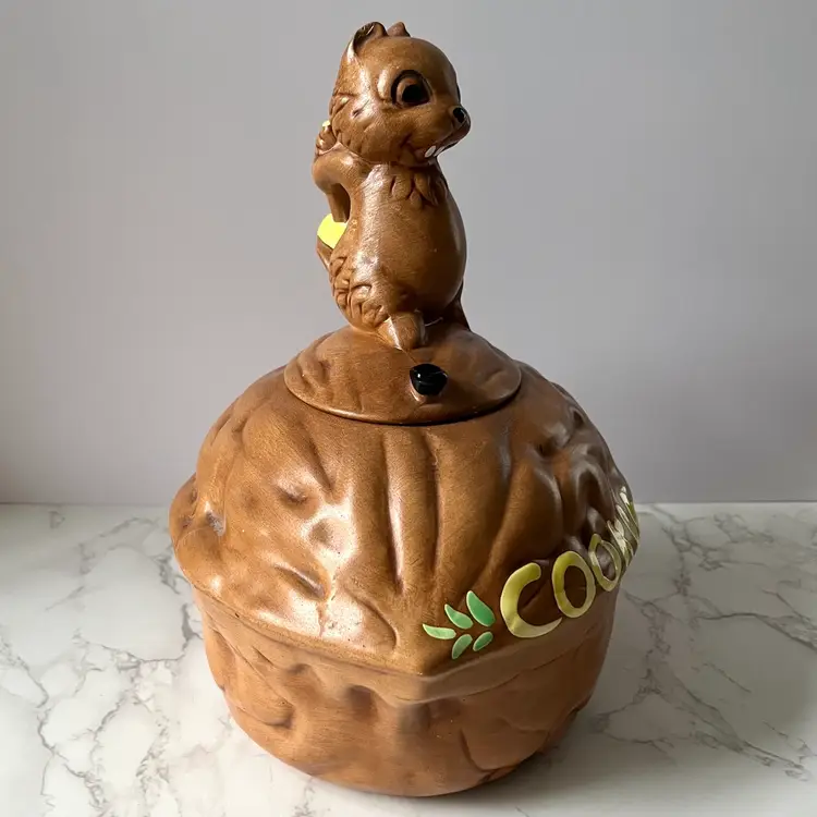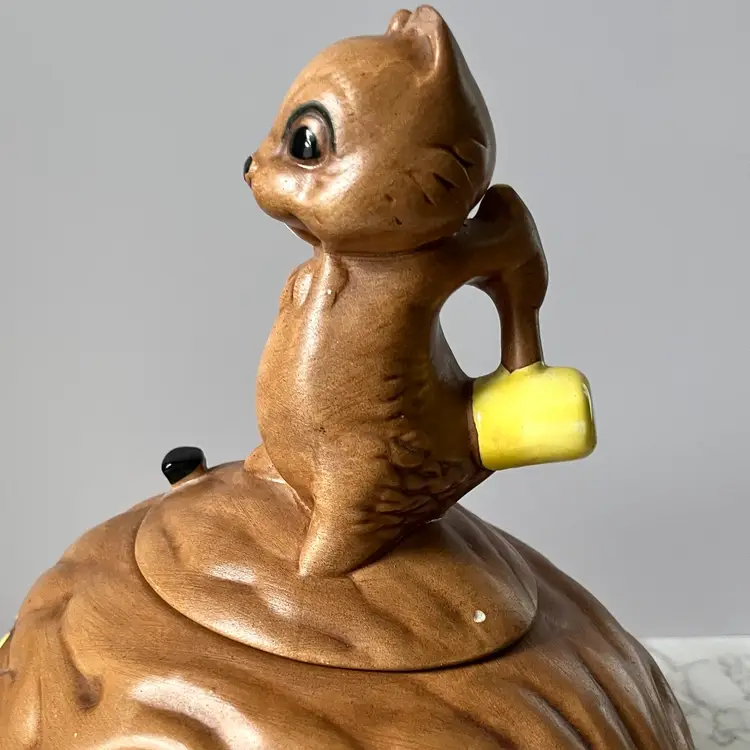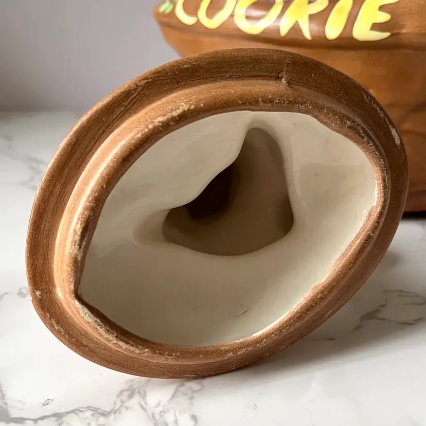 This adorable kitschy cookie jar is in good condition. There is a tiny chip on the lid - see pics.