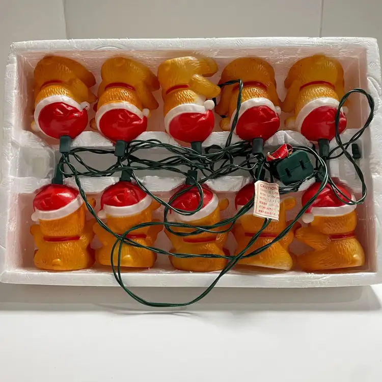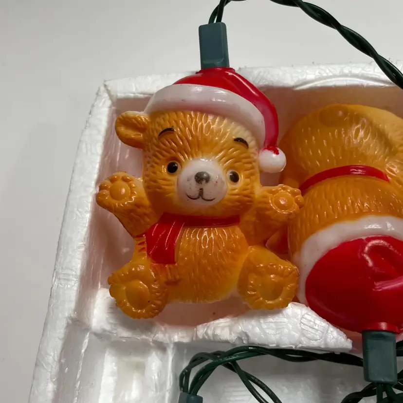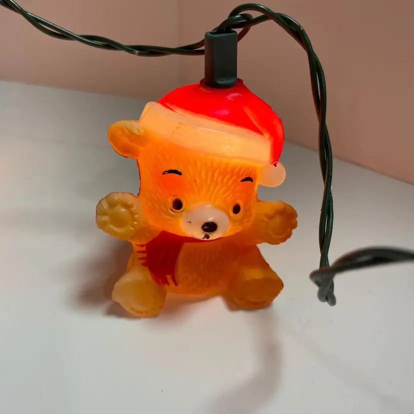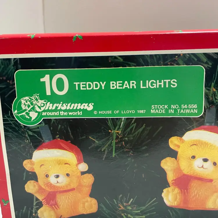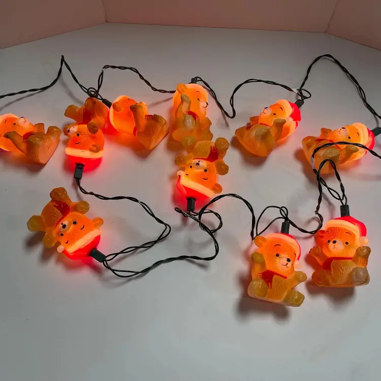 Cute little set of vintage Christmas Around the World teddy bear lights by House of Lloyd 1987. The bears are made of plastic and are blow mold. The set of lights work (see pictures), but can easily be switched out if you would like different lights. There is general wear, as this is a used item, but overall in great condition.