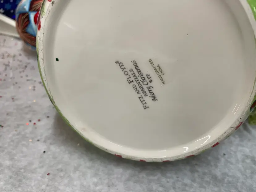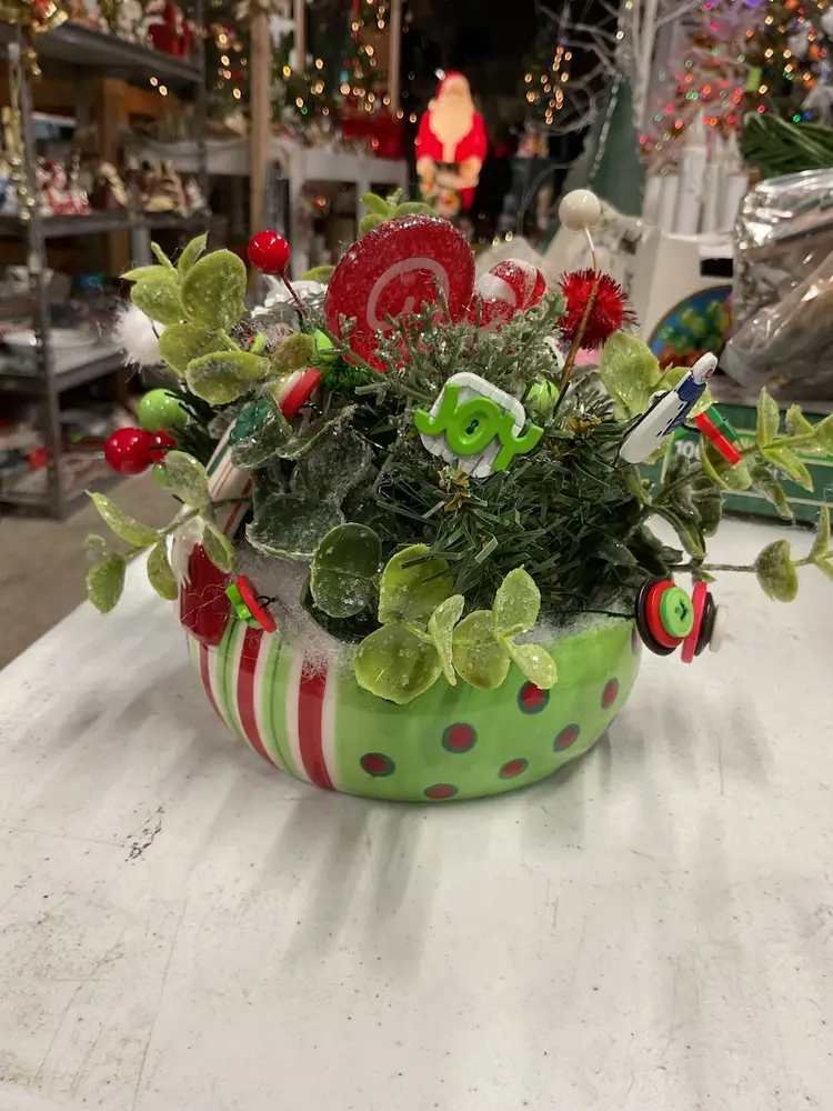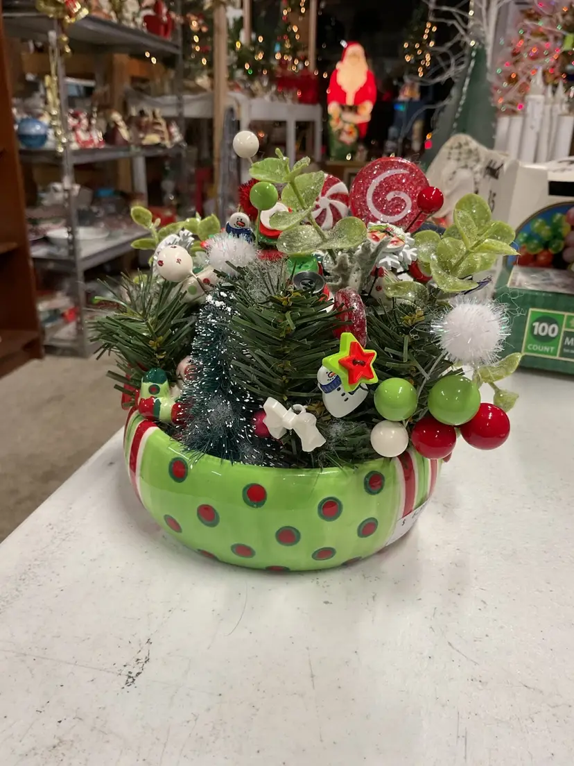 Adorable vintage Christmas assemblage includes button & pom pom picks, greenery, bottle brush, etc. all in a red, green & white Fitz & Floyd ceramic planter basket. Approximately 5” tall and 6” diameter.