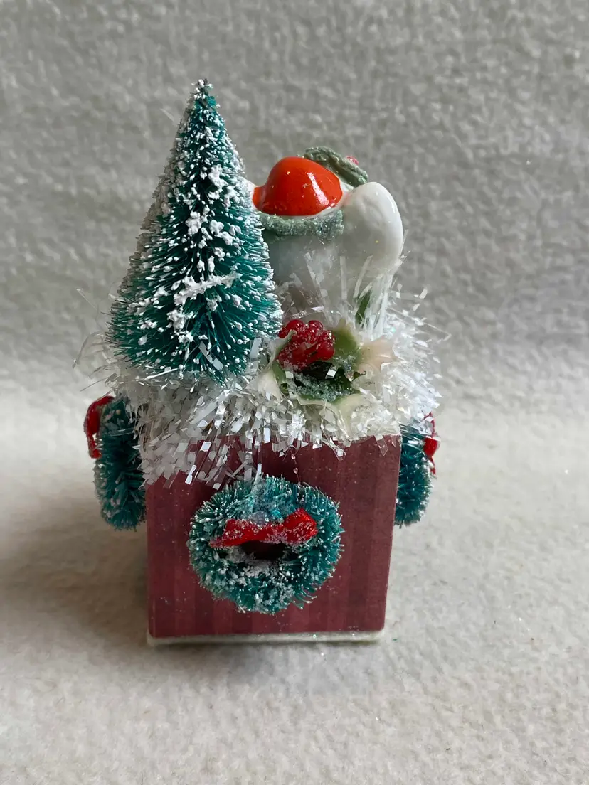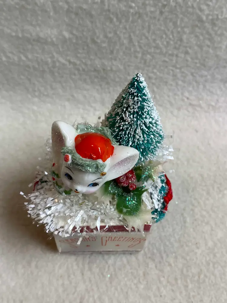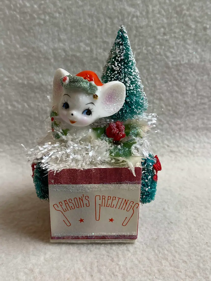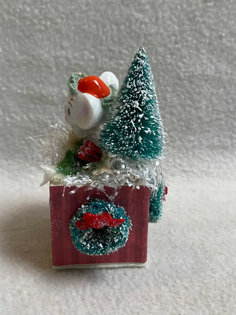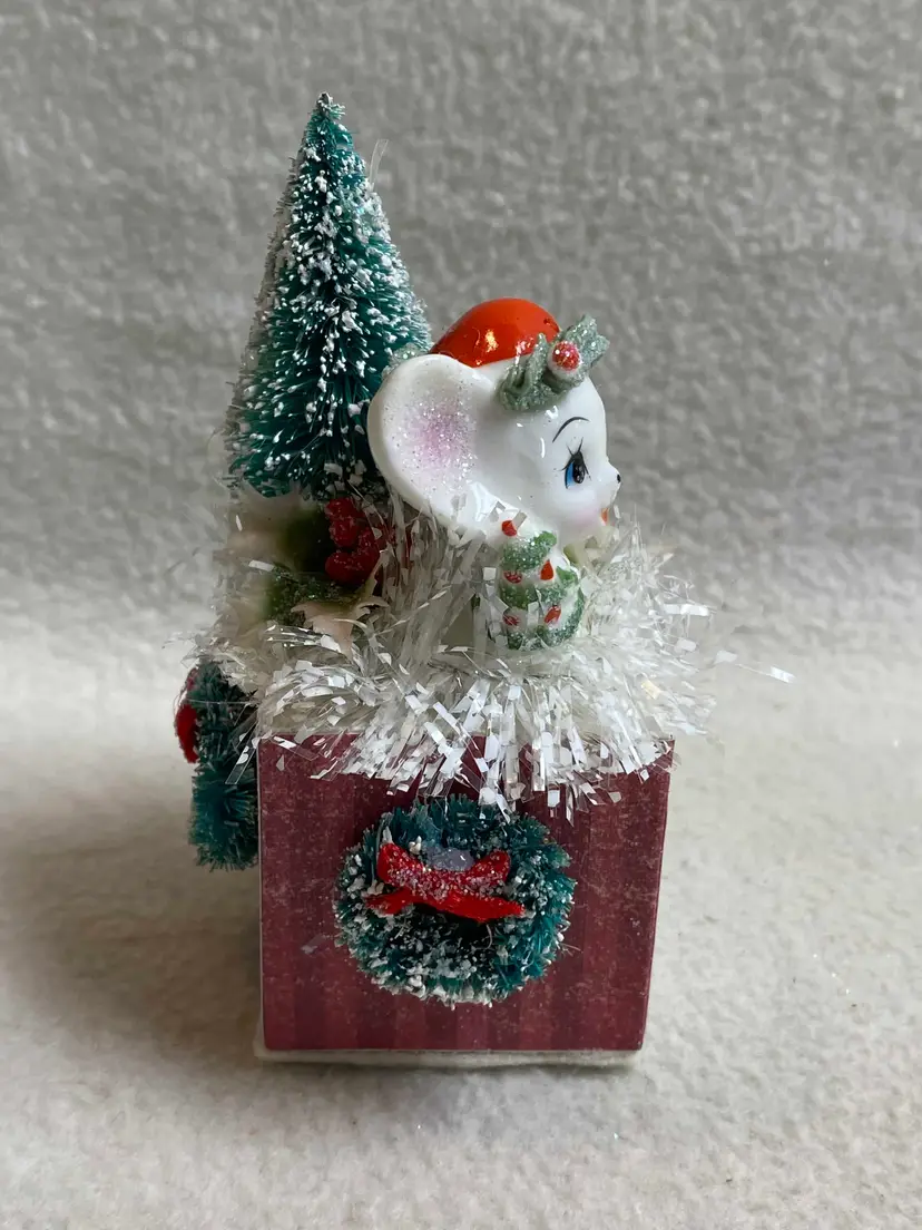 This is a small vintage handmade and unique assemblage piece for Christmas. It features a small vintage ceramic mouse that sits on a painted wooden block with a felt bottom. Other vintage pieces include a bottle brush tree, three bottle brush wreaths, plastic holly and snowy tinsel garland. The sentiment on the front is from an old Christmas card. Of course no vintage assemblage would be complete without some sparkle glitter!