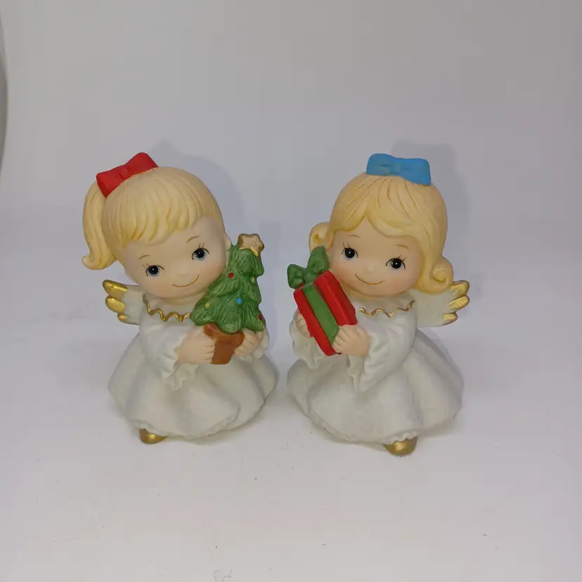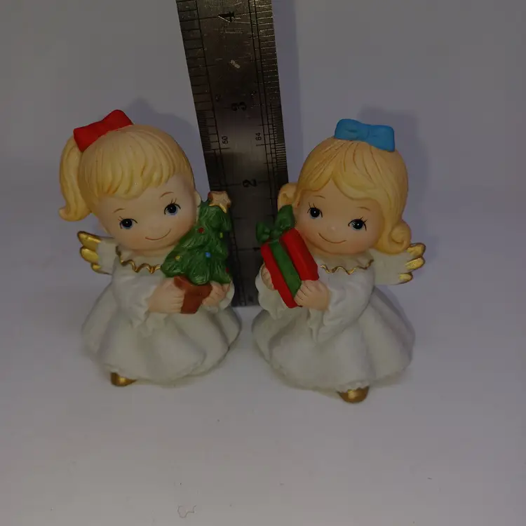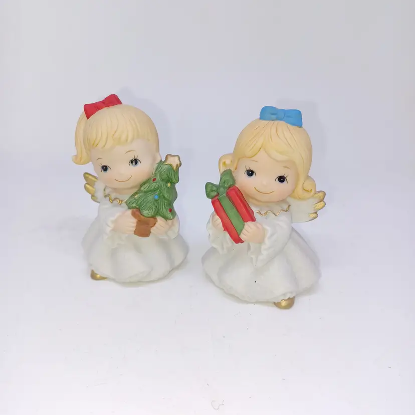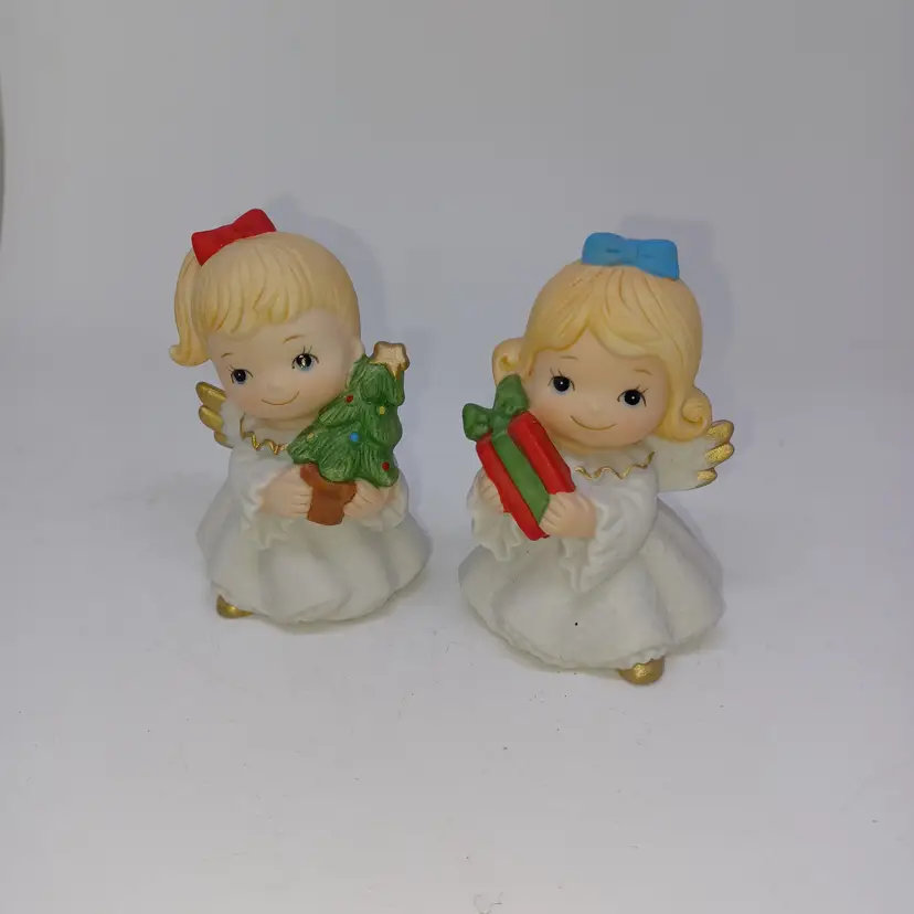 Vintage Christmas angel figurines blonde hair holding a tree & present with red and blue bows i n good vintage condition with no chips or cracks one does have some sticker residue on the bottom that I did not remove measures approximately 3 in tall please see all pictures as they are the best description all items from a smoke-free home with pets experienced fragile shipper