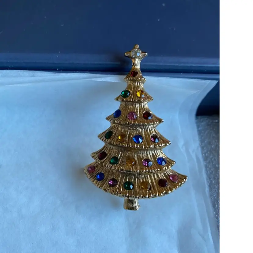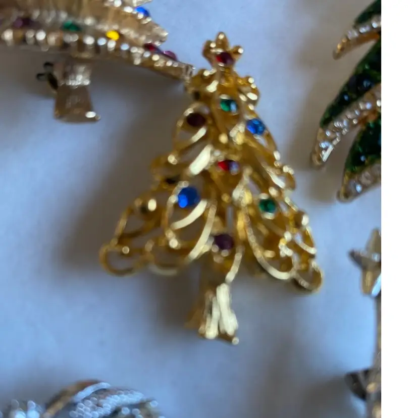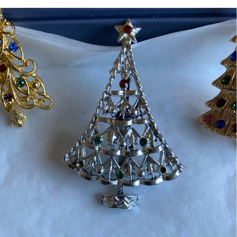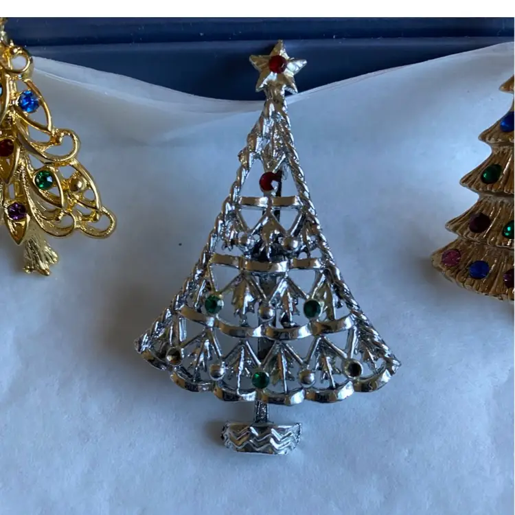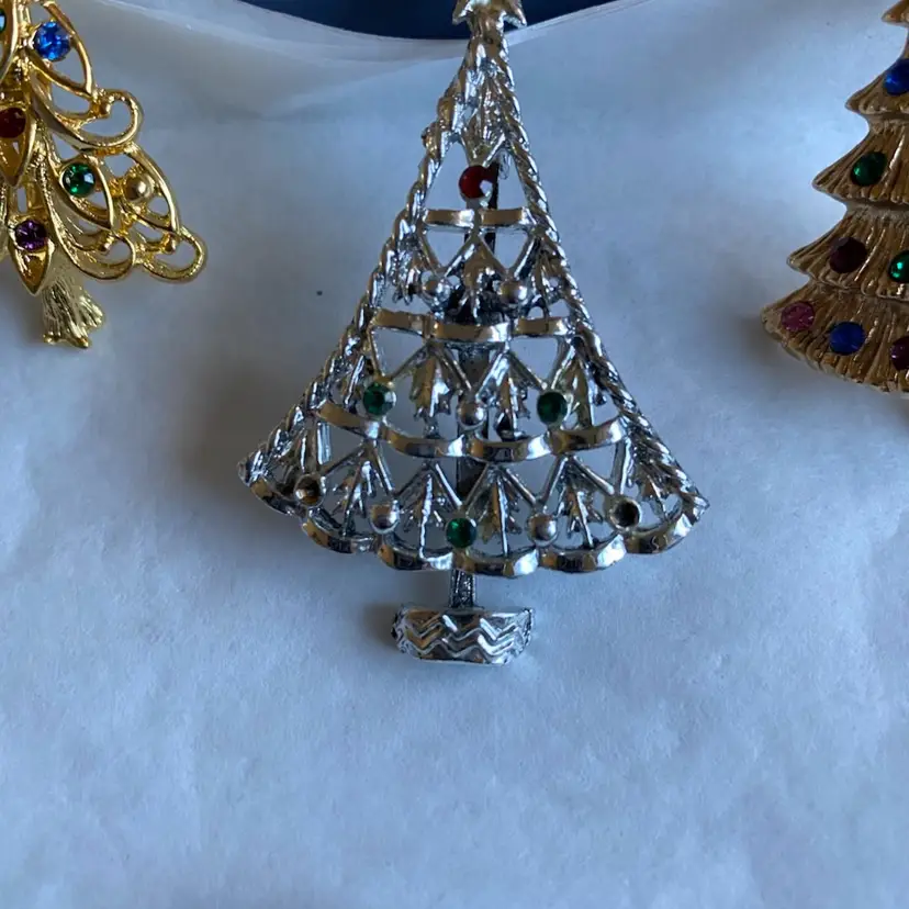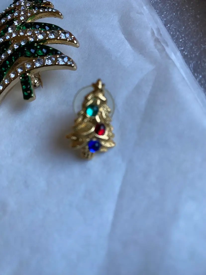 Top Row— 1 Silver Tree $15 2 Gold Tiered Tree Jonette Jewelry $25 3 Gold Tree Eisenberg Ice $40 4 SOLD! (Green Tree Macy’s $15)