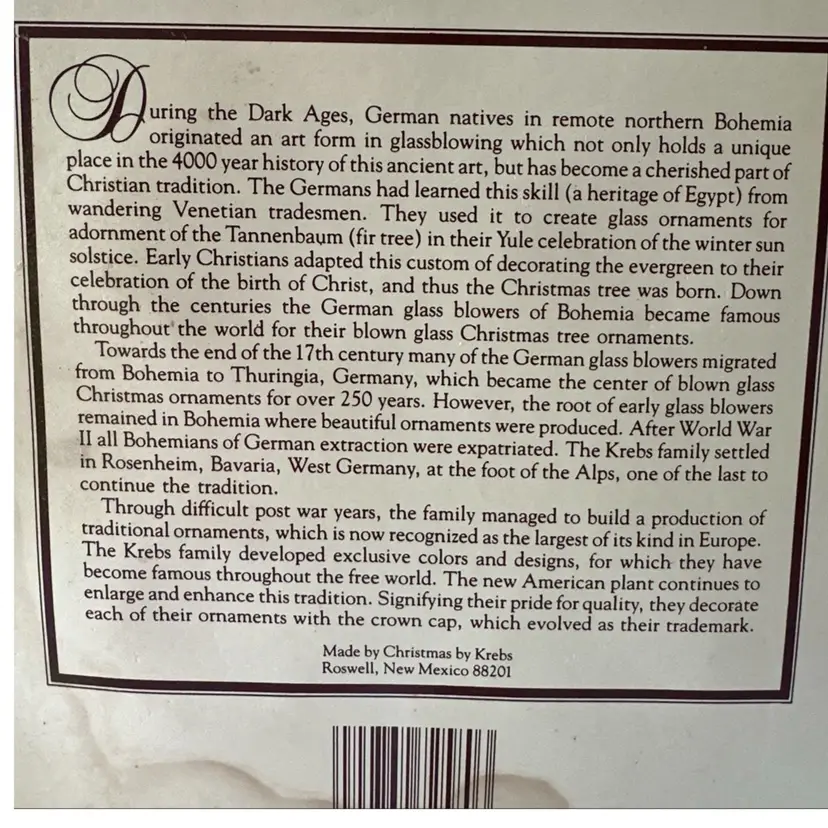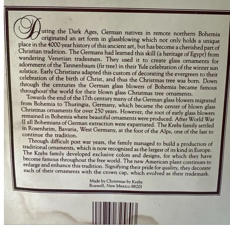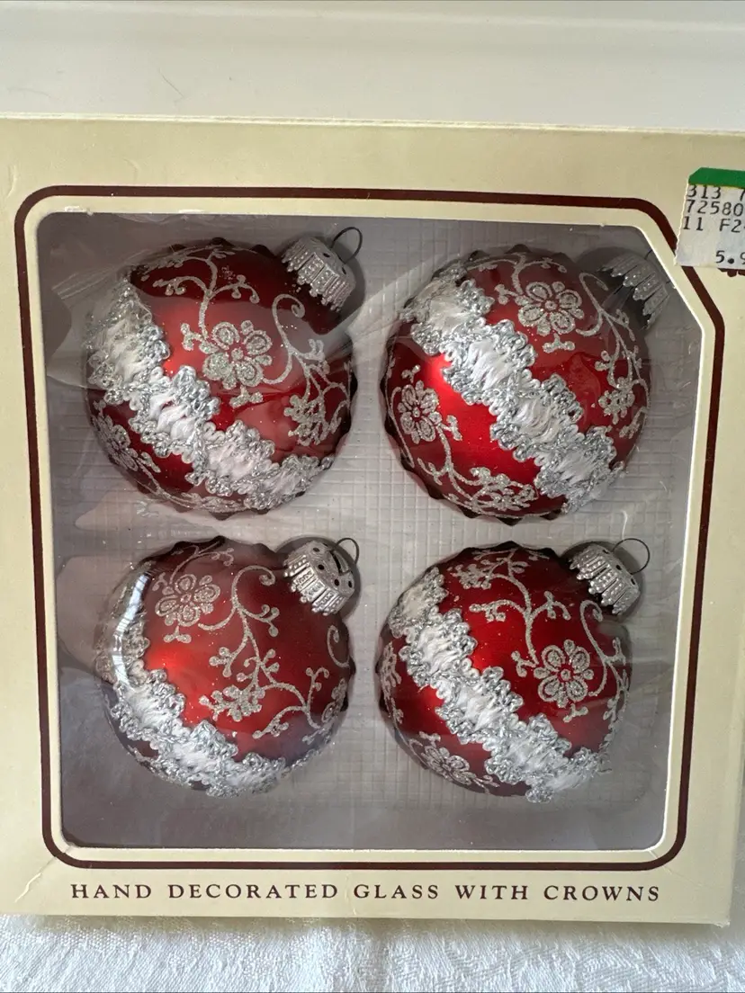 This Vintage Christmas Krebs Glass Ornaments Set of 4 features round red hand-decorated glass ornaments that are perfect for adding a festive touch to your holiday decor. Made in New Mexico, these original ornaments stand at 3 inches tall and come in a set of four, making them a charming addition to any Christmas tree. With a vintage twist and decorative features, these Krebs Glass ornaments are a timeless piece for collectors and those looking to add a touch of nostalgia to their holiday traditions. Excellent condition.