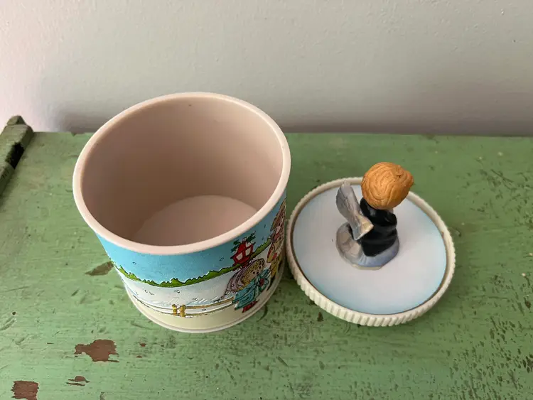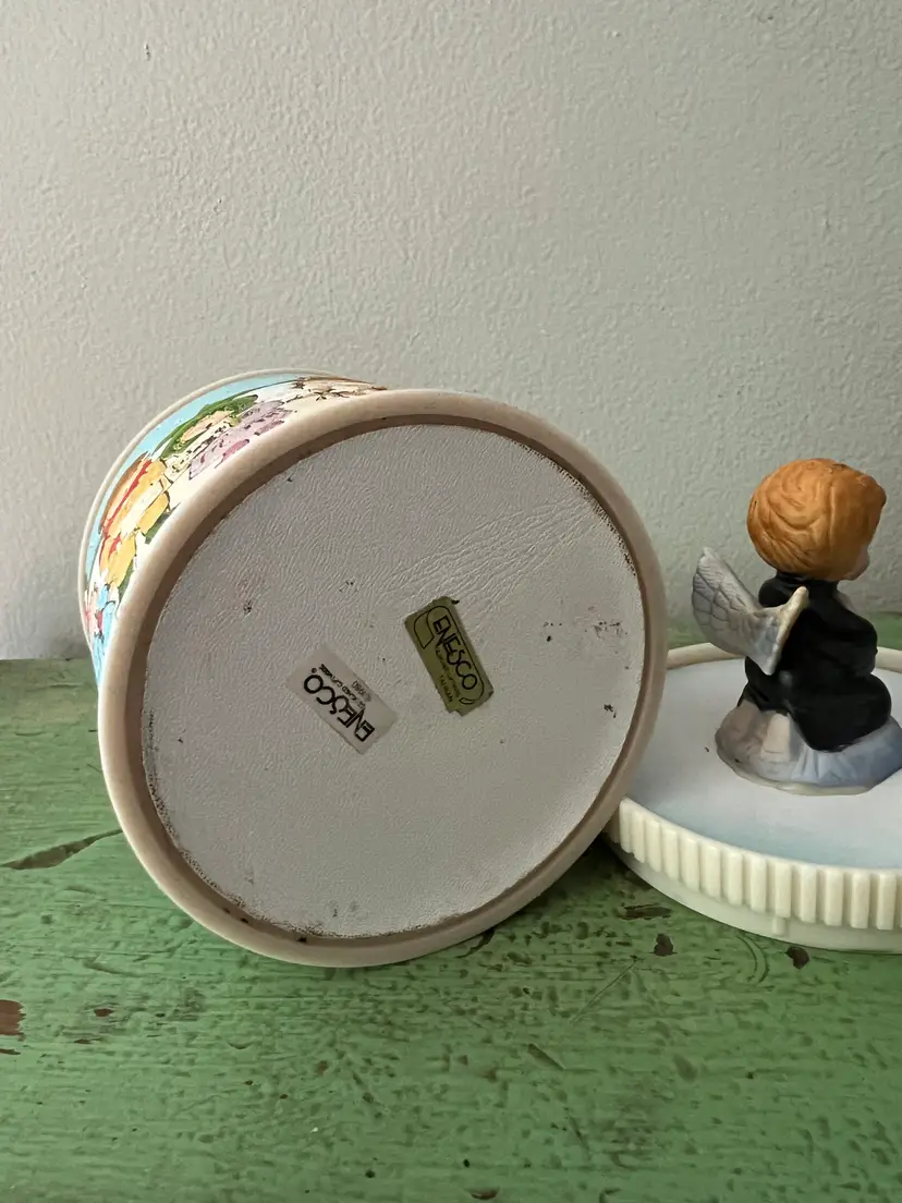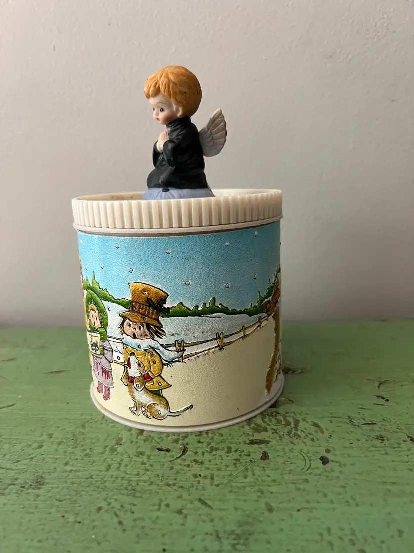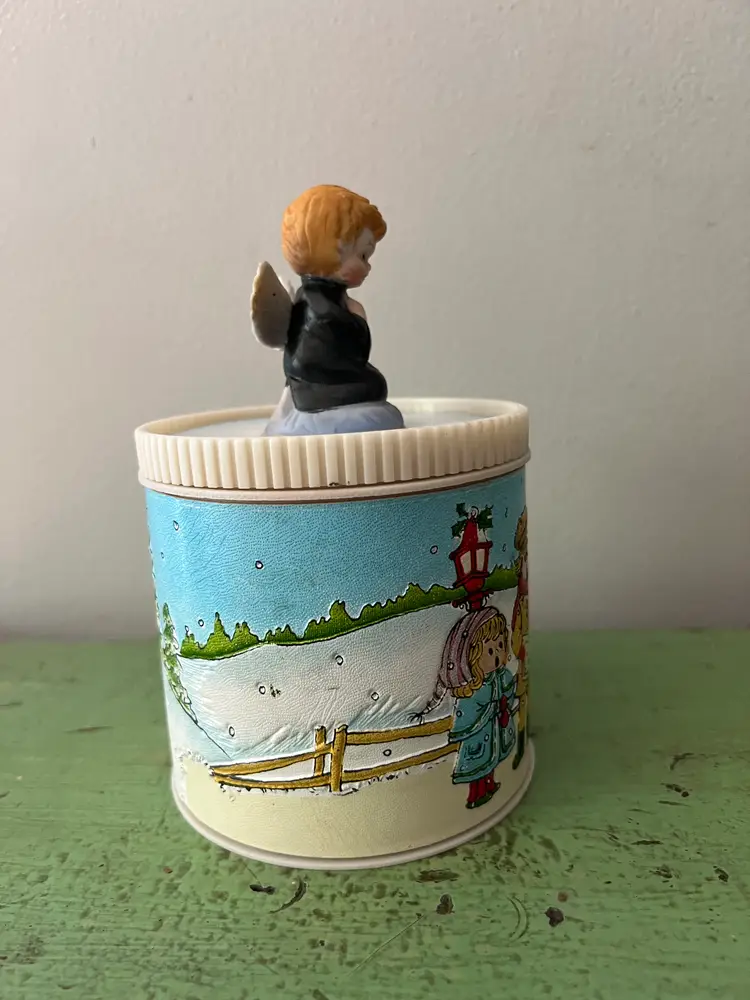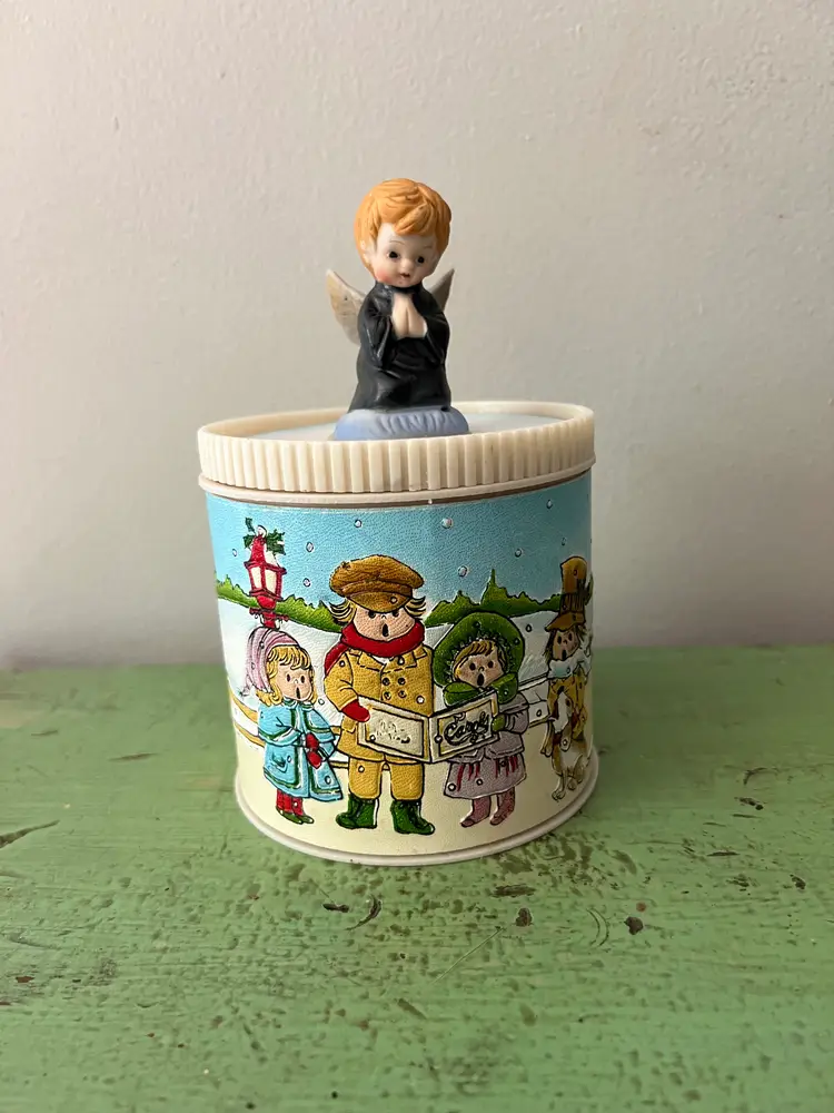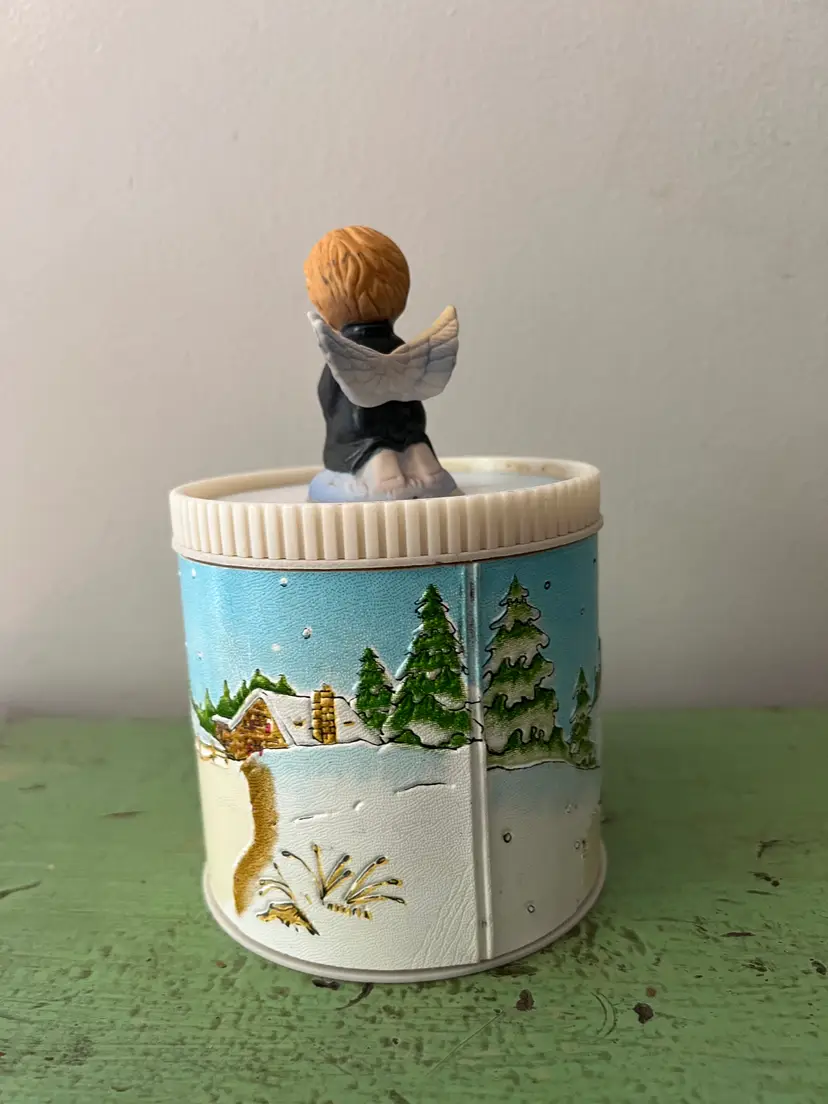 Super cute vintage Christmas canister. Enesco on the base. The canister is plastic and covered with faux leather. The image on the sides is textured. A great nostalgic piece! The base is 4" tall and 4" in diameter. (not including top angel)