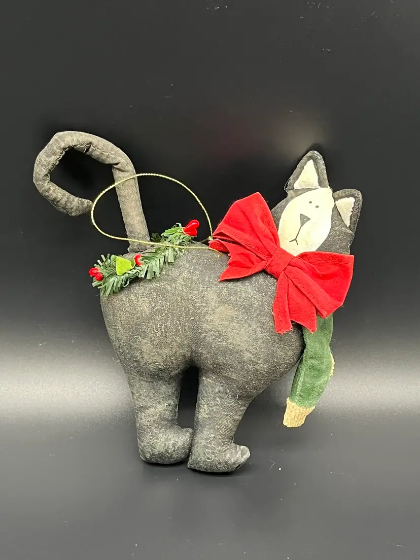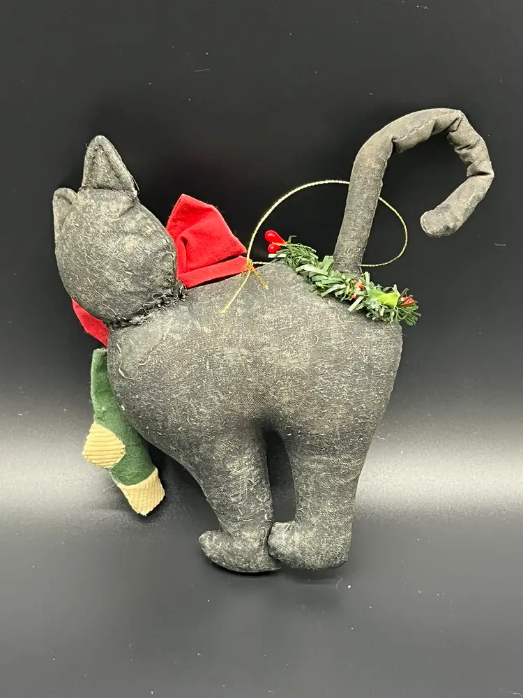 Add a dash of holiday mischief to your decor with this 6.5" tall stuffed fabric cat ornament, dressed to impress in festive flair. Featuring a red bow, green stocking and wreath. Whether perched on a shelf or nestled among your Christmas tree branches, it brings a playful, handcrafted charm - perfect for cat lovers and vintage holiday collectors alike. Shipping included. Well-loved, with no visible wear. 6.5" tall