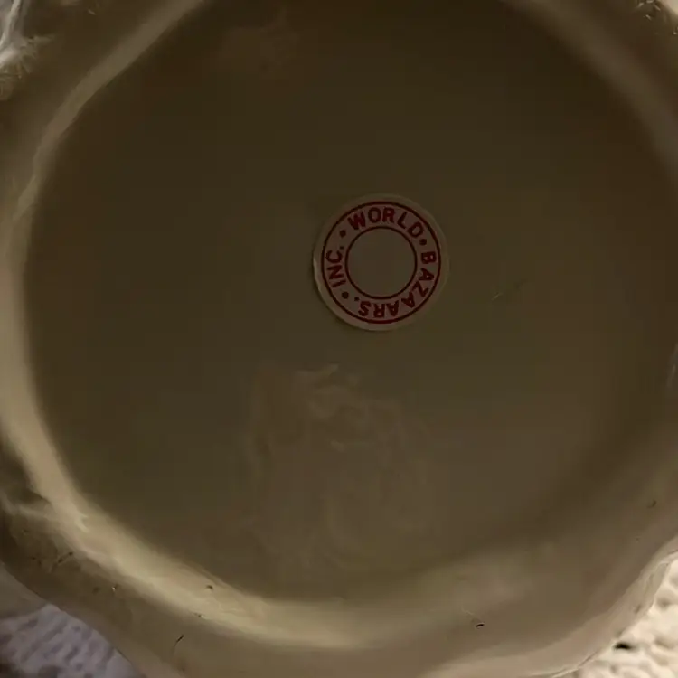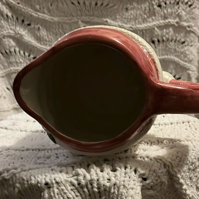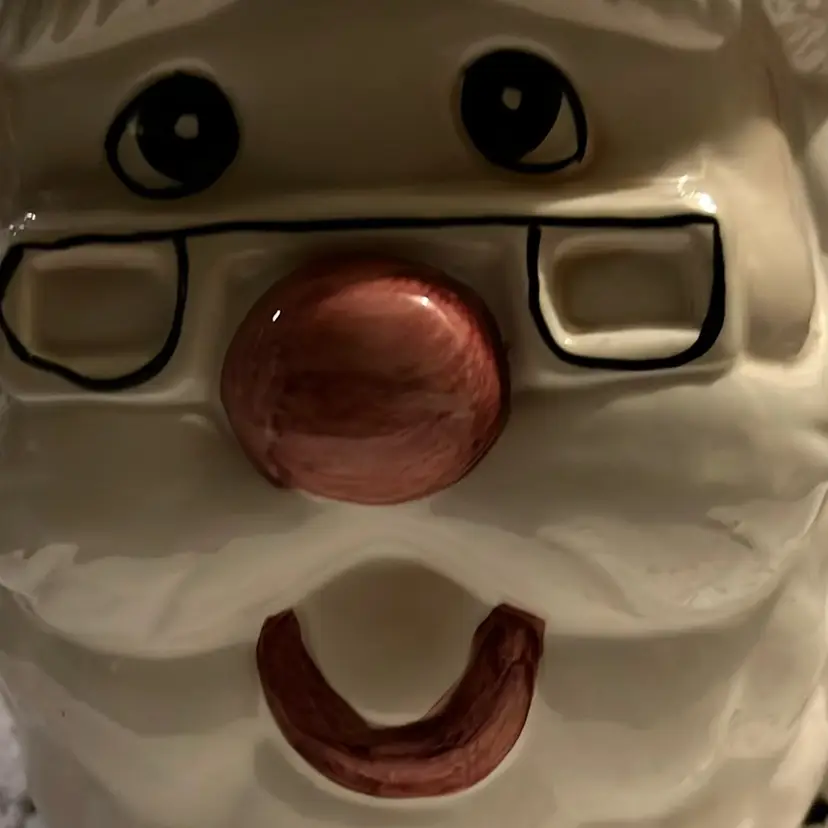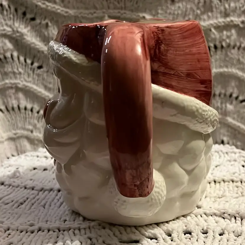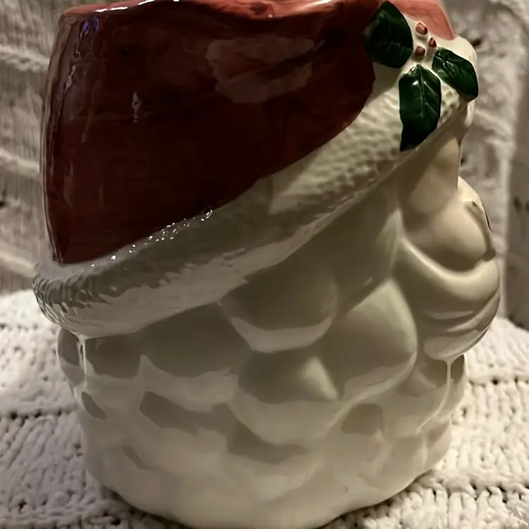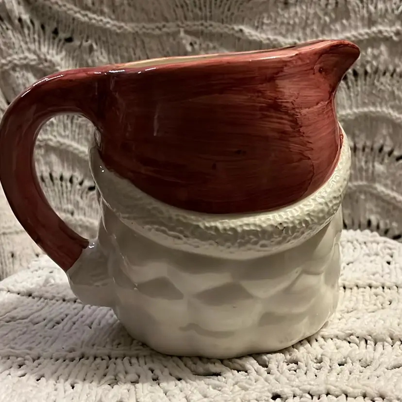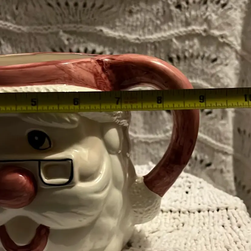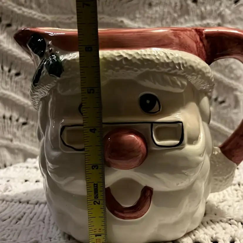 This is a new with out the box Santa pitcher. It measures 6 1/2 inches tall and about 8 1/2 inches wide. It is 5 inches in depth and weighs 1 lbs. 4 oz.. It’s a cute picture. You could also use as a planter. It’s Santas face on one side of the pitcher and the back of his hair on the other side of the pitcher.