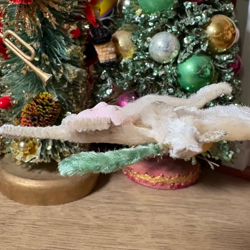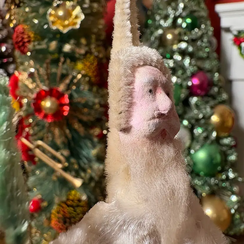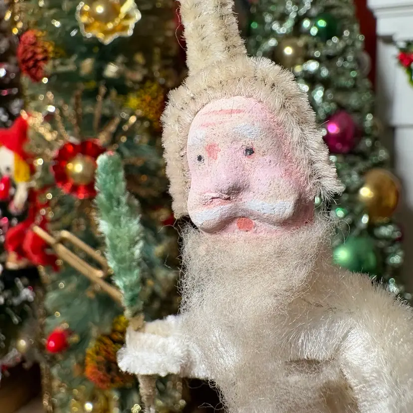 Vintage Christmas Clay Face White Chenille Santa with Tree Ornament