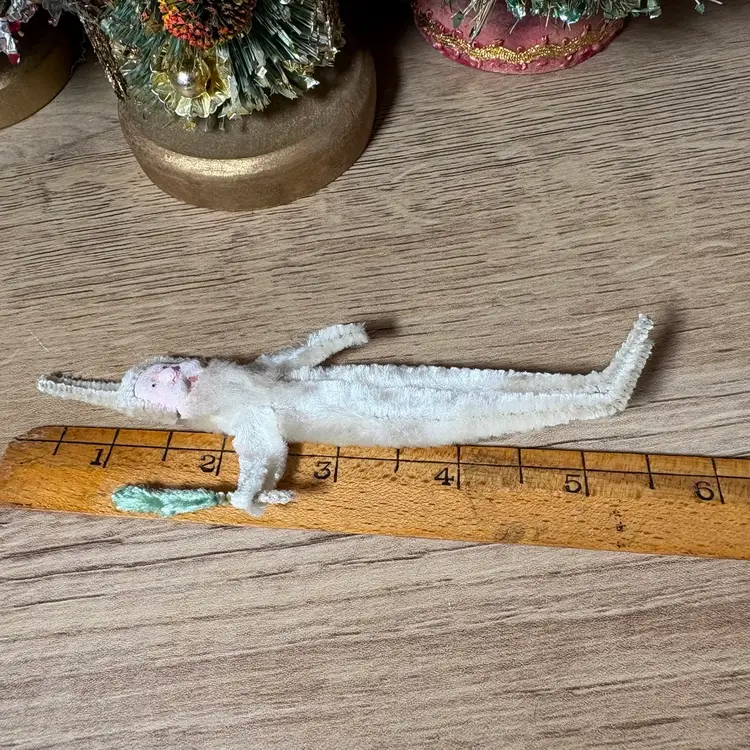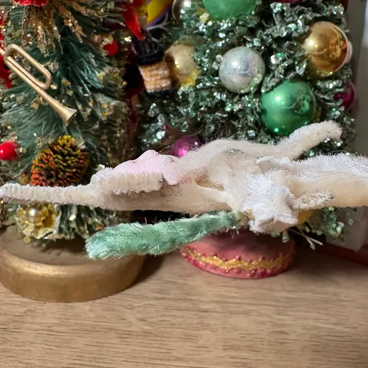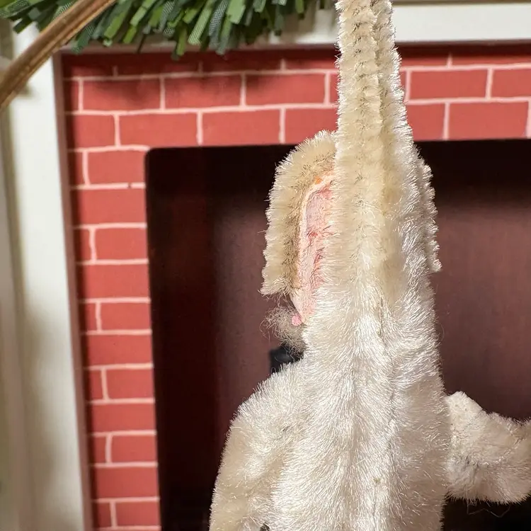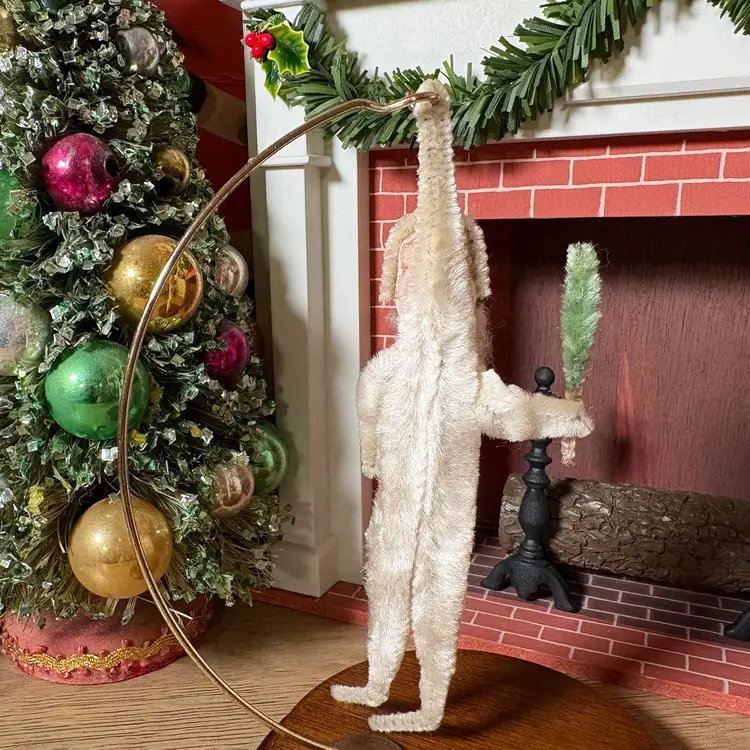 A handsome St. Nick in white chenille, holding a green tree. He's missing his hanger for hanging and has some paint wear on his face. Otherwise, he's in good condition... these white one's are hard to find so don't dilly dally!