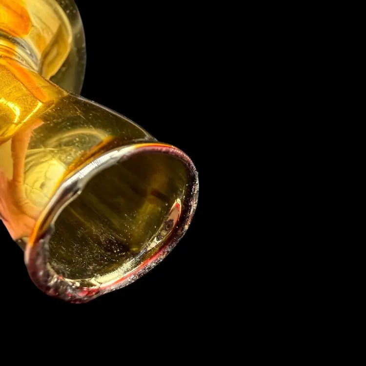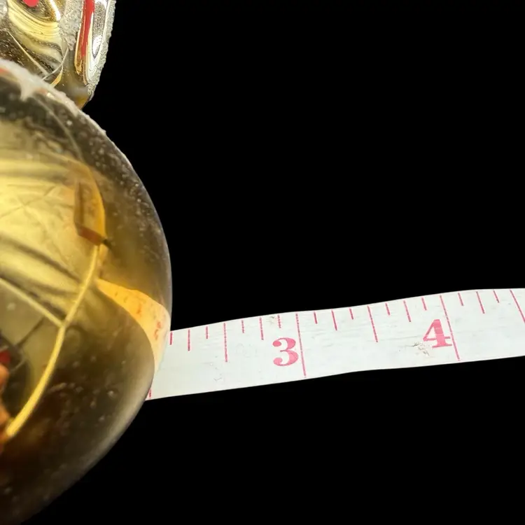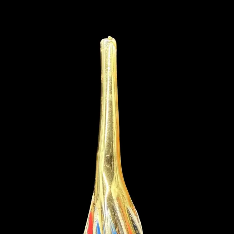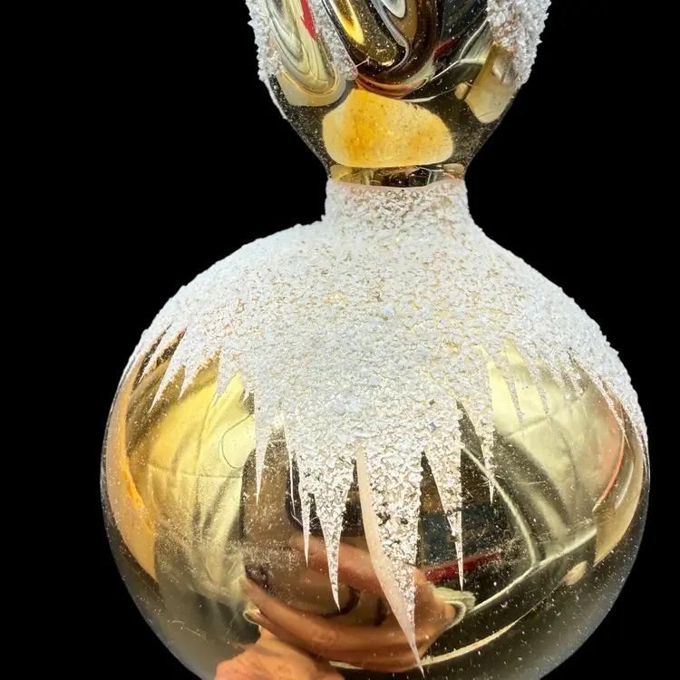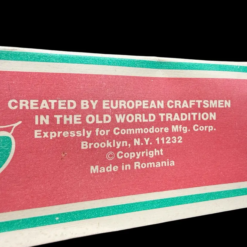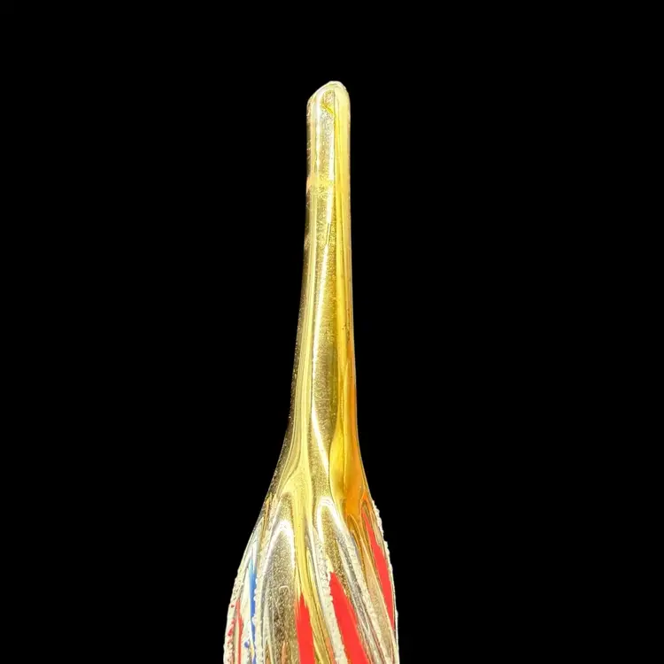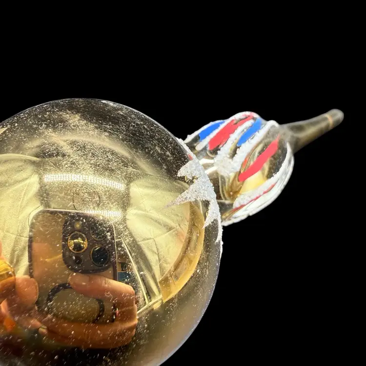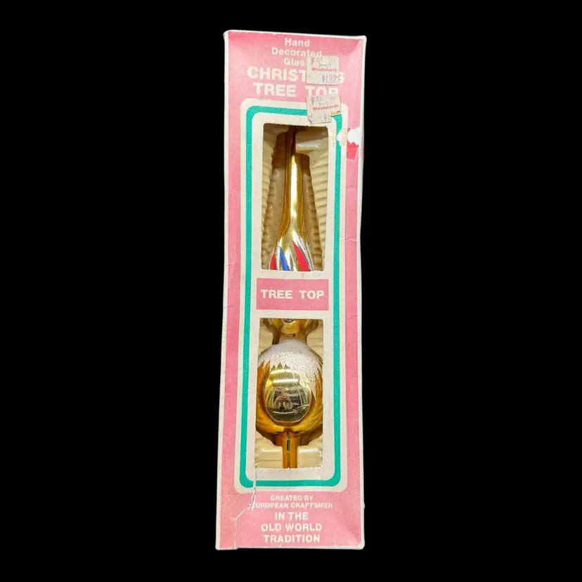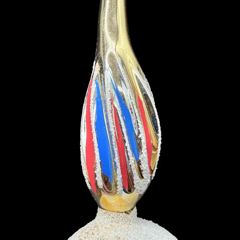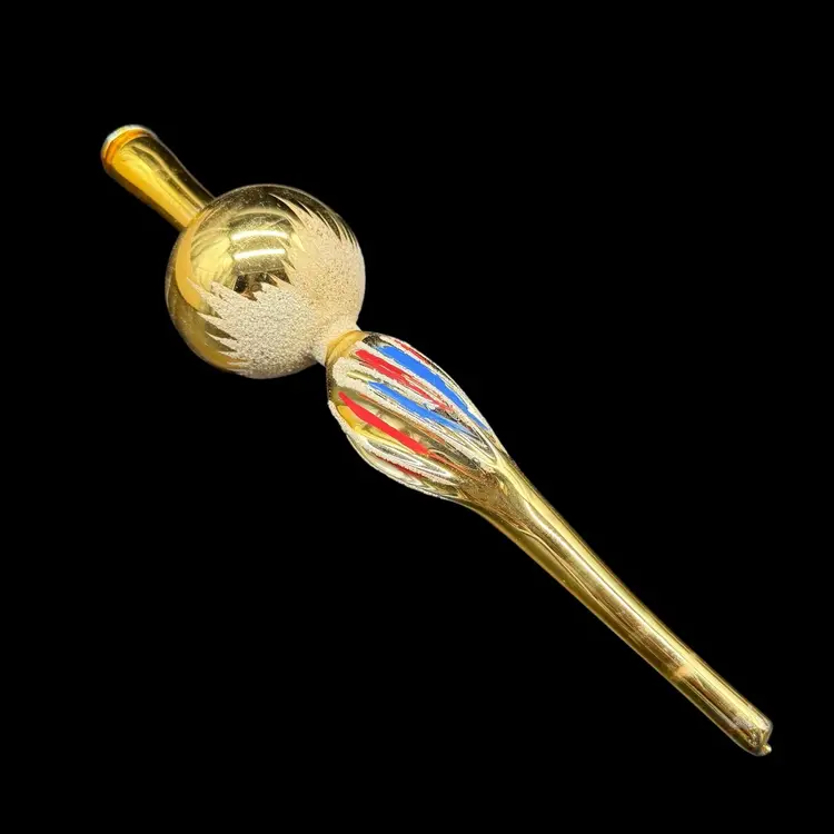 This vintage Christmas tree topper is a gold tone finial ornament from the 1970s, hand-painted in red & blue with silver glitter and featuring an old-world style design. Made of glass and measuring 10 inches in height, this hand-blown ornament is a unique addition to any holiday decor collection. Originating from Romania, this Commodore finial topper adds a touch of nostalgia and charm to your Christmas tree.