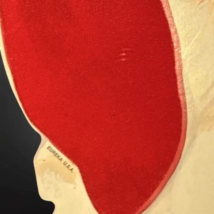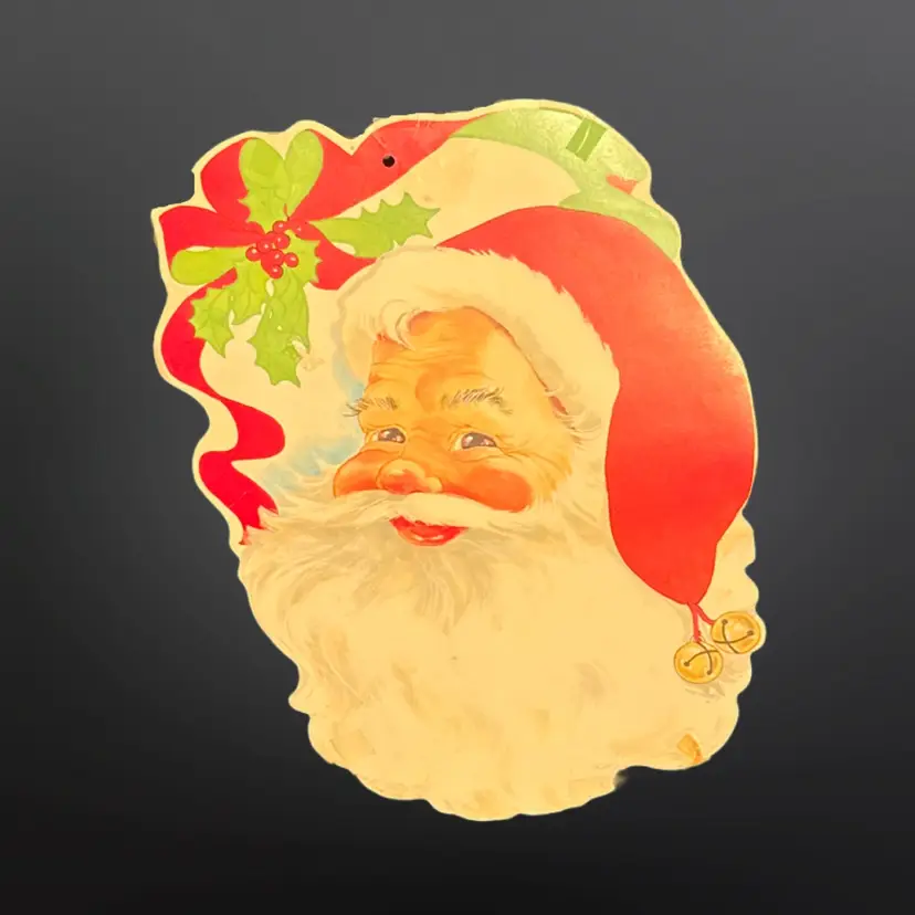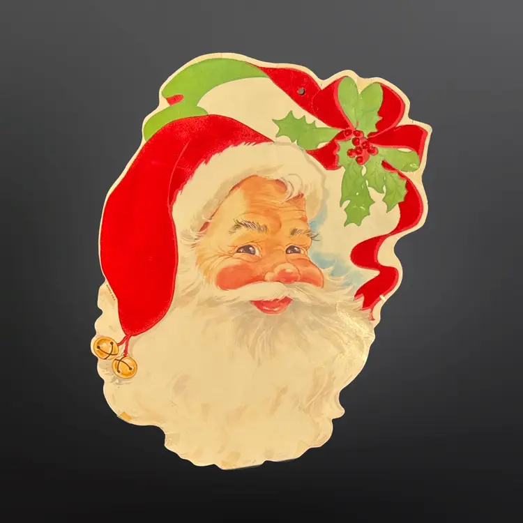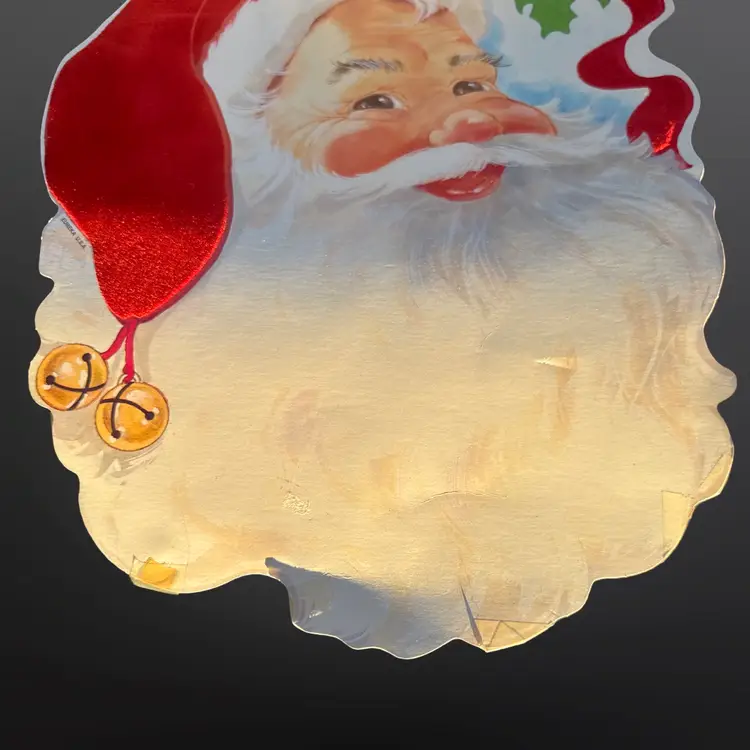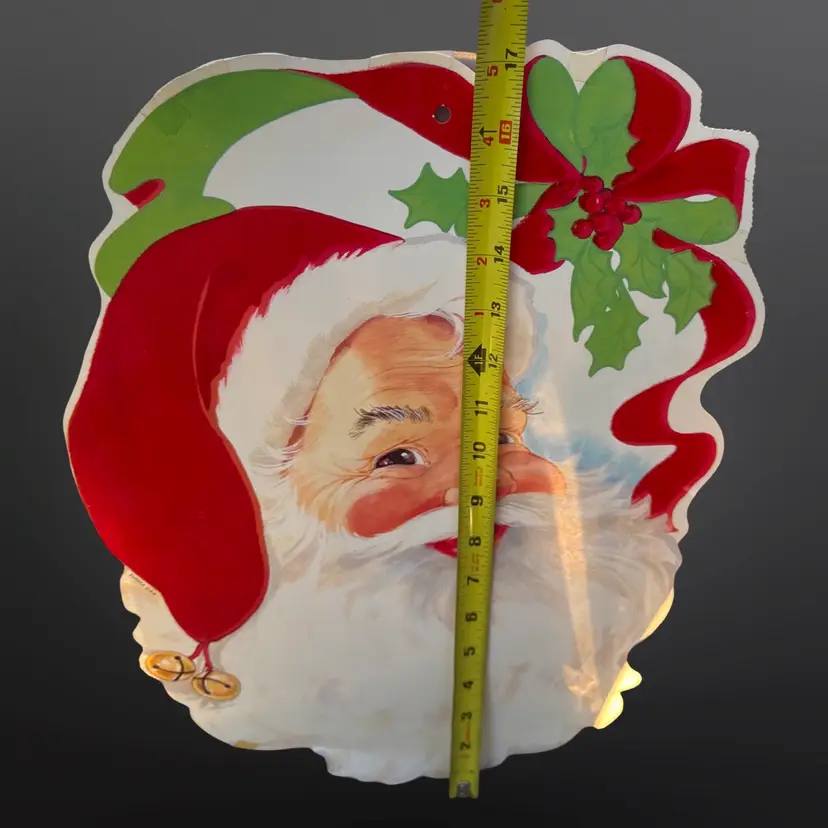 Vintage Christmas Die Cut Santa Wall Decor, double sided with main side red areas flocked. In fair vintage condition; has areas of prior tape use and tape present, no rips in mounting hole, some torn print each side from tape use, small creases present at edges, etc. Measures approximately 17" Tall x 12 1/2" Wide