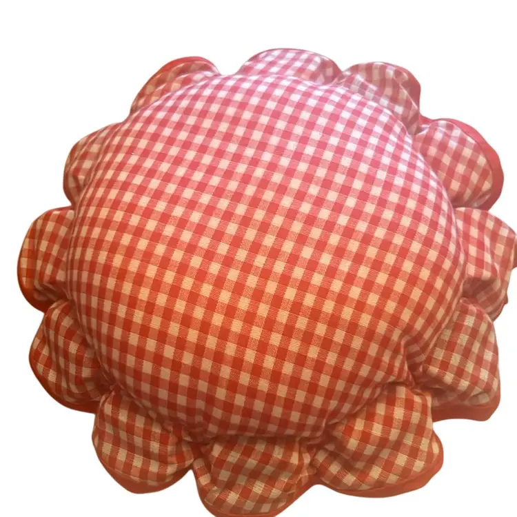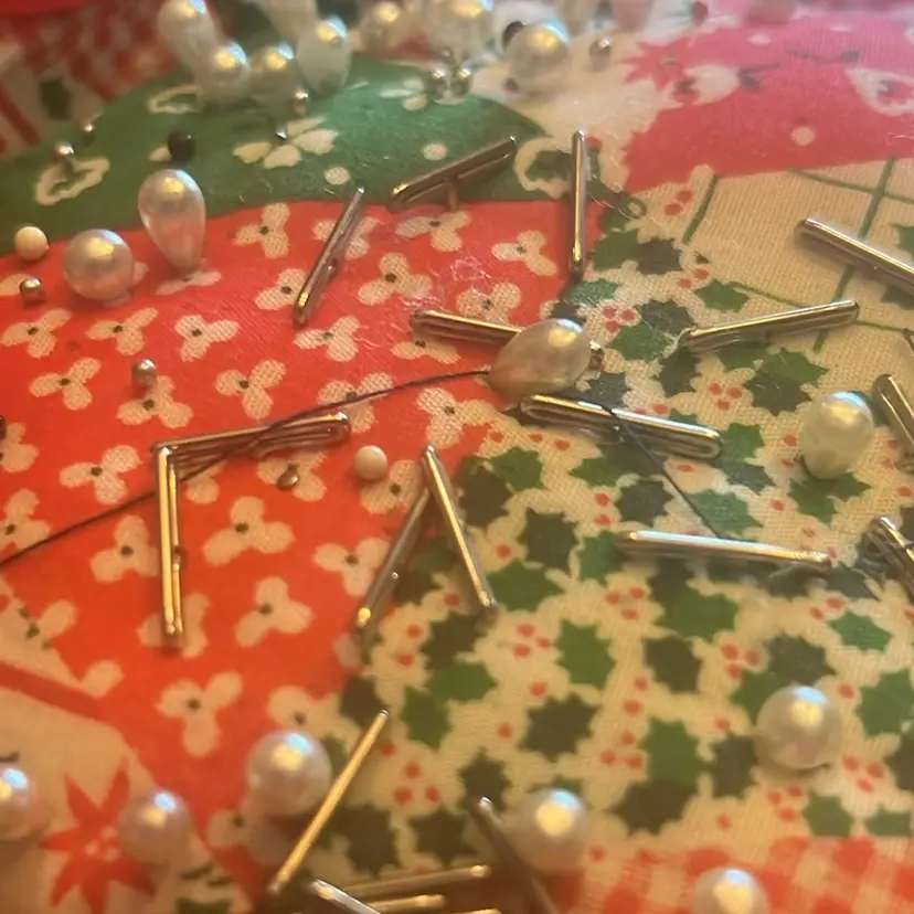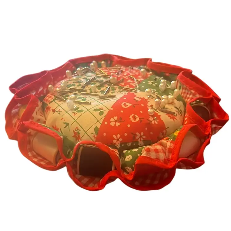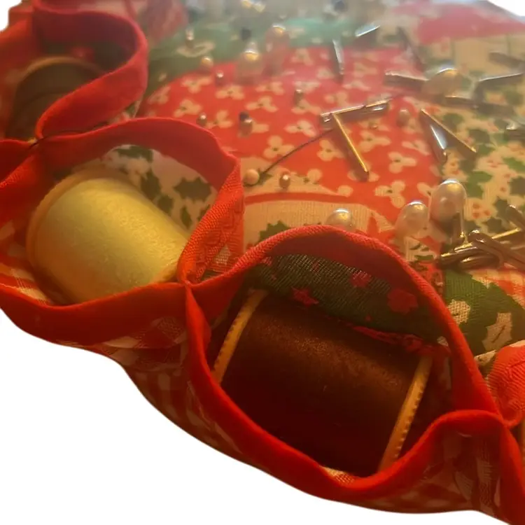 Larger size pin cushion made with holiday fabric and a ruffle edge that holds 12 spools of thread marked USA. No tears or rips.
