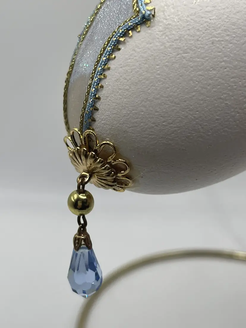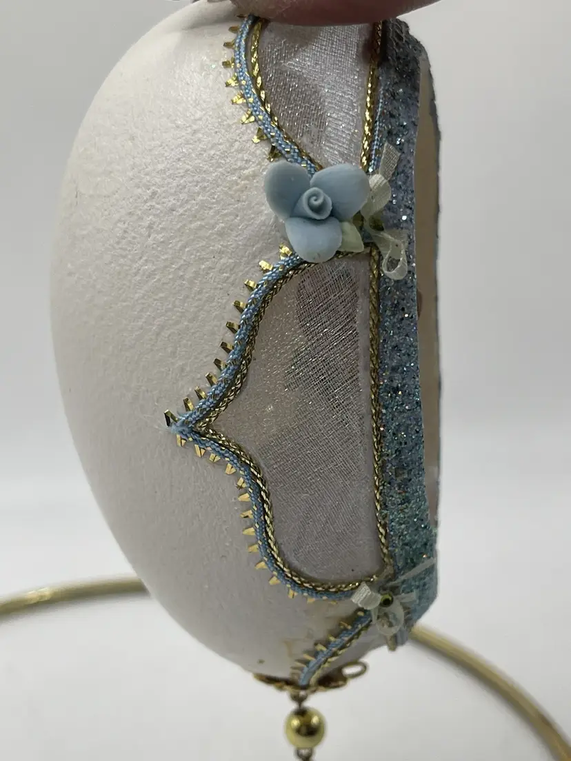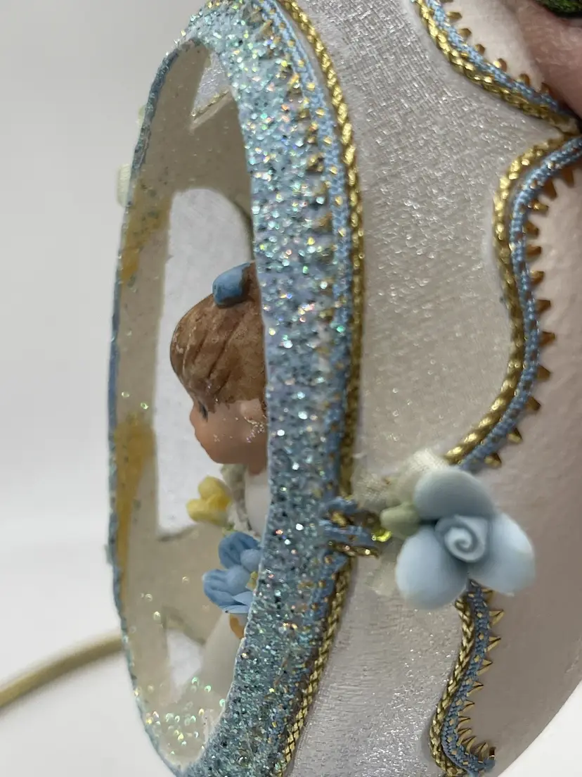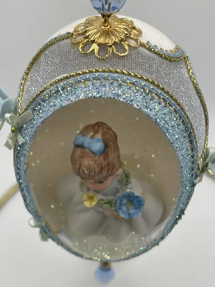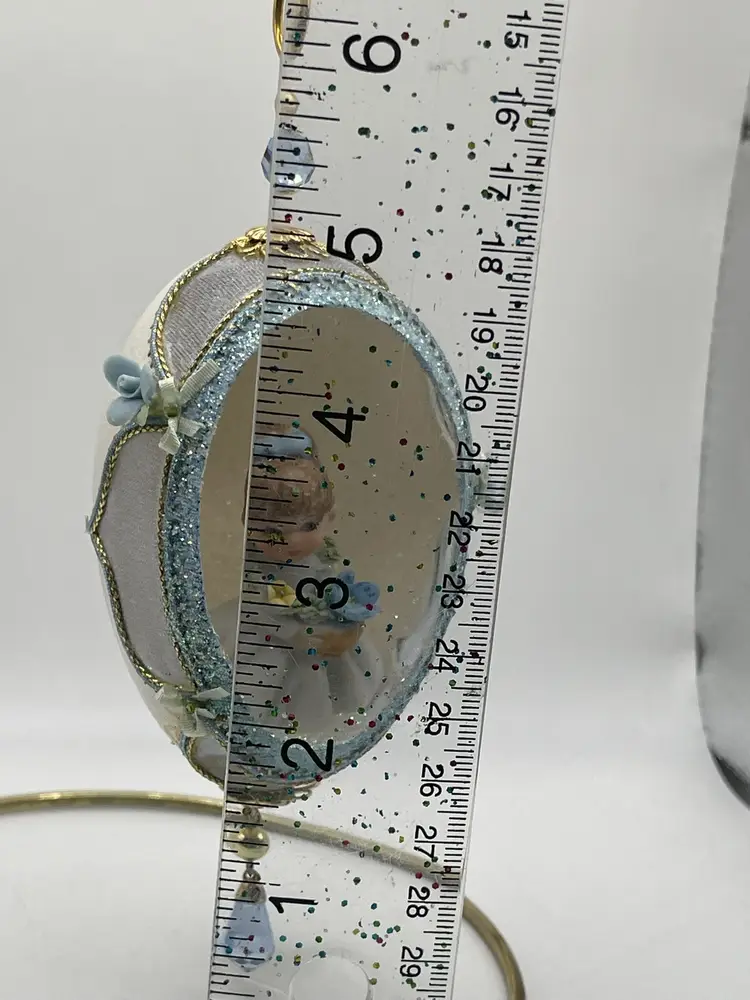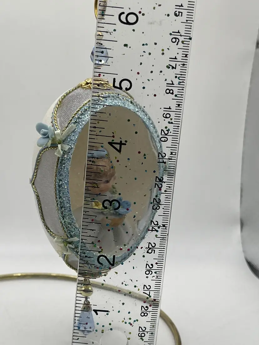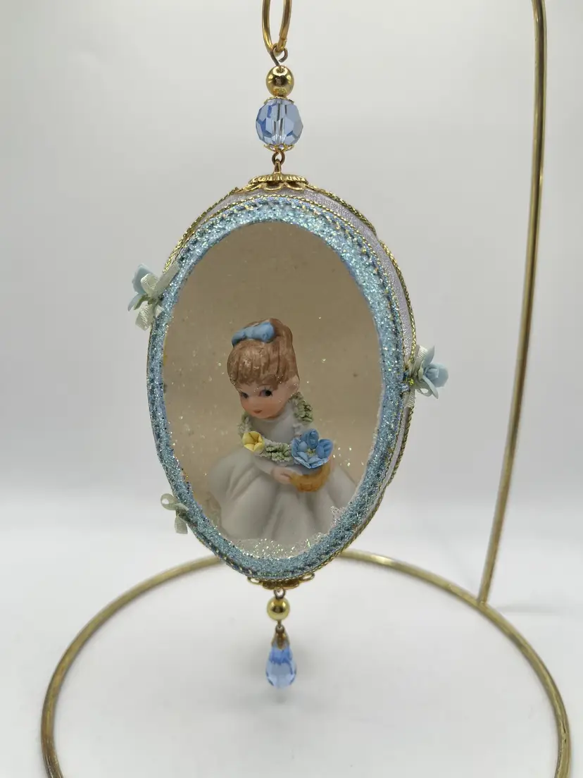 This Estate vintage Christmas ornament collection is a handcrafted masterpiece. The large oval egg shape features a pastel blue girl figurine with intricate glitter, shell, and embellishment details. The egg is part of a diorama set that includes other ornaments, making it a perfect addition to any collection.