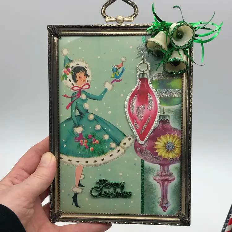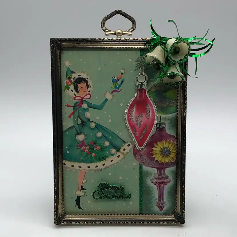 Two 50’s Christmas cards together in a classic frame with vintage trims. OMG. She is so retro cool. Thanks for looking.