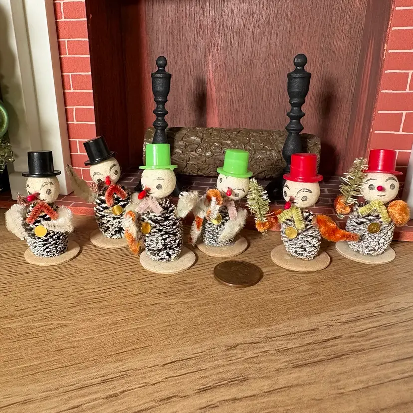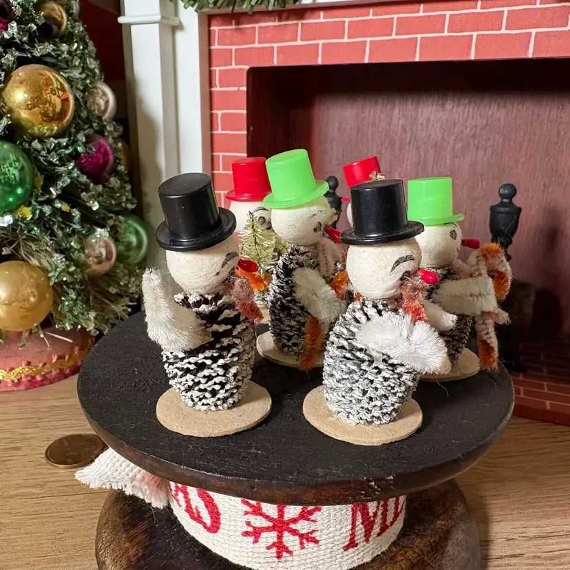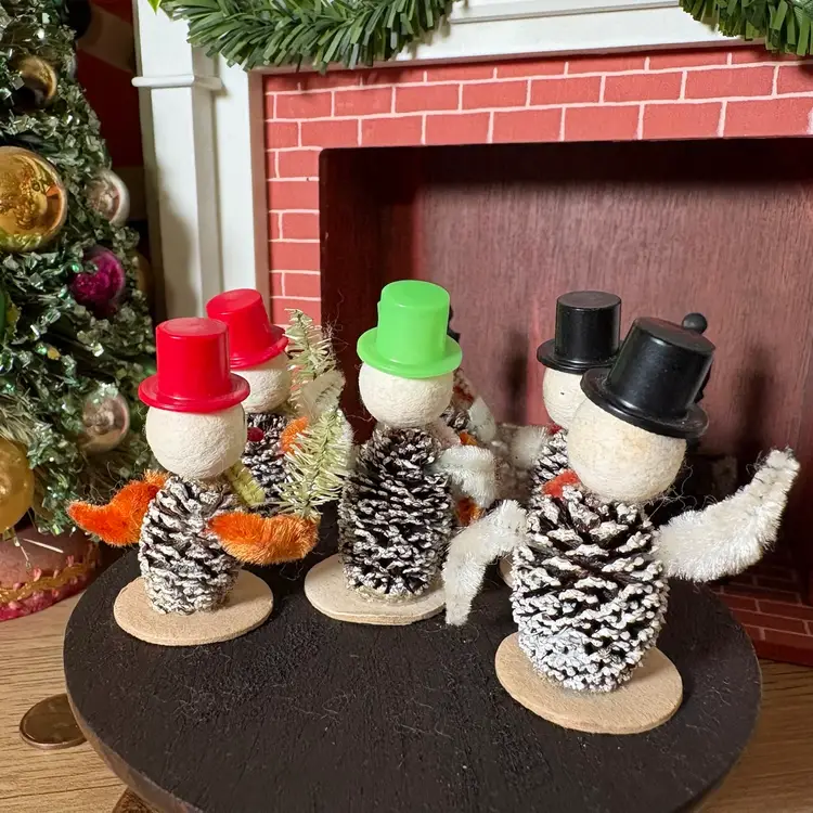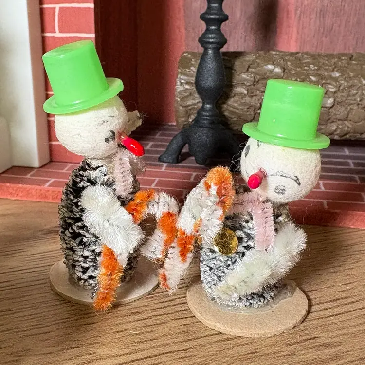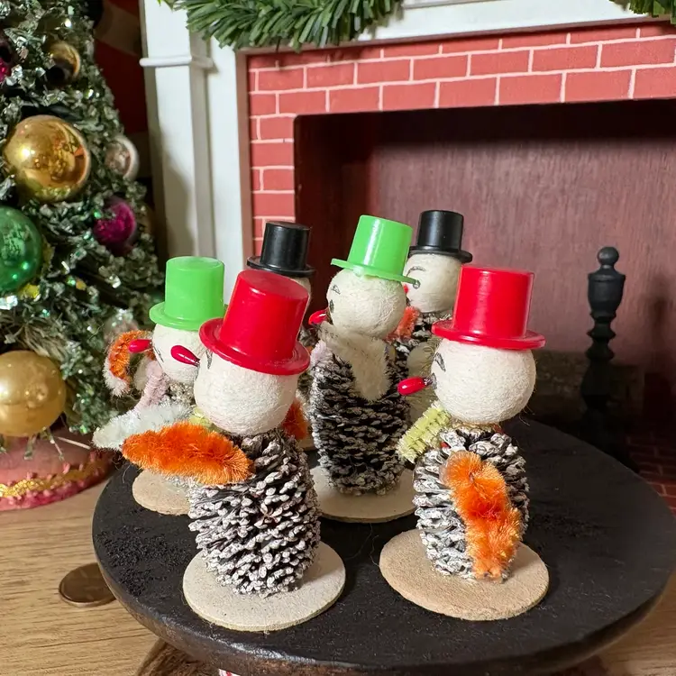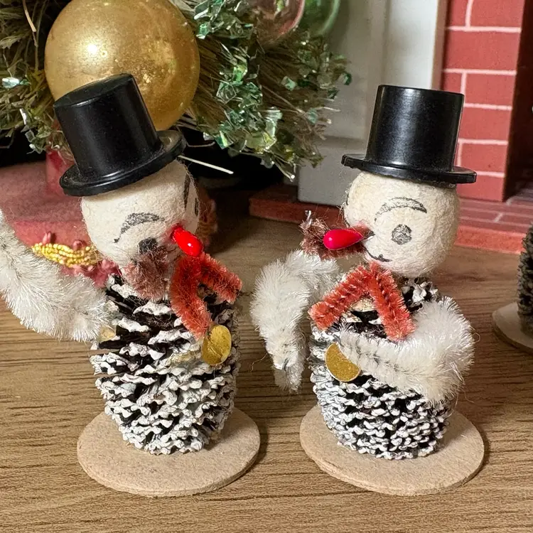 Vintage Christmas Miniature Putz Pinecone Snowmen in Top Hats Japan