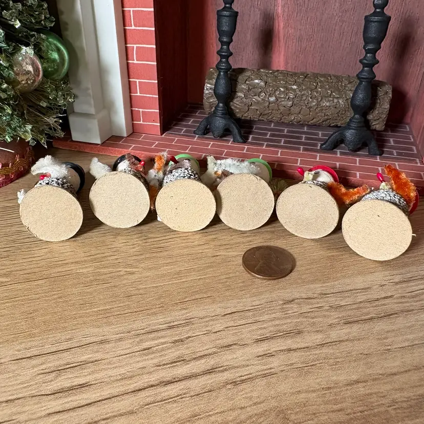 Set of 6 mini snowman guys. These tiny guys are awesome! Black hat snowmen are smoking, green hat snowmen are holding candy canes and red hat snowmen are holding trees.