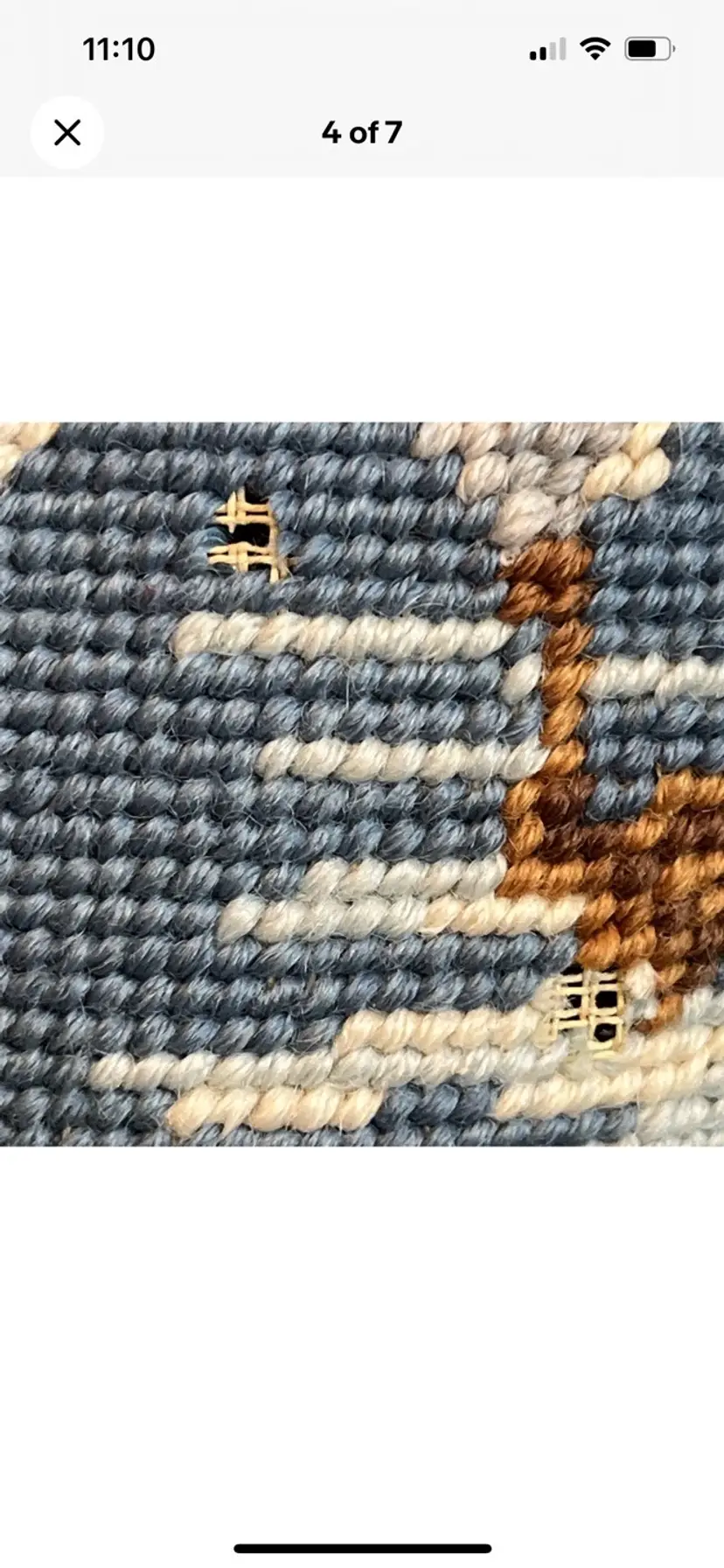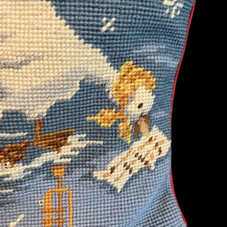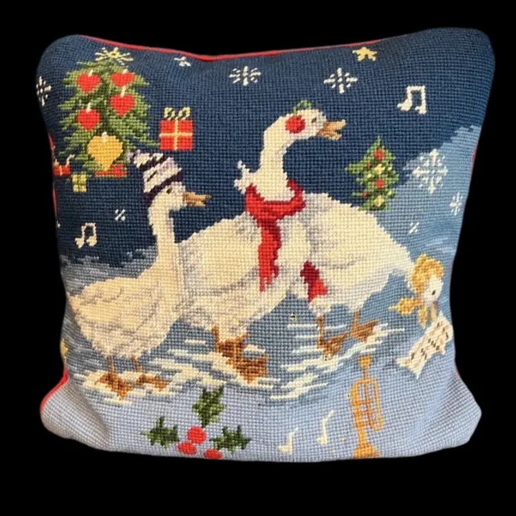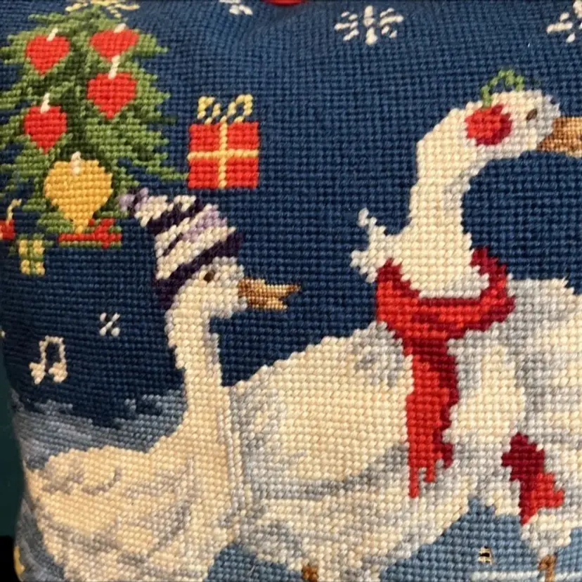 This cute wool needlepoint Christmas pillow has singing geese and a background full of Christmas elements. It was rescued at an estate sale where they had just pulled them out of the attic! It does have a few mouth bites on it so if you are crafty you can stitch it or color the small areas up in no time! 13.5” x 13.5”