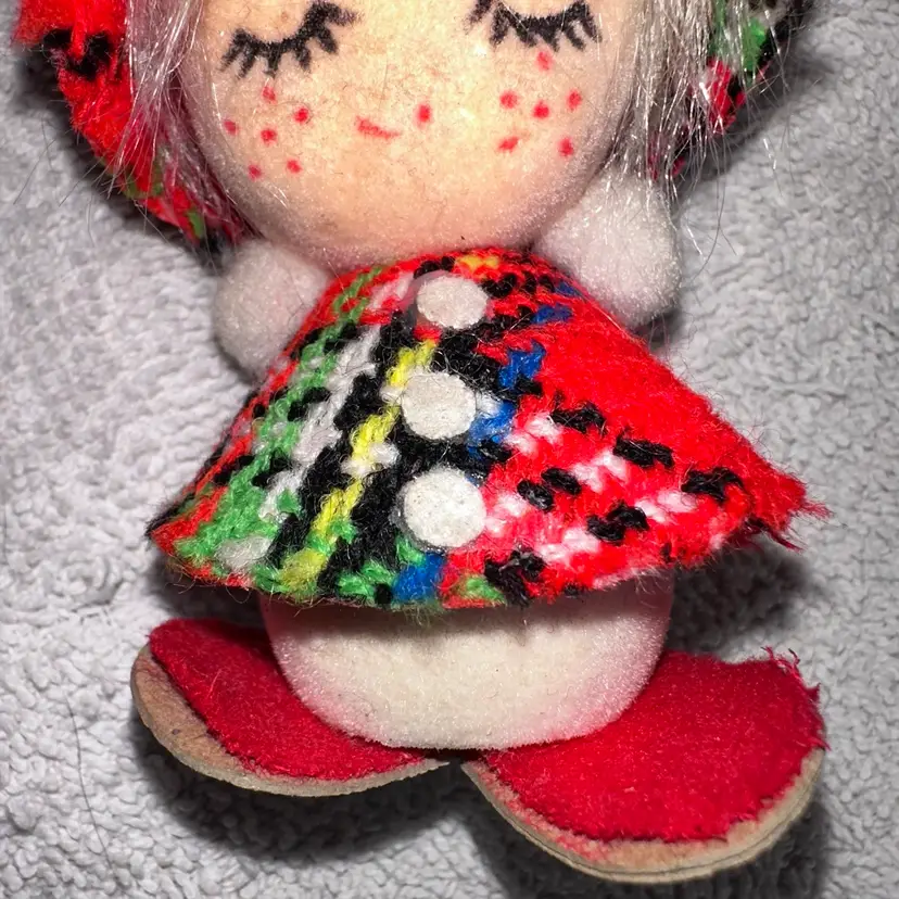 Vintage Christmas Ornament Holiday Child Girl Flocked Face & Body Made in Japan. Overall Good Condition For Age. Face And Body Have Minor Discoloration But Flick Is All Intact And Not Missing. Adorable Cloth Dress And Hat Rim. Smoke Free Home. #vintagechristmas #flocked #vintage #mcm #retro