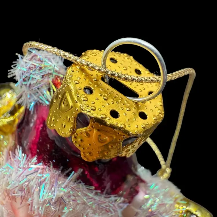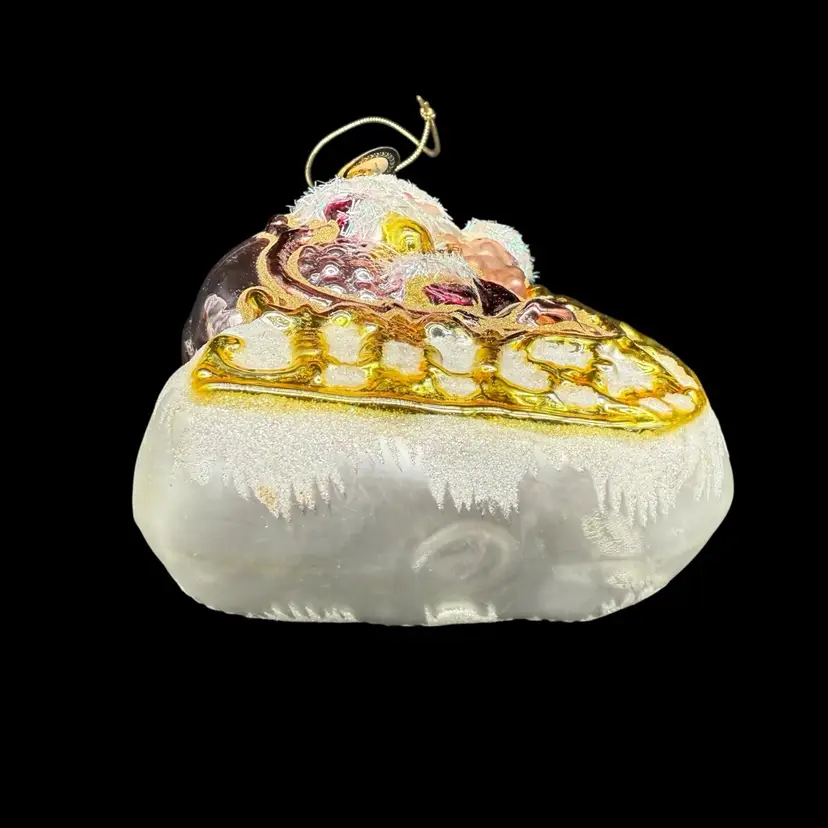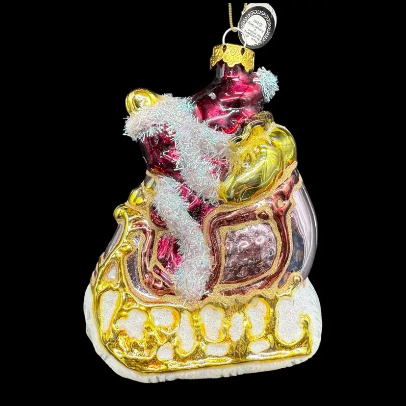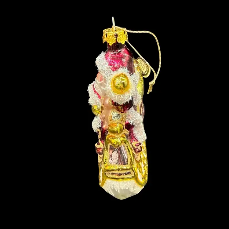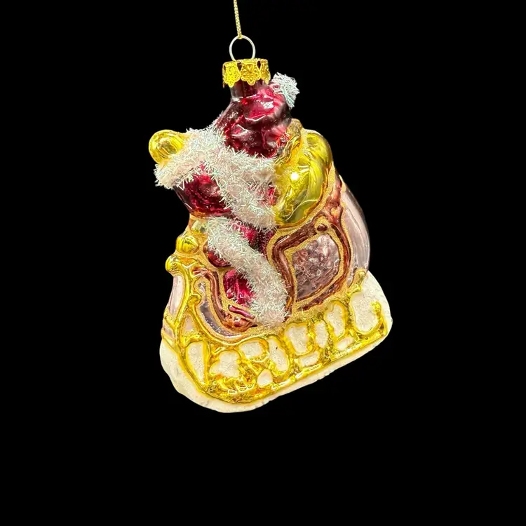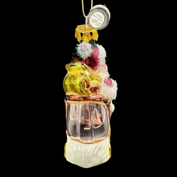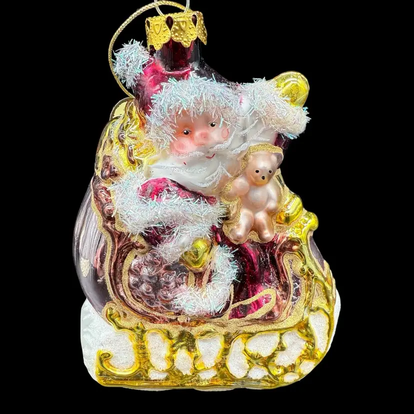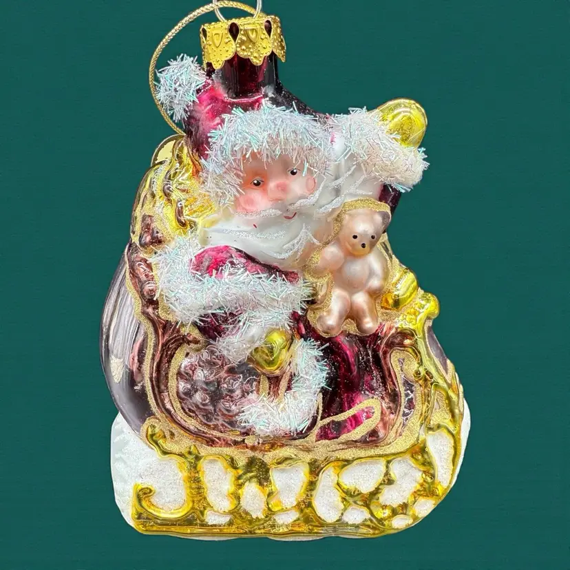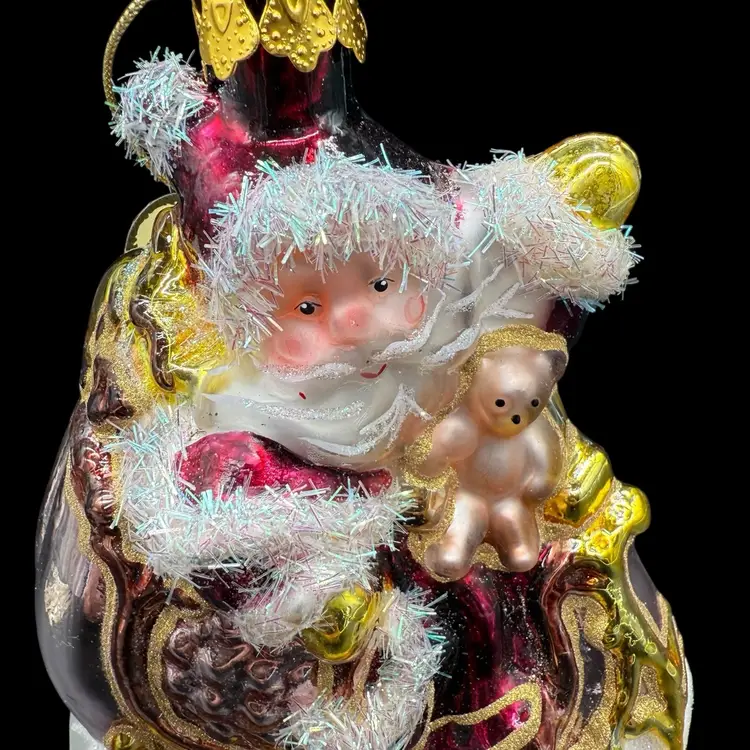 This vintage Christmas ornament features Santa Claus in his sleigh, with a teddy bear included for extra charm. Made of hand-blown glass with tinsel accents, this collectible ornament is perfect for adding a touch of nostalgia to your holiday decor. The multicolor design and hanging feature make it a festive and decorative addition to any Christmas tree or ornament collection. Crafted in China, this unique and charming ornament captures the essence of the holiday season.