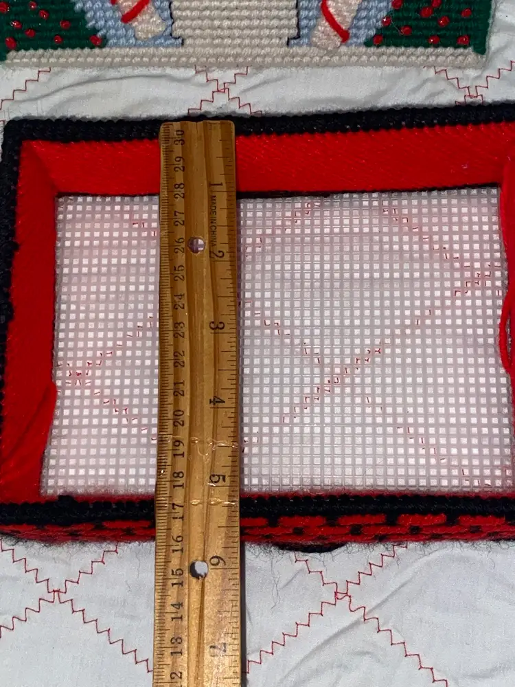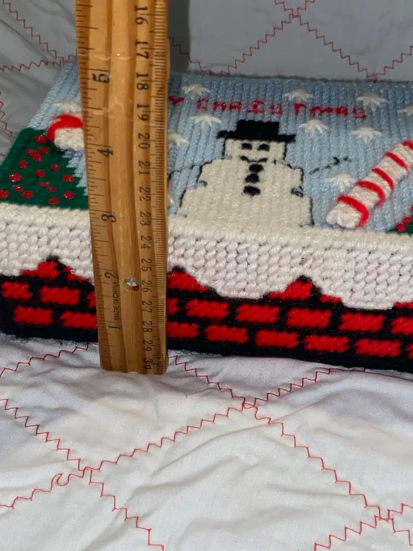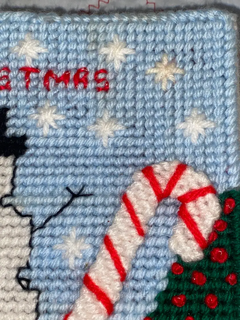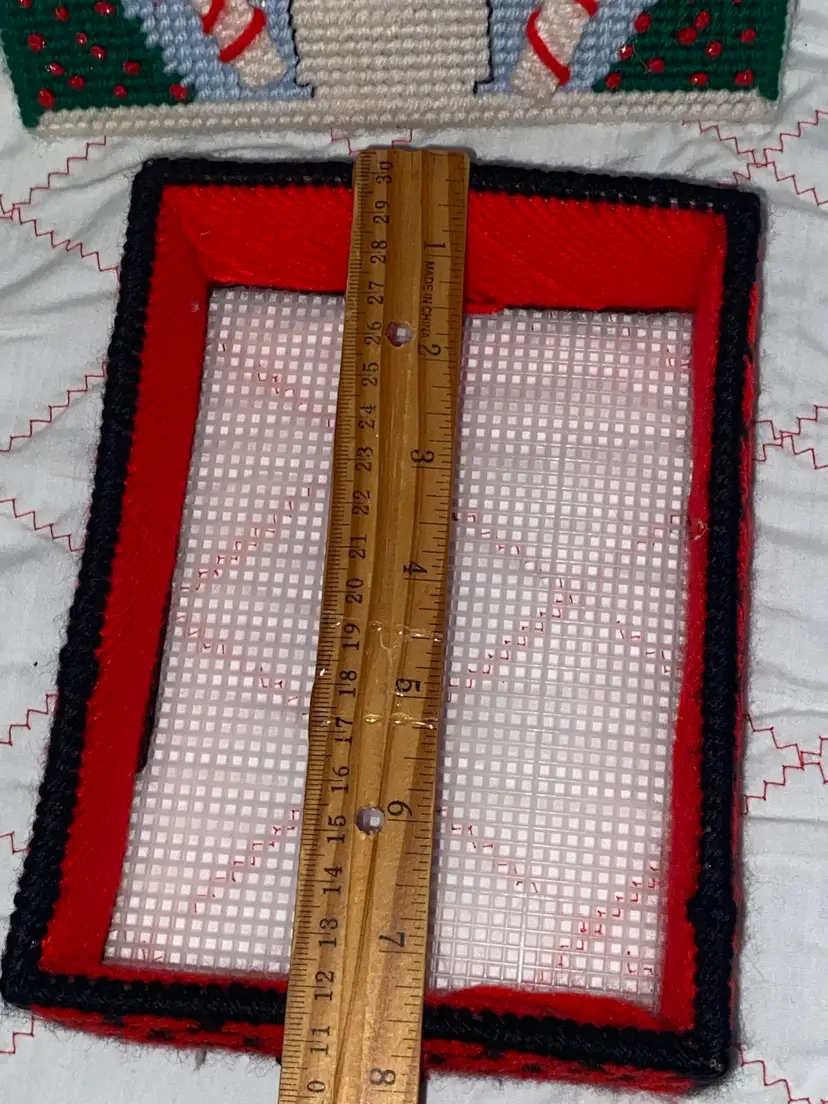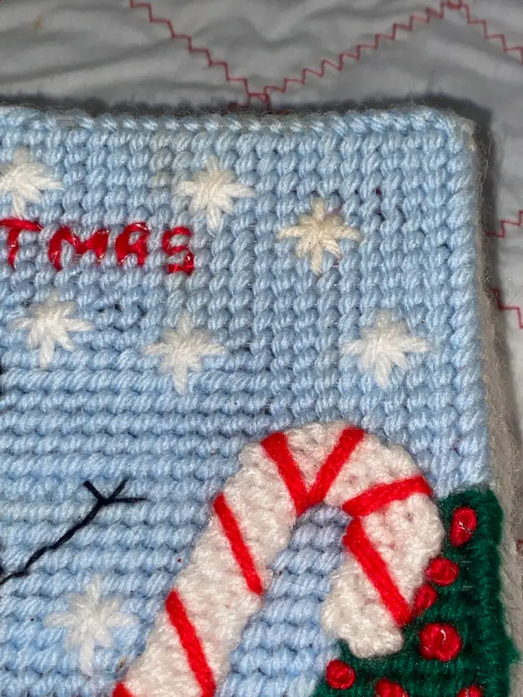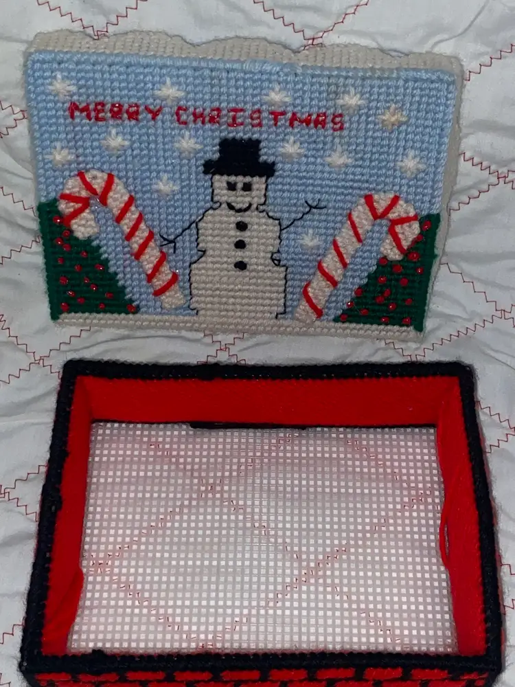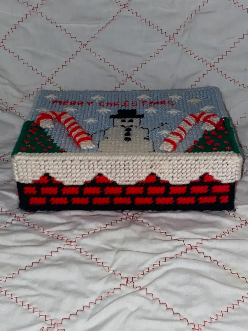 An adorable vintage plastic canvas Merry Christmas Box. It does have a slight stain on one of the snowflakes as pictured. I wanted to try a Tide pen but I was afraid to mess it up.