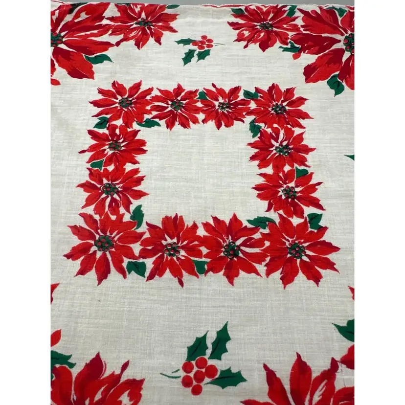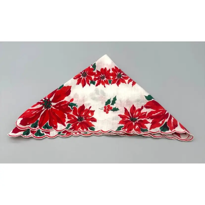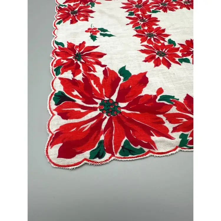 This vintage handkerchief showcases a festive poinsettia motif in brilliant red and green. Its scalloped edges and soft cotton fabric evoke timeless holiday charm.