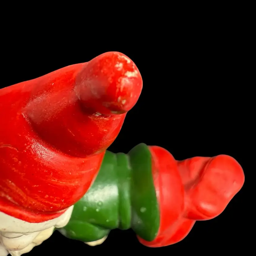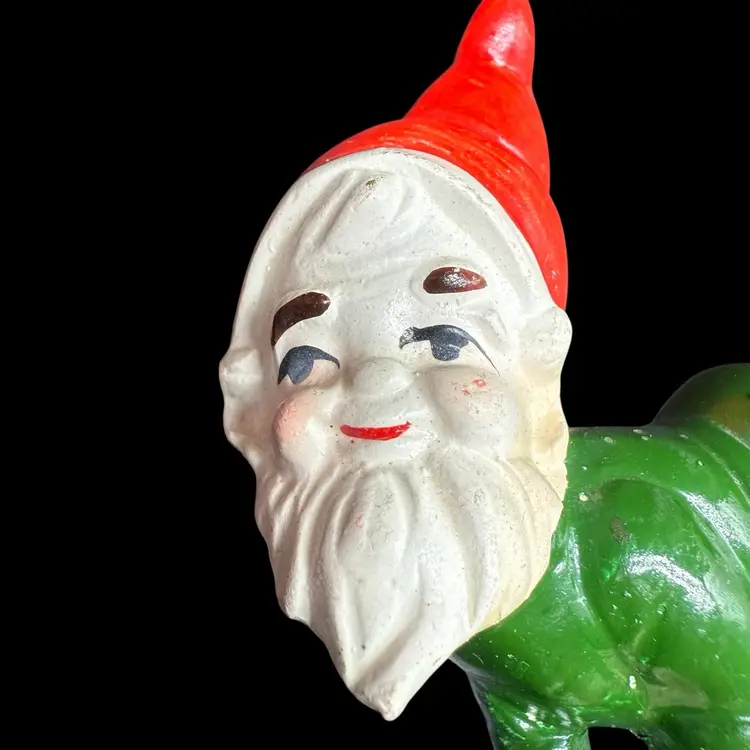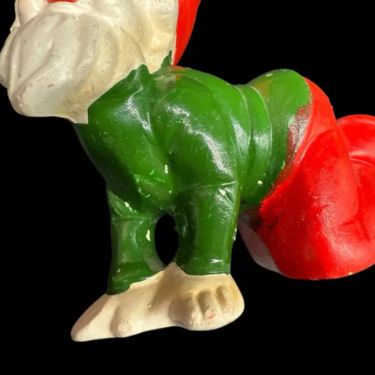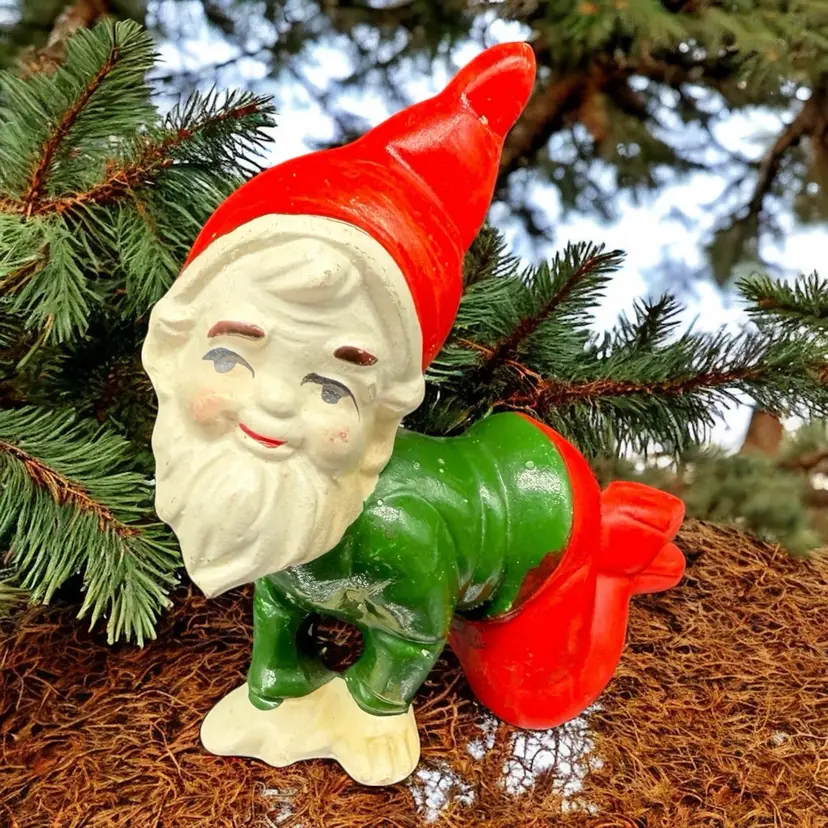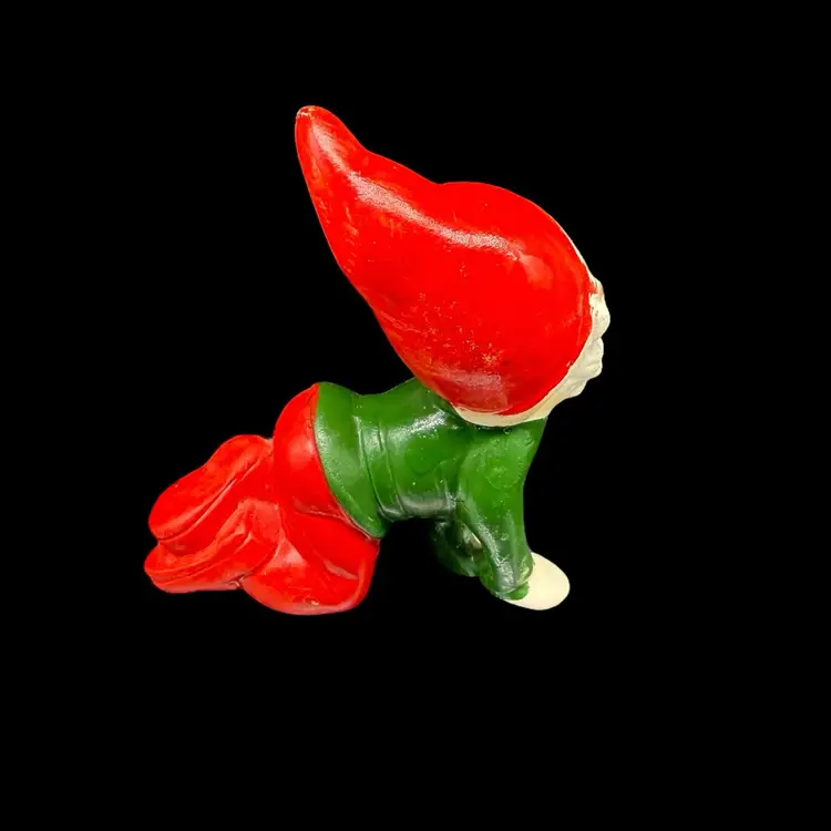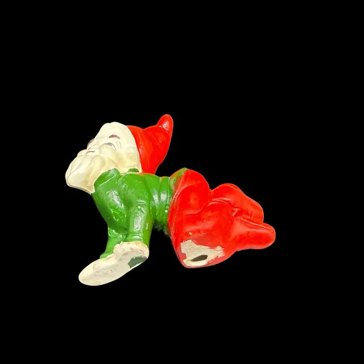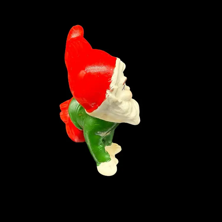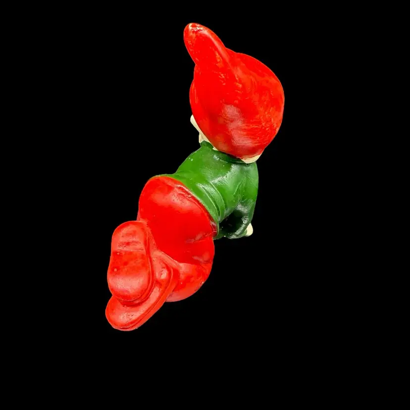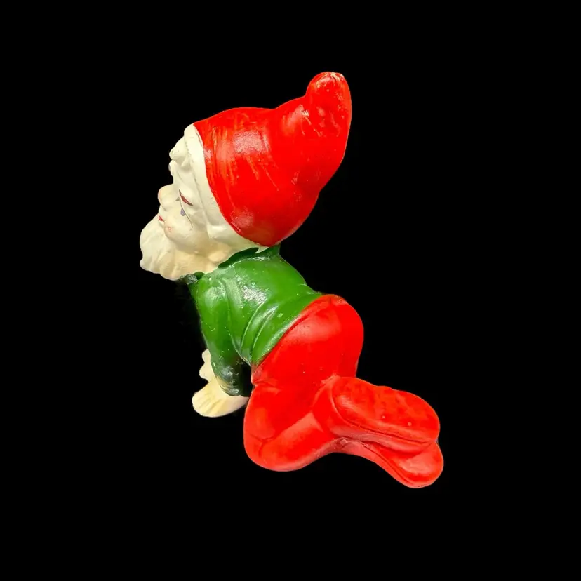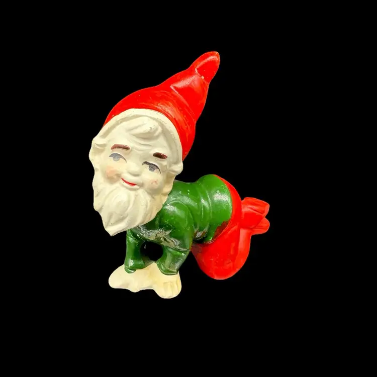 This vintage Christmas Gnome is a small chalkware figurine featuring a gnome character in a playful crawling pose. With a colorful hand painted finish and a 3D effect, this collectible piece is a unique addition to any holiday decor collection. The figurine is perfect for those who appreciate kitschy and fairy tale-themed items. Its charming design and hand-painted details make it a delightful and nostalgic addition to any home during the holiday season.
