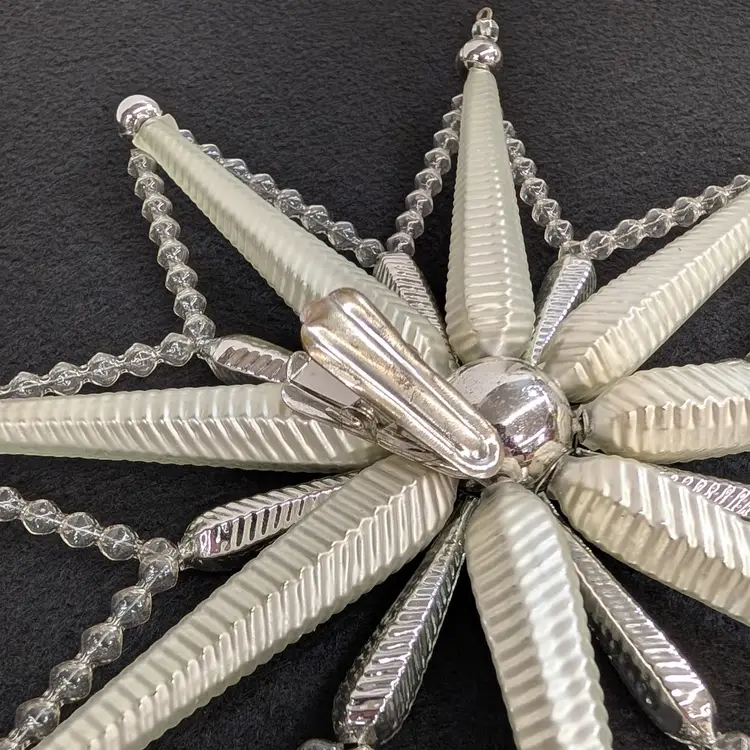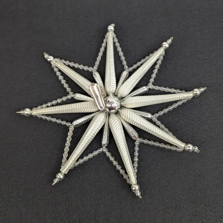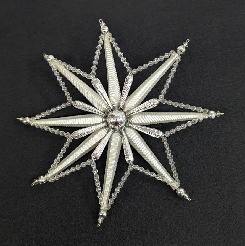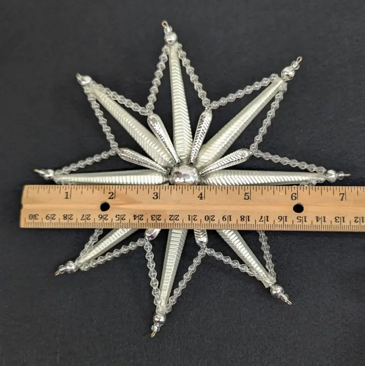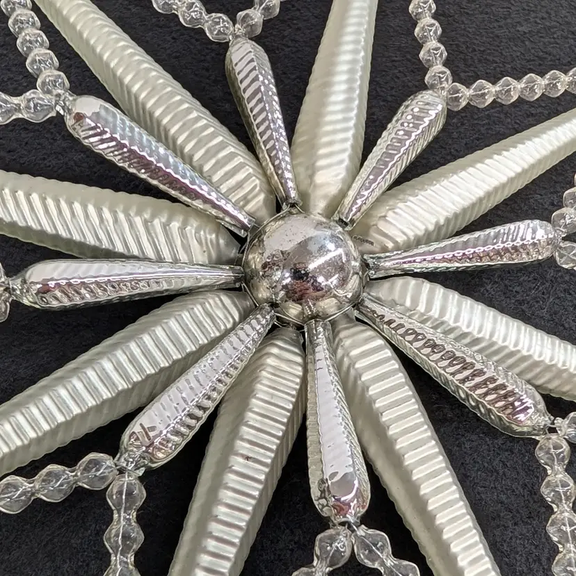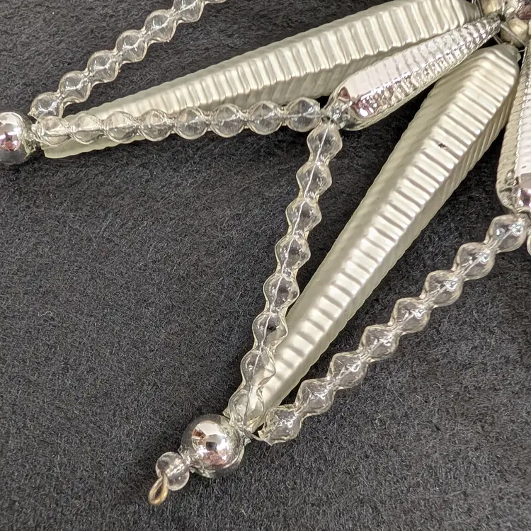 Beautiful, glass bead tree topper with multiple shaped beads that are silver, clear and opal white. It has a clip on the back for attaching to the tree. It is in nice, vintage condition with a little spotting to the middle mercury glass bead (see pictures). Comes in its original box. Measurements ~ 7"