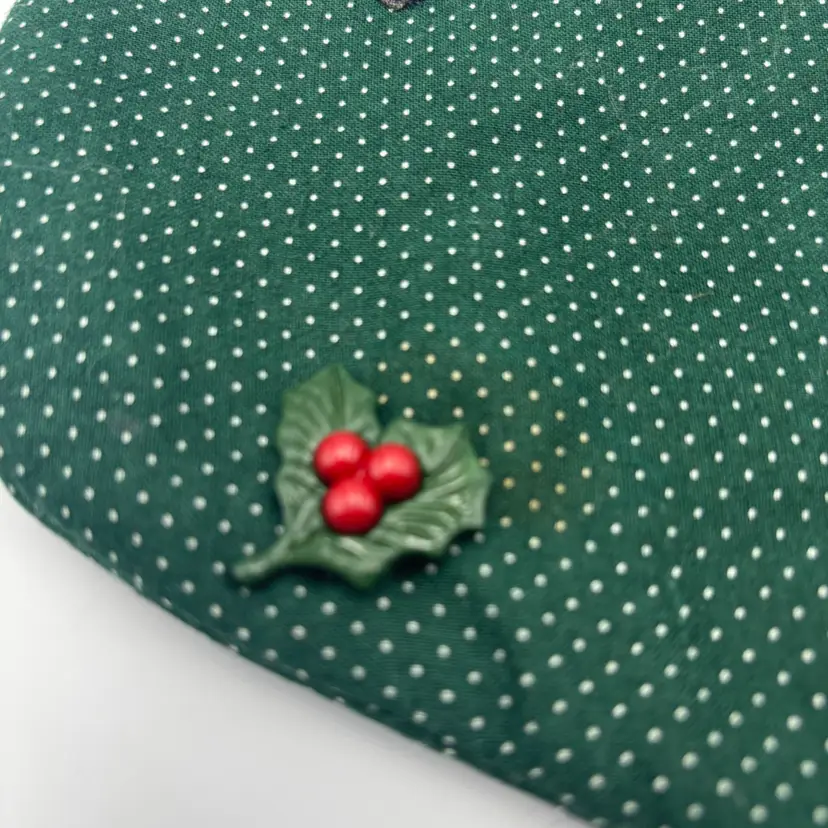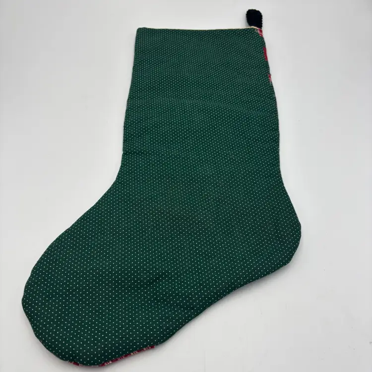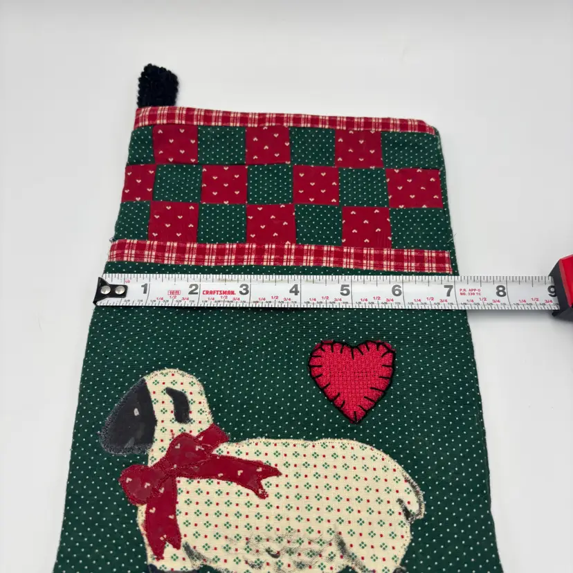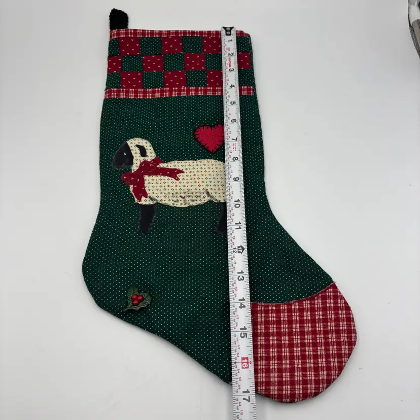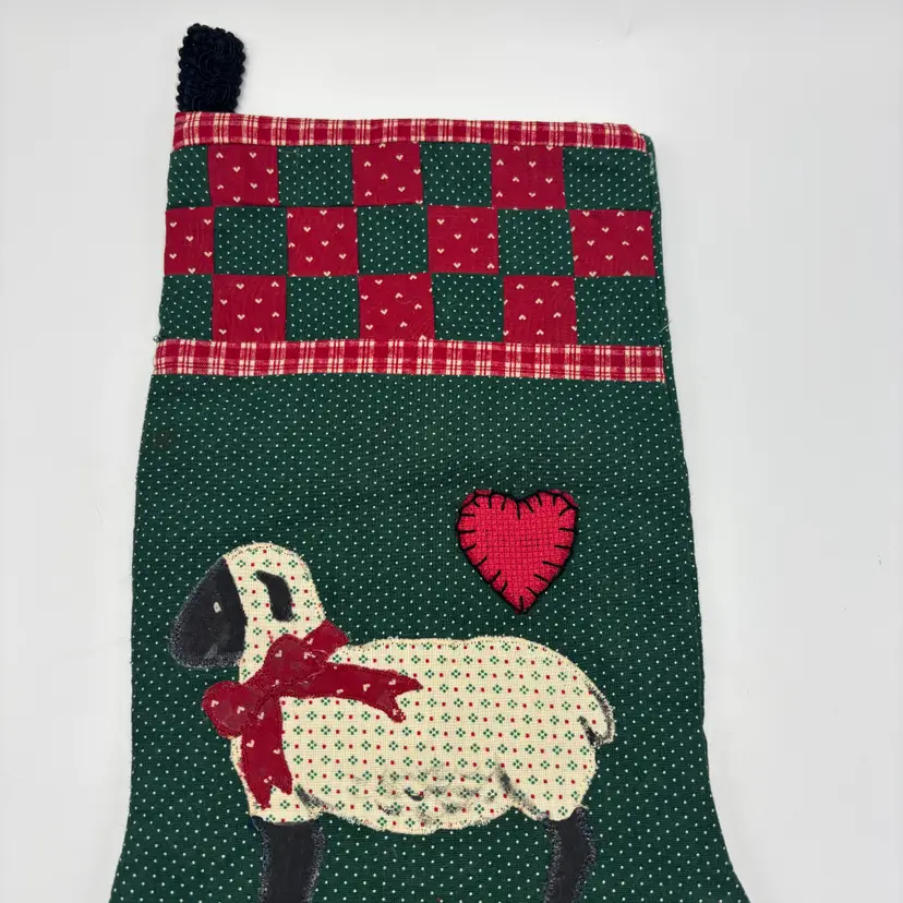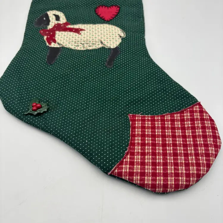Features: handmade, quilted stocking with sheep with white body and black legs with a red bow applique and a heart applique as well. The background is repeating dots in green background.
