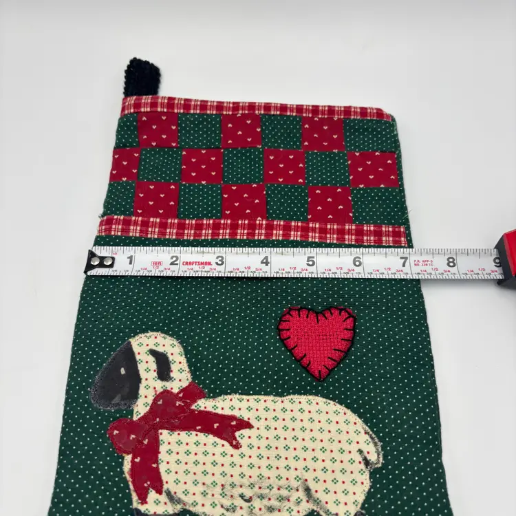 For sale is a Vintage Christmas Stocking Quilted Patchwork White Sheep Heart Applique
