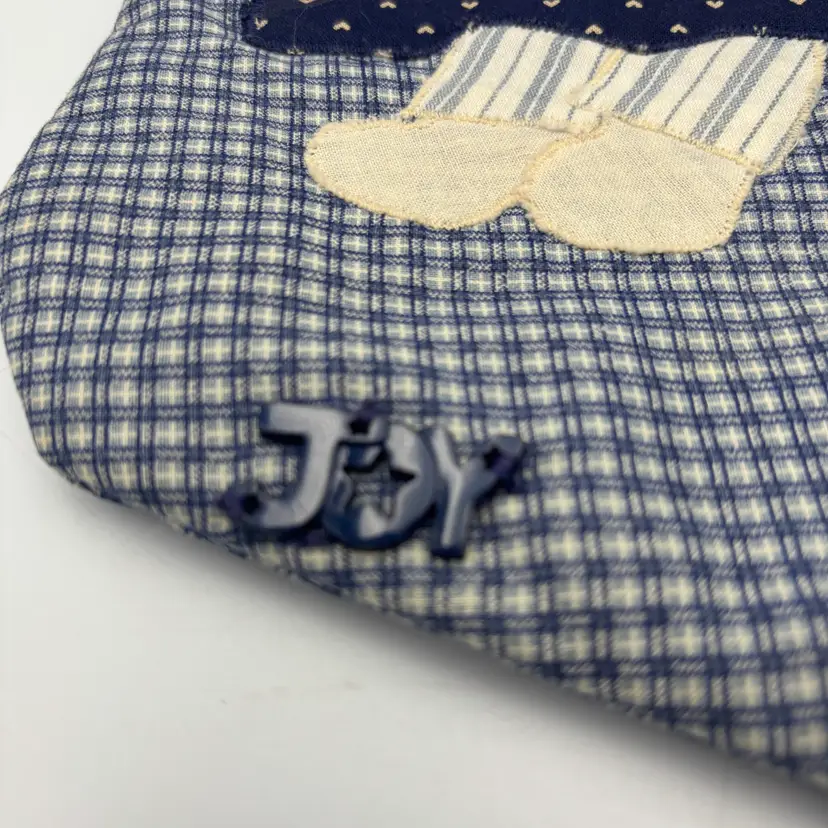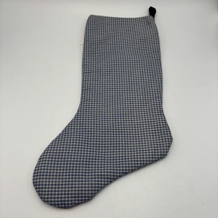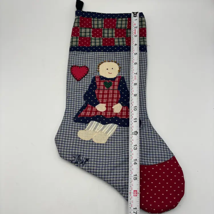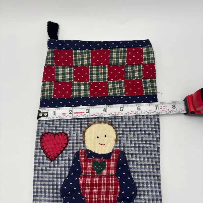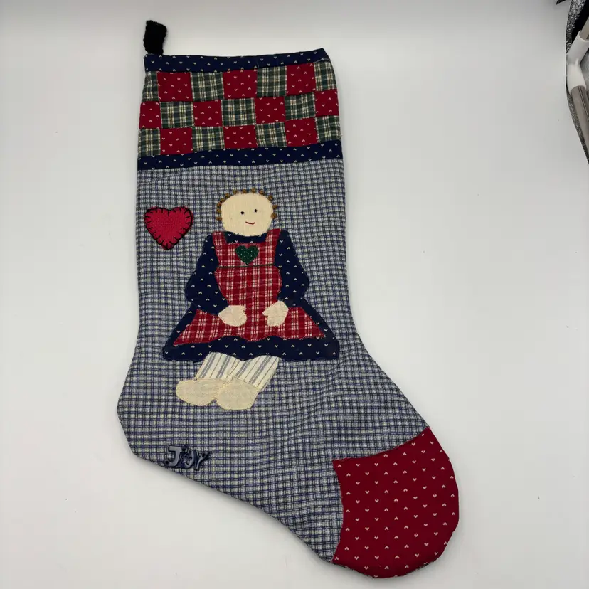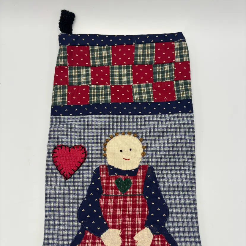 Features: handmade, quilted stocking with doll applique and a heart applique as well. The background is repeating checkered blue background.