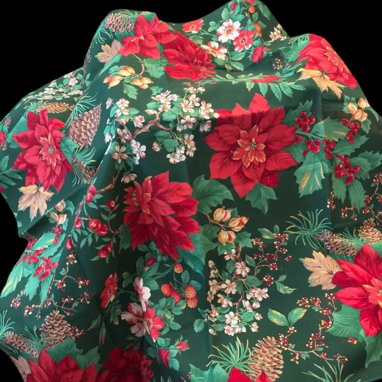 Festive square Christmas table covering featuring a rich green background adorned with bold red poinsettias, pinecones, holly berries, and floral accents. Perfect for adding holiday cheer to your kitchen or dining table. • Size: 34” x 34” (square) • Material: Cotton or cotton-blend fabric (lightweight, washable) • Pattern: Poinsettias, pinecones, berries, and blossoms in bright holiday colors • Condition: Very good vintage condition; no major flaws noted