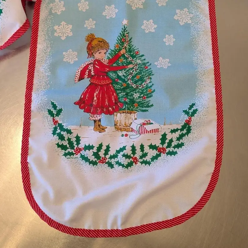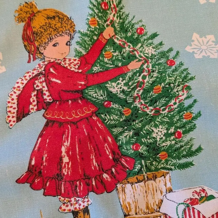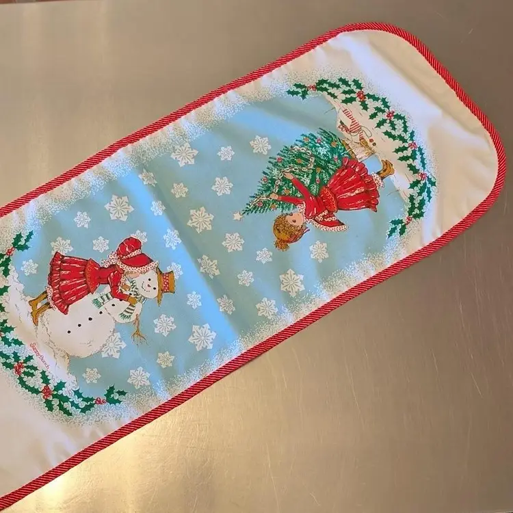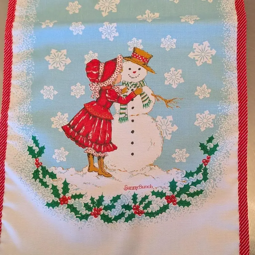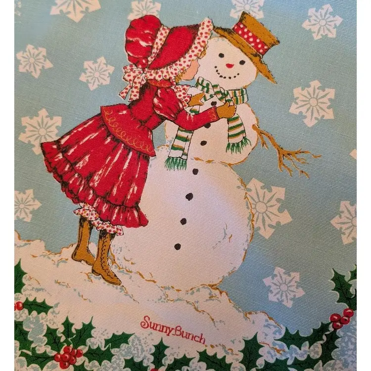 Fun, Christmas runner that has Sunny Bunch girl making a snowman and decorating a Christmas tree on both ends. In nice, used condition with a tiny stain or two.
