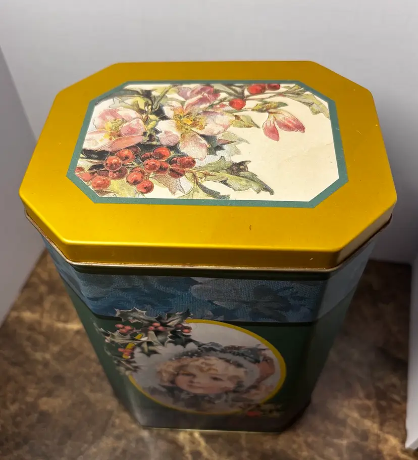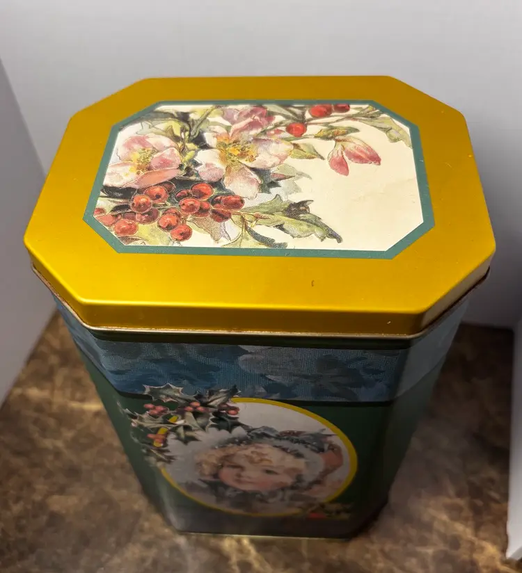 Victorian Style Christmas Tin Can with holly berry on lid. Good condition inside and out. Grab for the holidays.