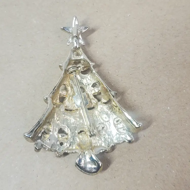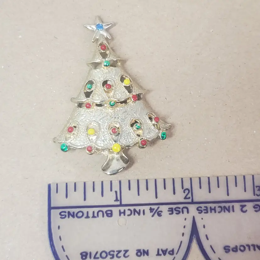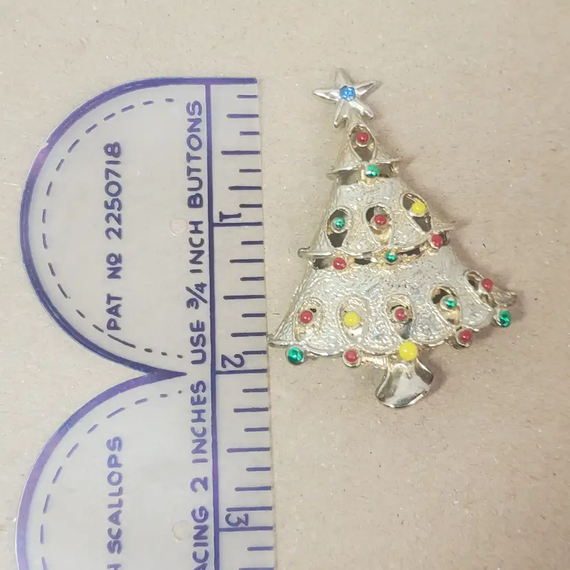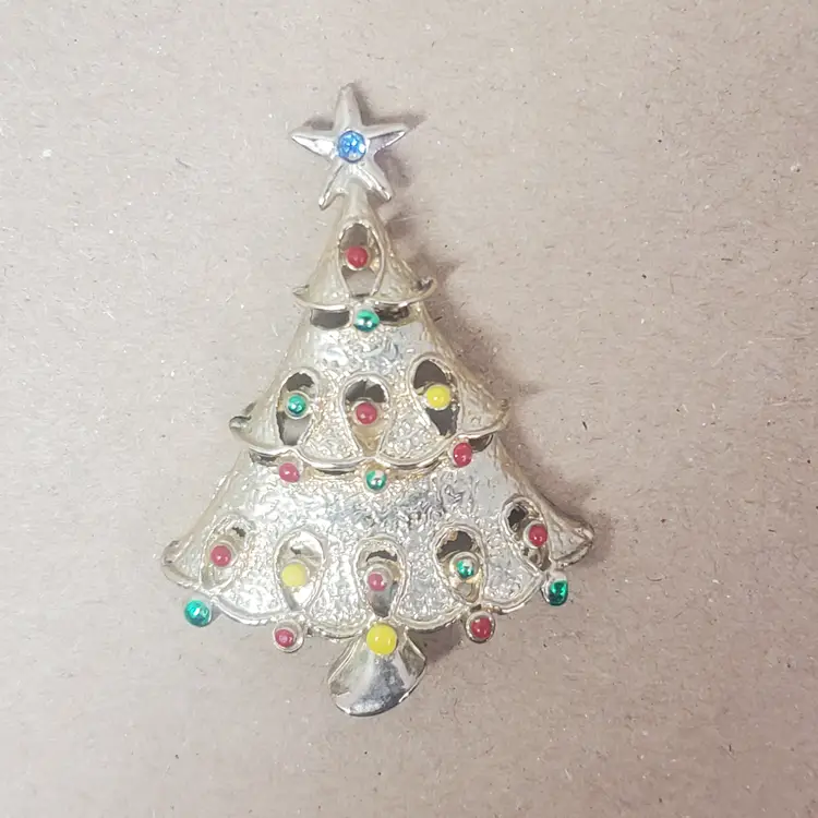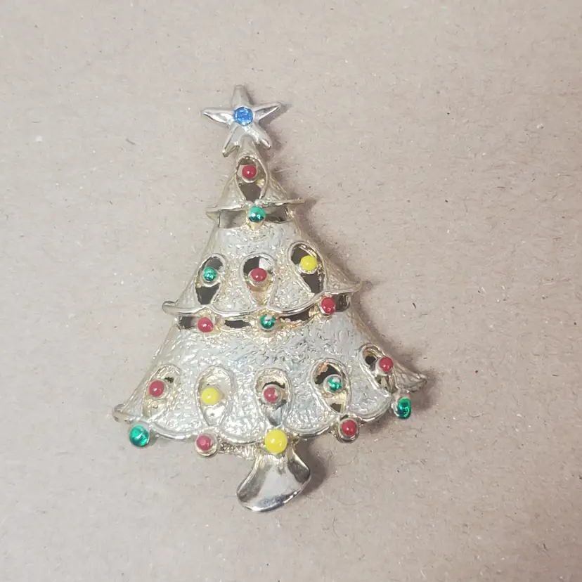 Celebrate the season in style with this festive vintage Christmas tree brooch. Crafted in a radiant gold-tone metal, the tree features elegant loops and textured detailing that evoke classic holiday charm. Adorned with vibrant red, green, and yellow bead ornaments, it’s topped with a silver star accented by a striking blue gem for a touch of sparkle. Perfect for collectors or anyone looking to add a cheerful accent to their winter wardrobe. Ideal for holiday parties, gift exchanges, or as a nostalgic keepsake.