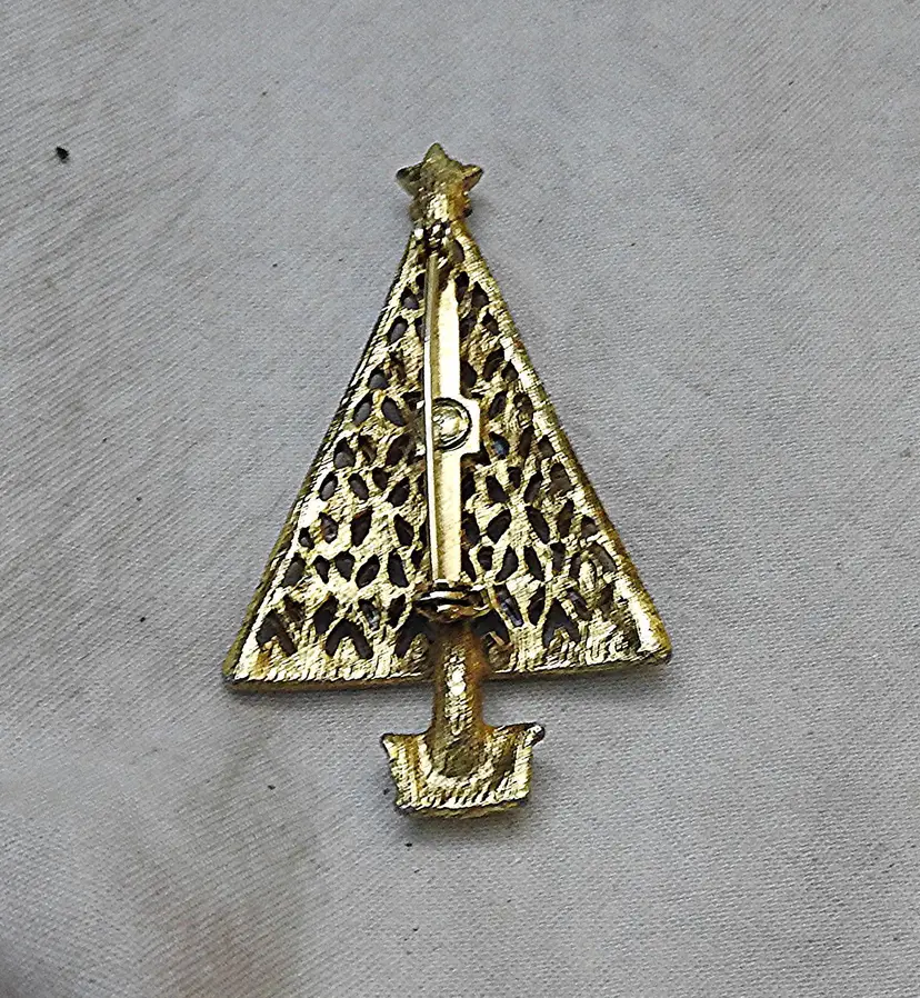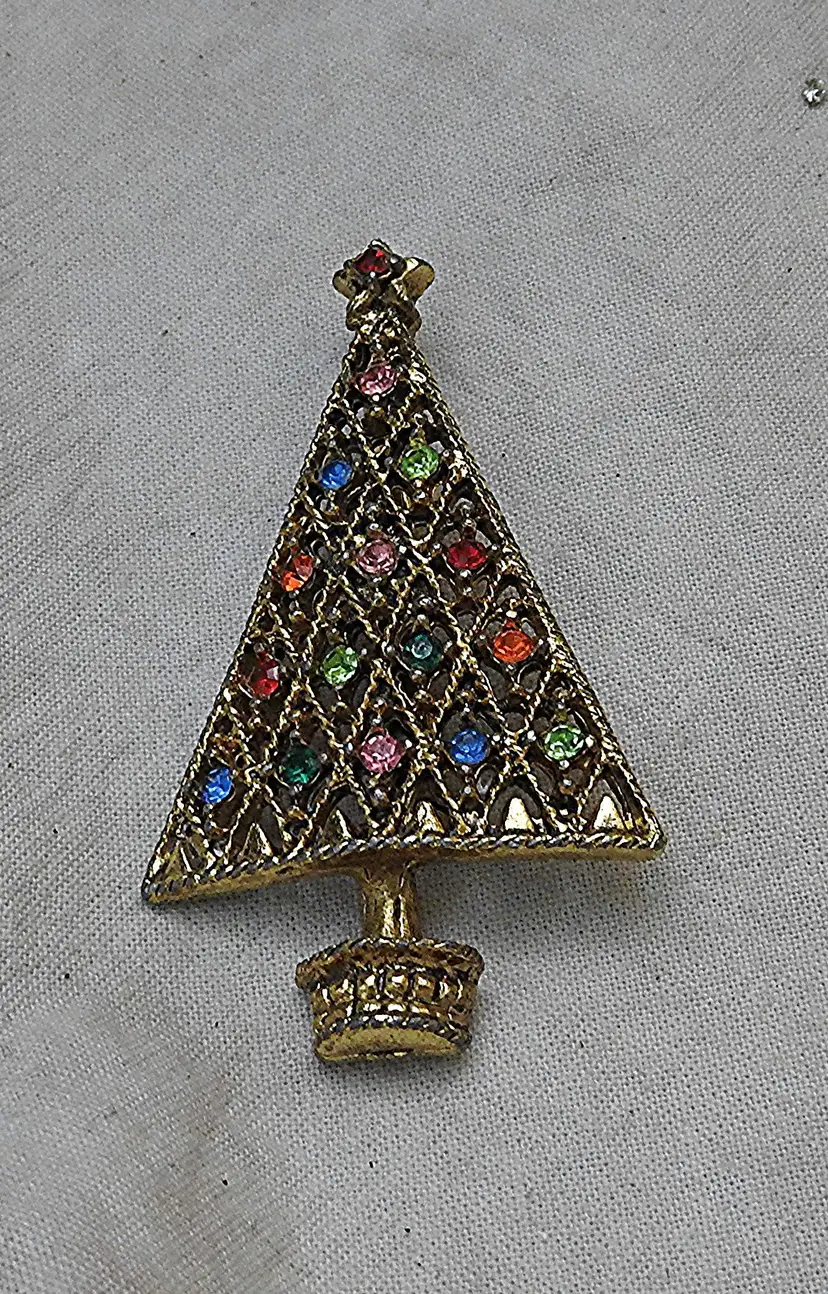 Set in goldtone, this tree has multi colored rhinestones Measures 2 1/4" x 1 1/4" Condition is excellent, working closure, no missing rhinestones Unsigned