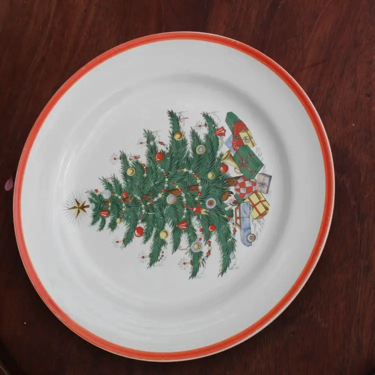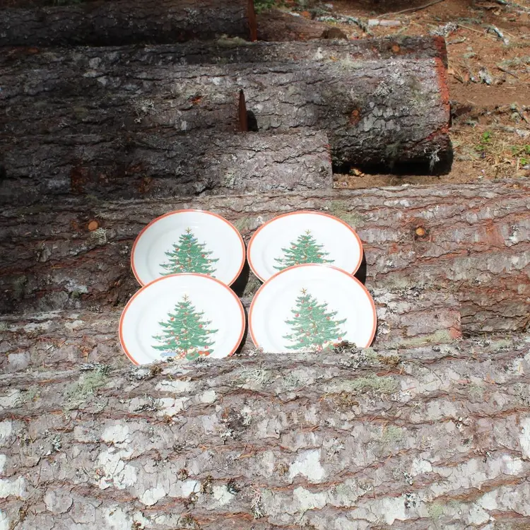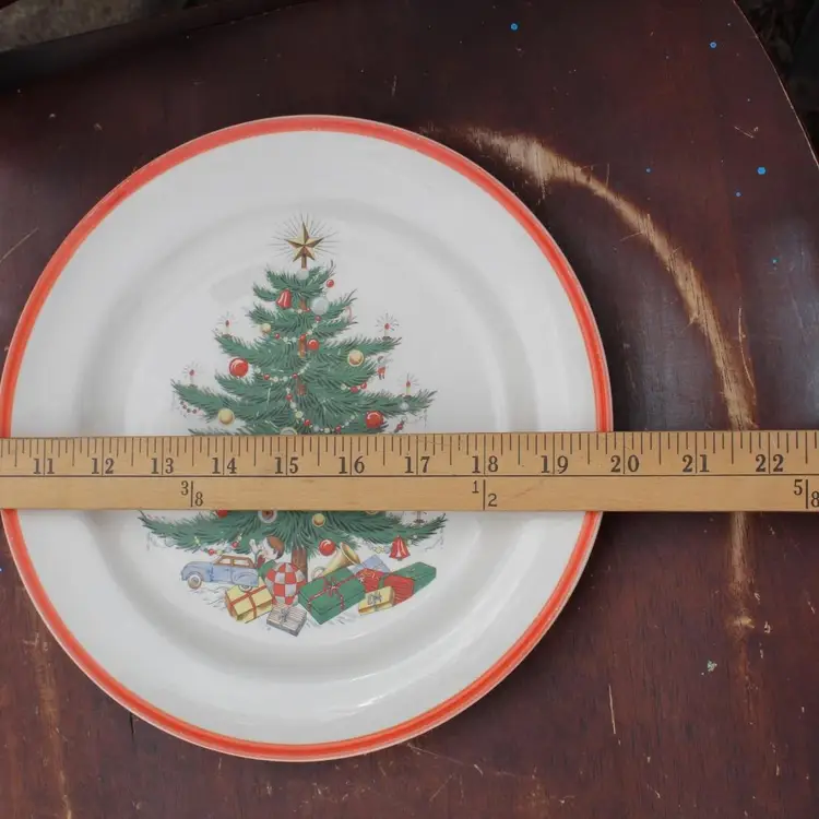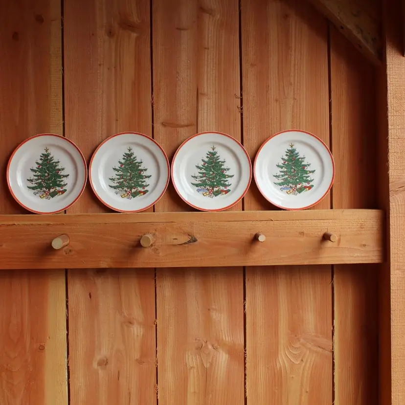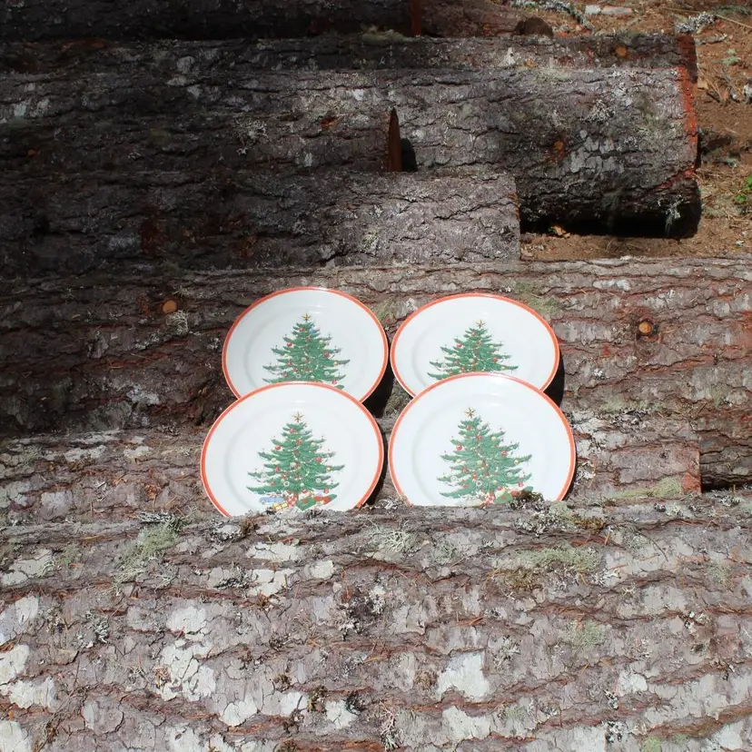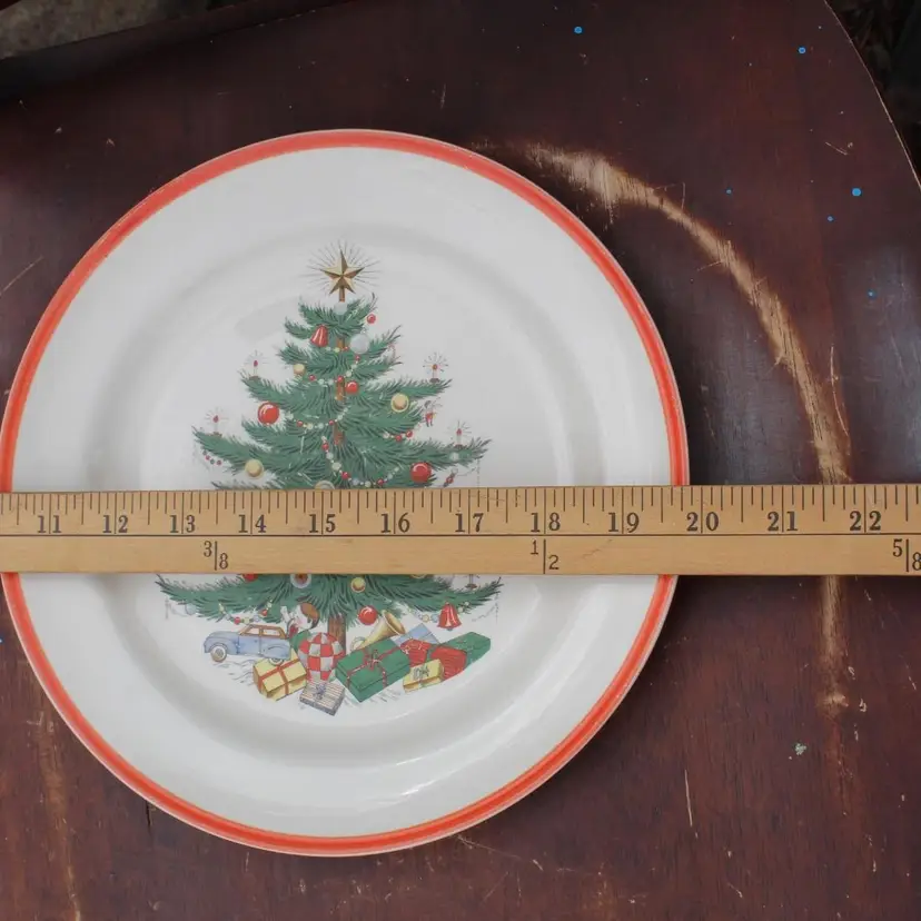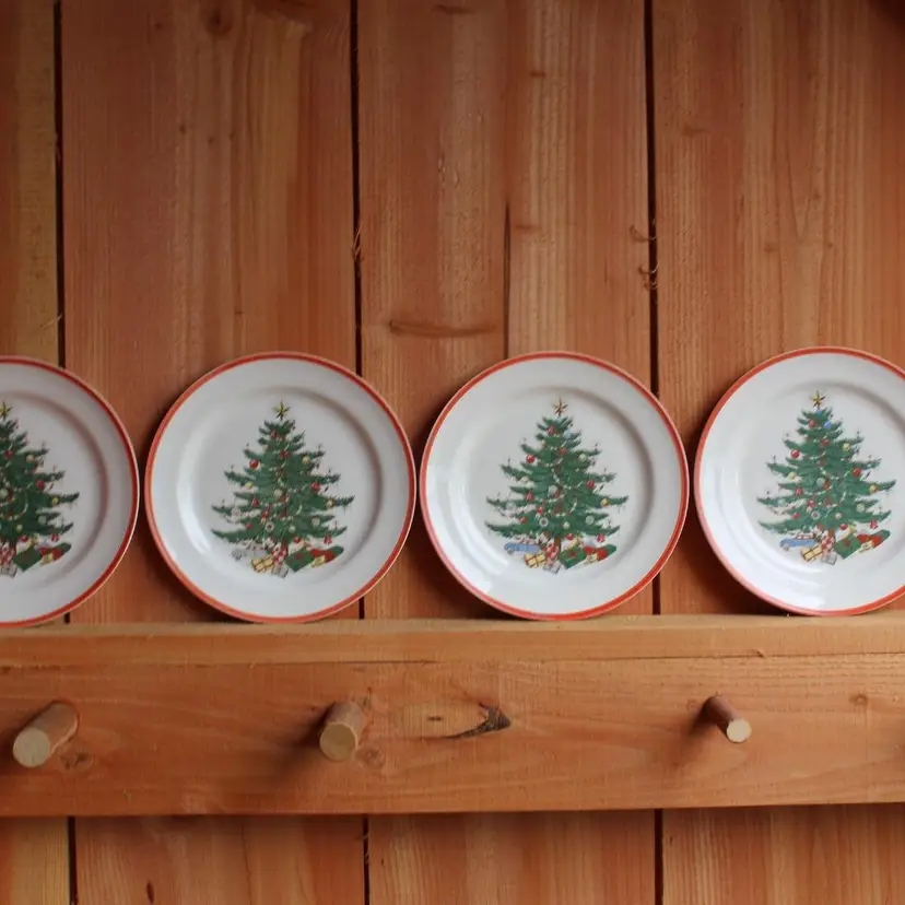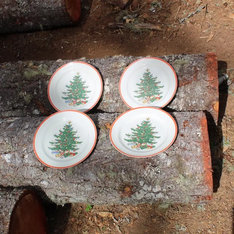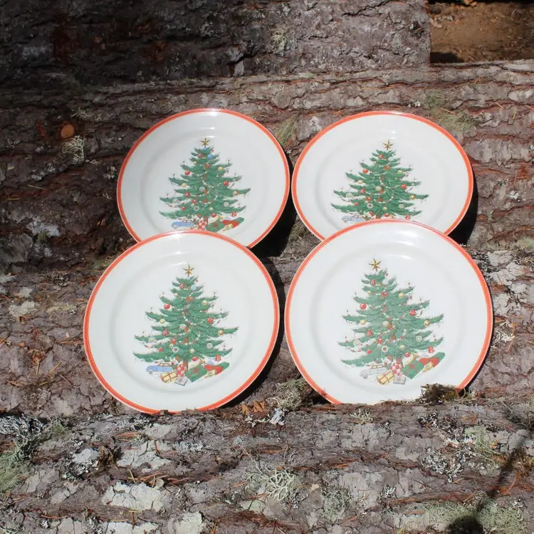 Celebrate the holiday season with this charming set of 4 vintage Christmas tree plates. Each plate features a festive Christmas tree design with a red rim, perfect for adding a touch of nostalgia to your holiday table. These plates are in great condition for their age, with minor surface scratches and slight paint fading. Please see photos for details. These are the actual plates you will be receiving. ~~ ♥ ~~ My knowledge may be limited on some things, otherwise what I have learned I have found online. ~All of my vintage items have been hand cleaned. Please view all photos carefully for more details as they are part of the description. ~~ ♥ ~~Please note there are no refunds/returns/exchanges based on their pre-owned appearance. Smoke-free home. Due to the nature of vintage items, some wear is normal; Colors may be slightly different than shown due to the nature of color variation from monitor to monitor. Please note that you are buying these items "As Found" and "As Is." These items are in varied stages of condition and age. Not responsible for loss or damage during shipment. I also use recycled packing material and boxes whenever possible. If you are not satisfied with your purchase, please contact me immediately for a resolution prior to leaving feedback. I will work with you to resolve the issue. Take it easy~Kelly ~♥ ~~Offers welcomed. ~~ ♥ ~*~.