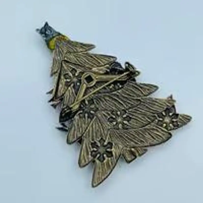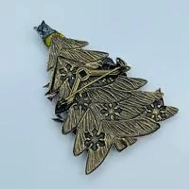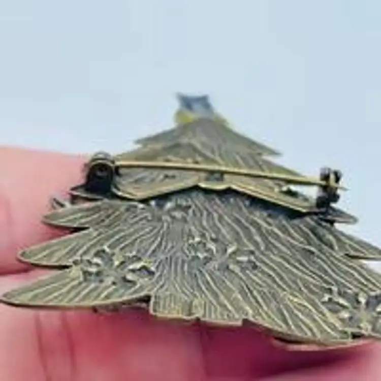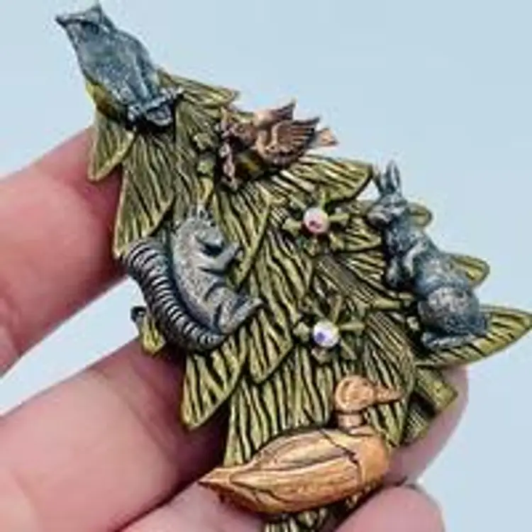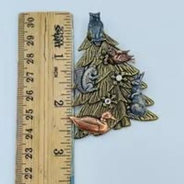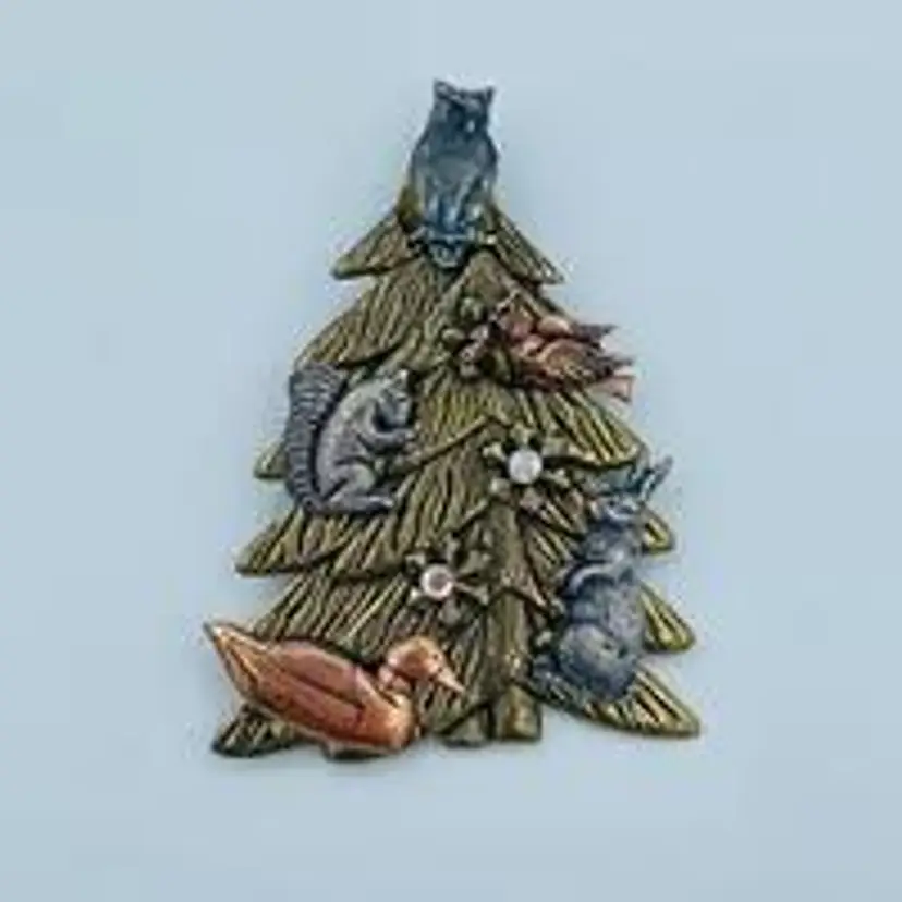 Charming brooch featuring a Christmas tree adorned with various woodland animals. Includes a cat, squirrel, bird, rabbit, and duck. Great preowned condition. See all images for full details and more info. Jewel embellishments.