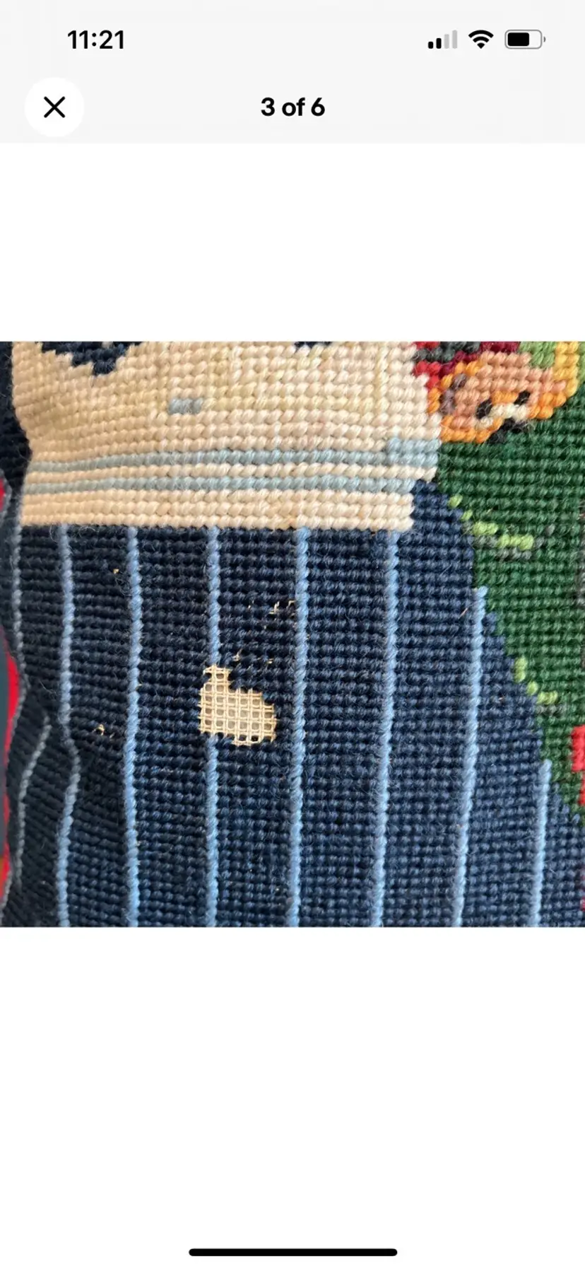 Vintage wool & velvet needlepoint Christmas Santa Claus throw pillow. This was rescued at an estate sale and they were stored in the attic. This one does need some repair due to some missing stitches. Fortunately the cover is removable so as to make the repair easier. 14”x14”