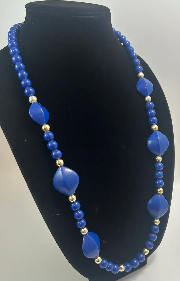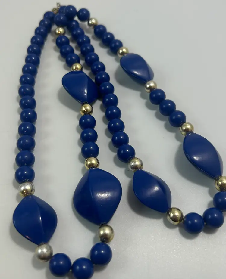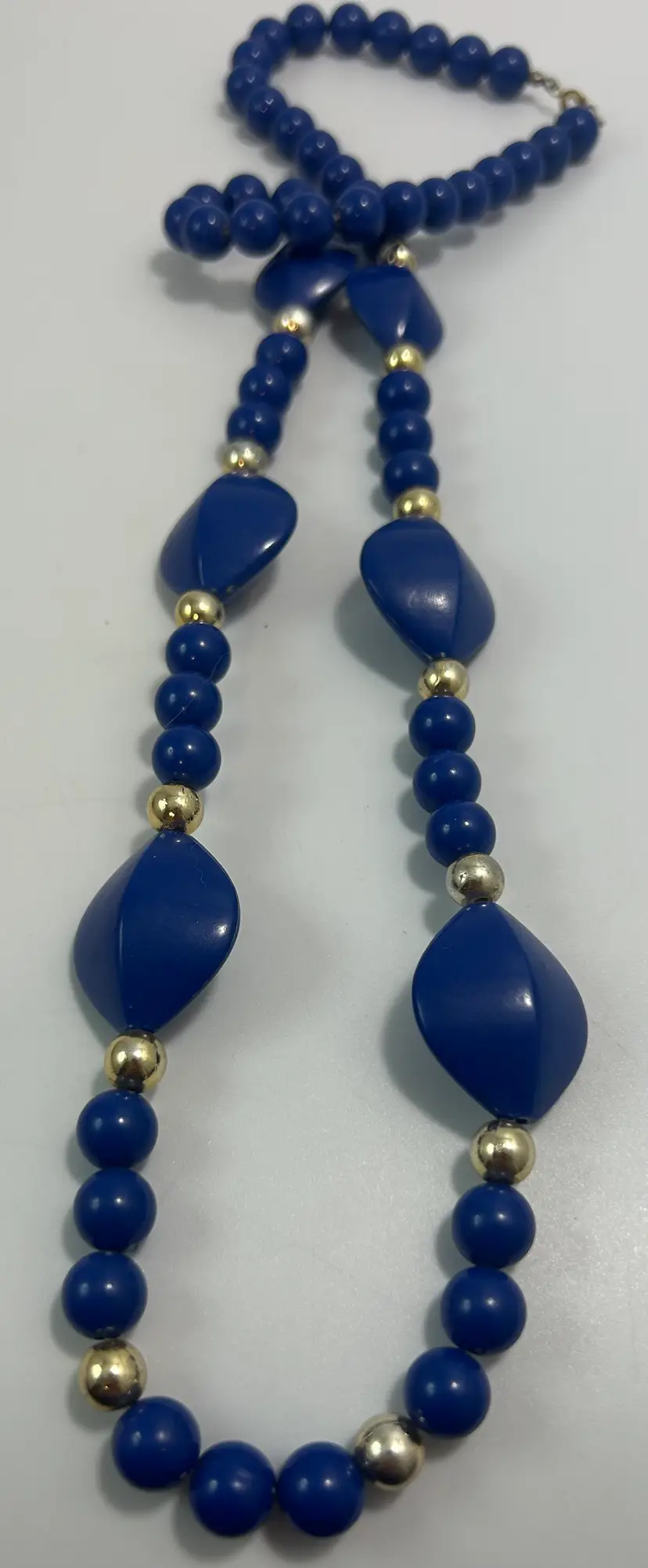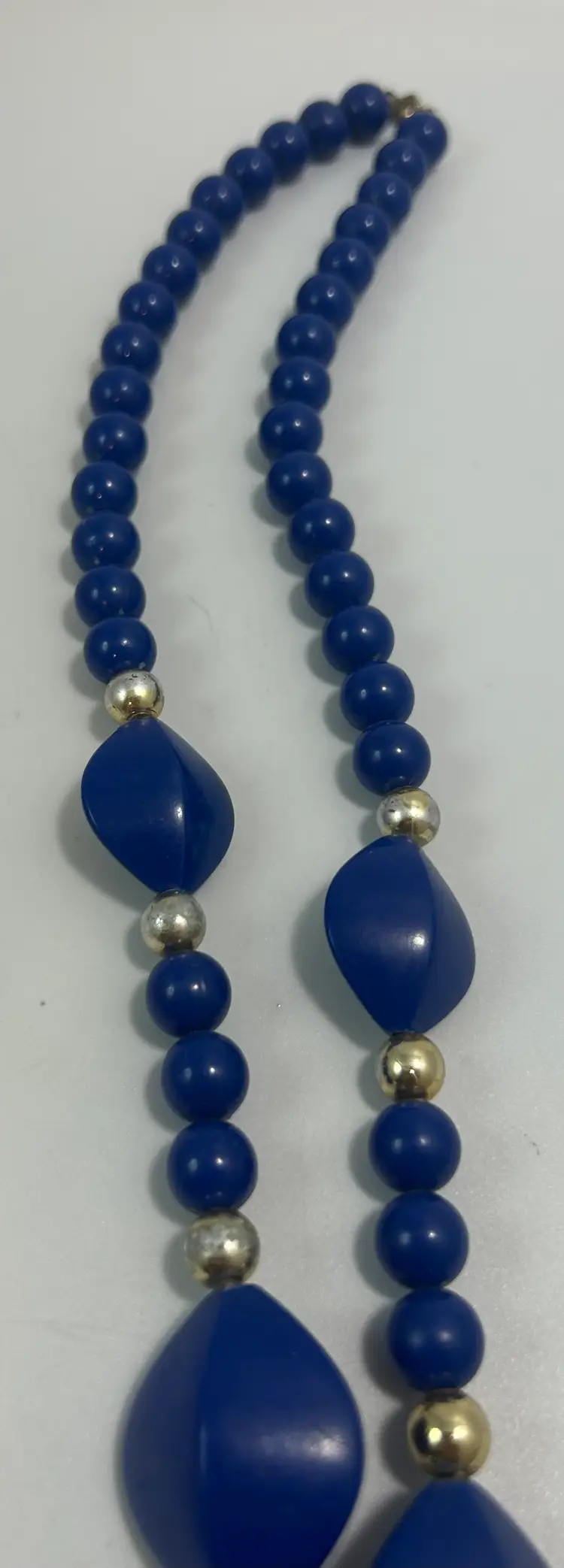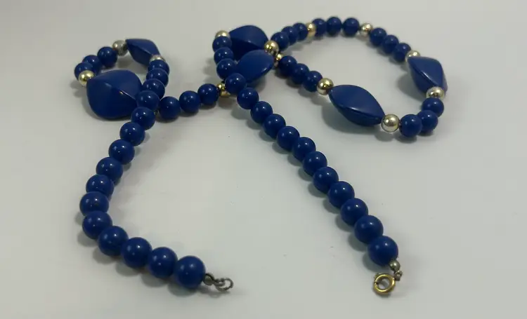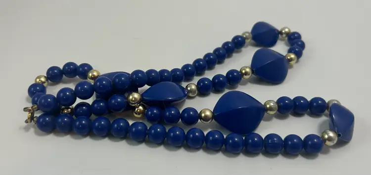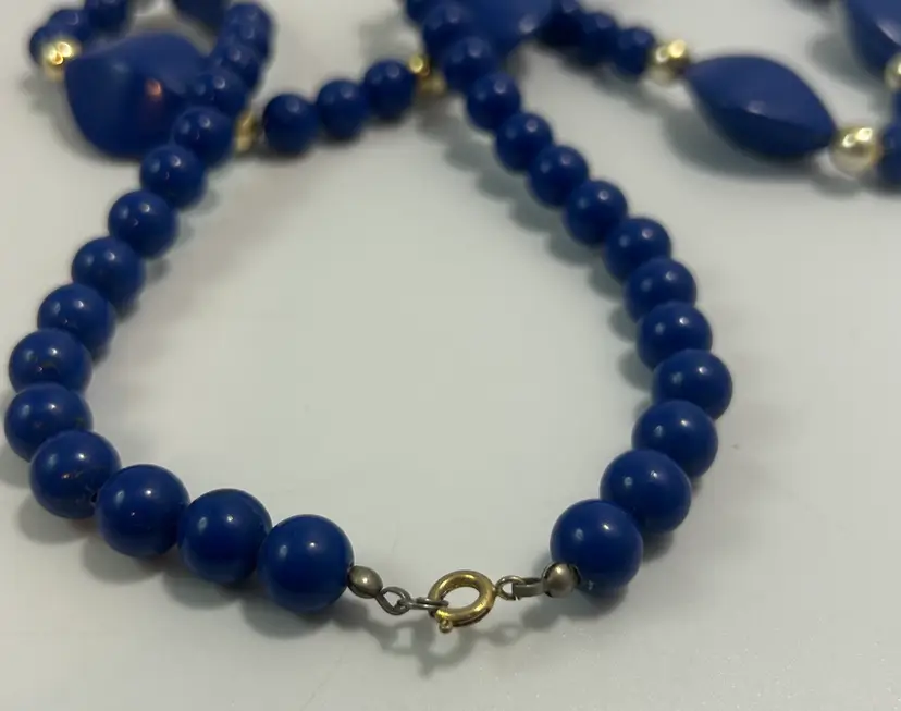 31" Strand Length. No missing or broken blue beads, common wear throughout. Some Gold Tone on the spacers are flaking/worn, the 2 towards the top have the most wear.