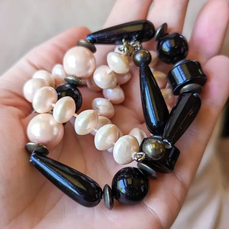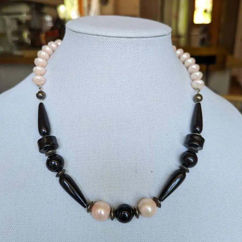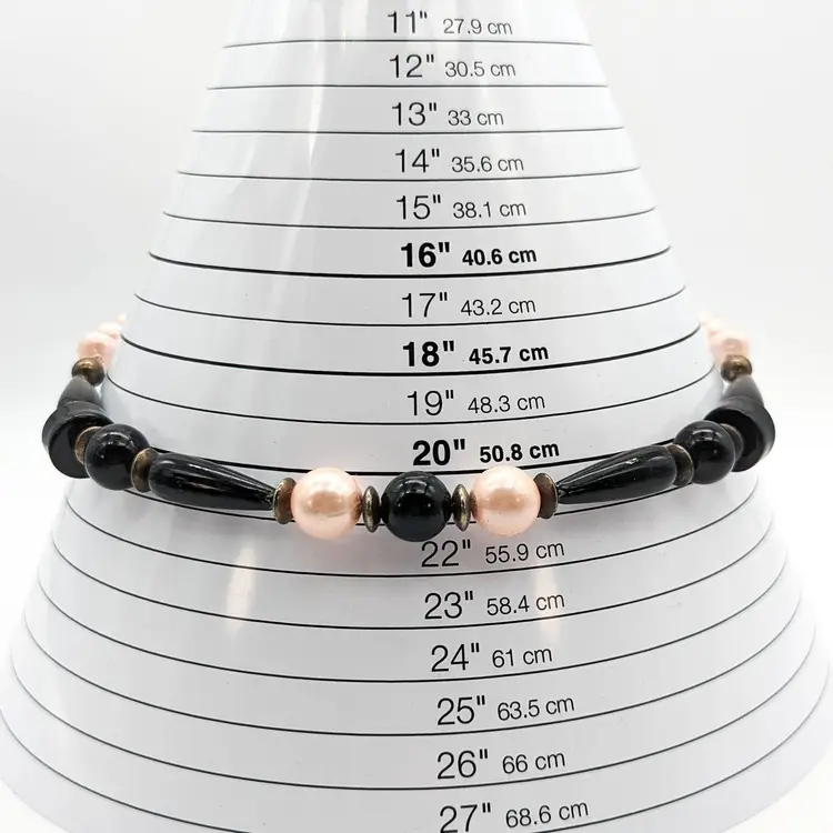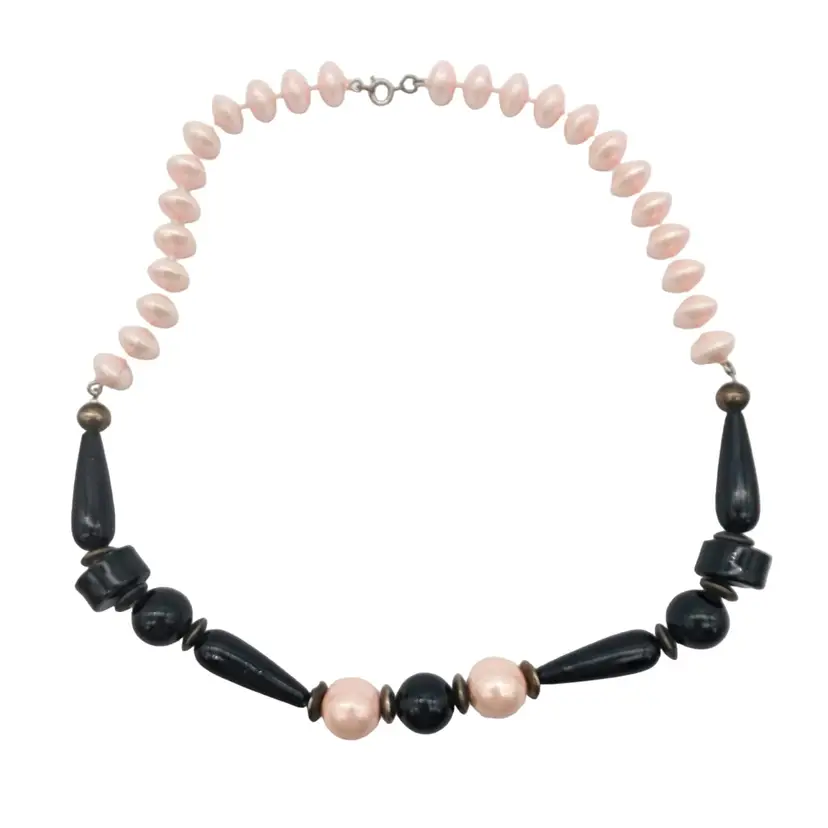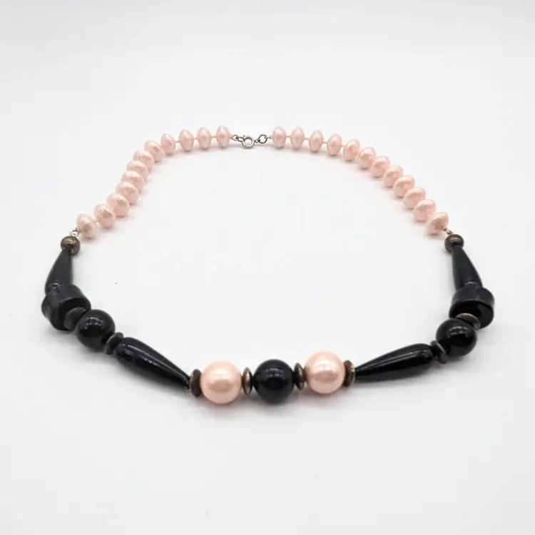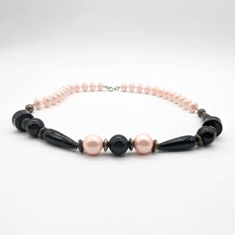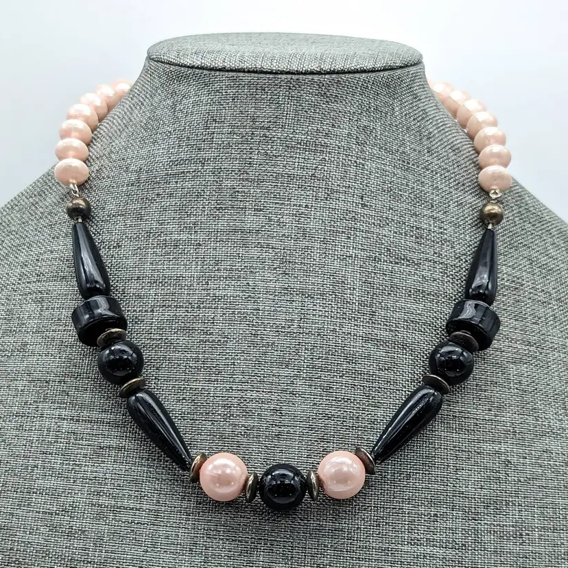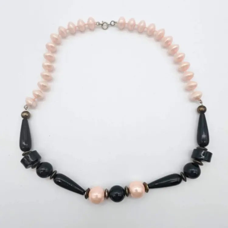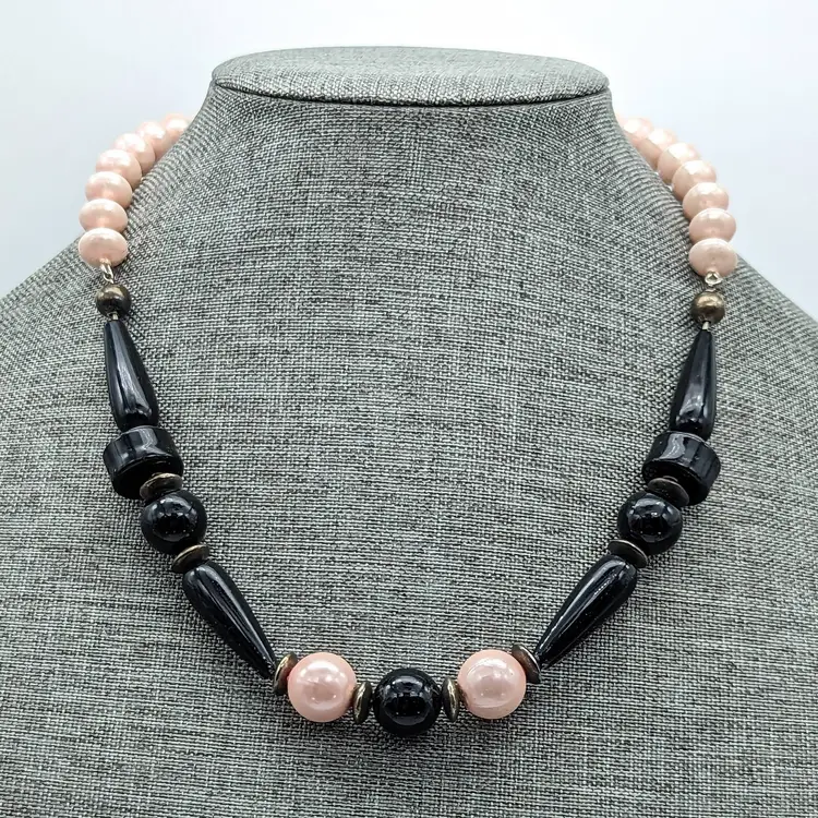 Vintage Chunky Pink And Black Beaded Necklace with Sphere Disc and Teardrop Shapes