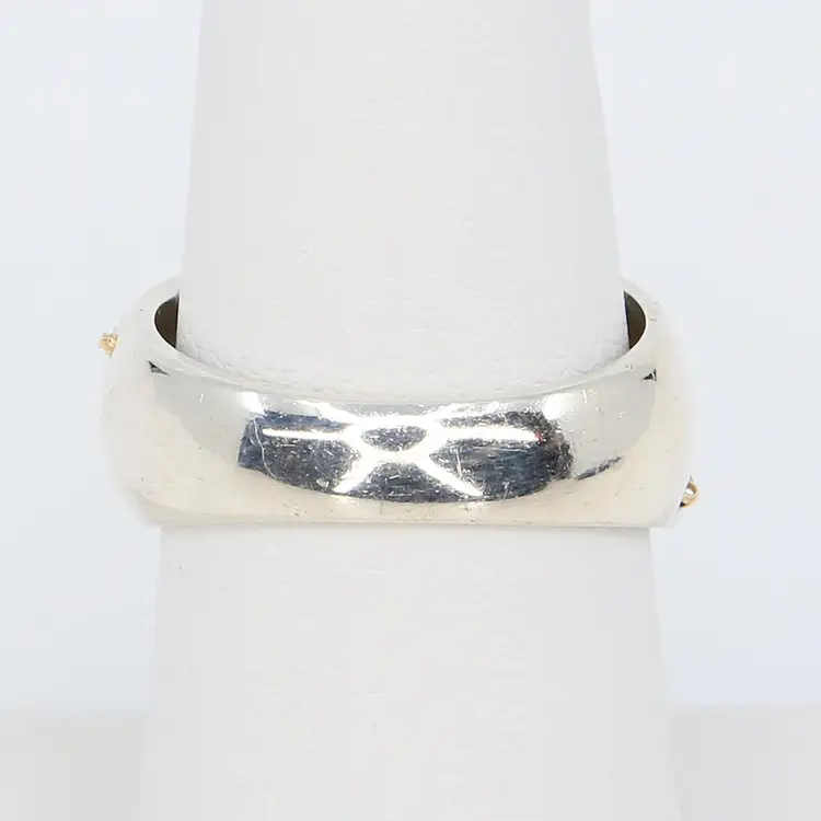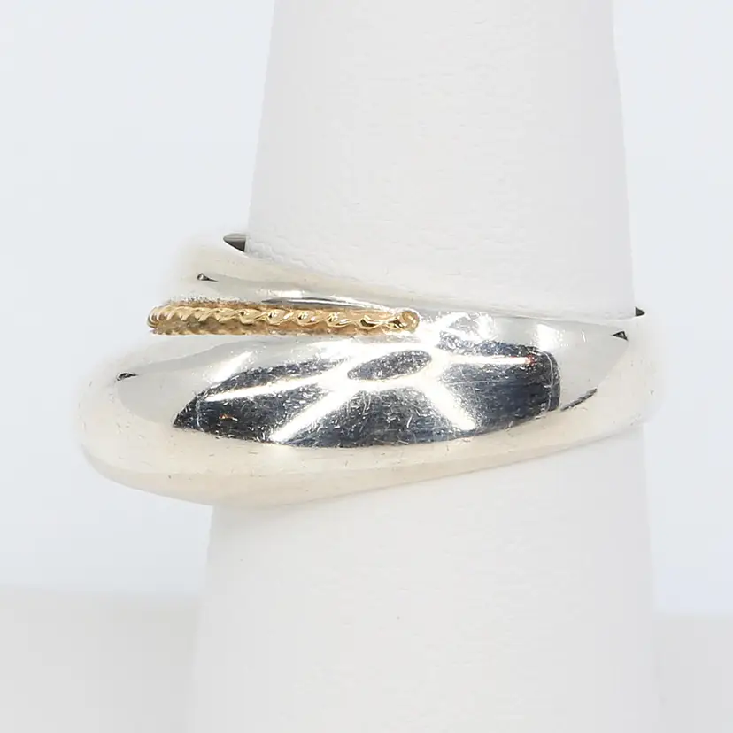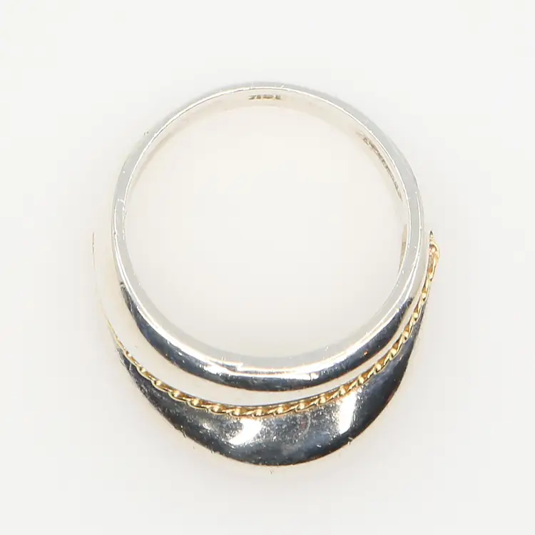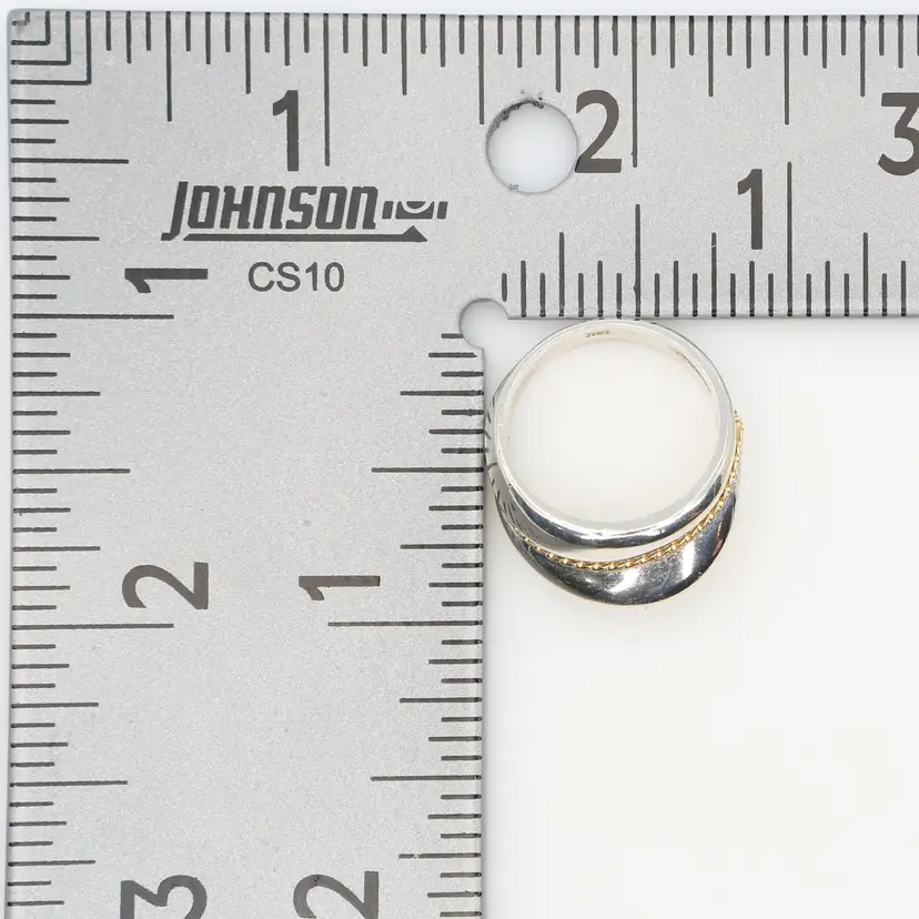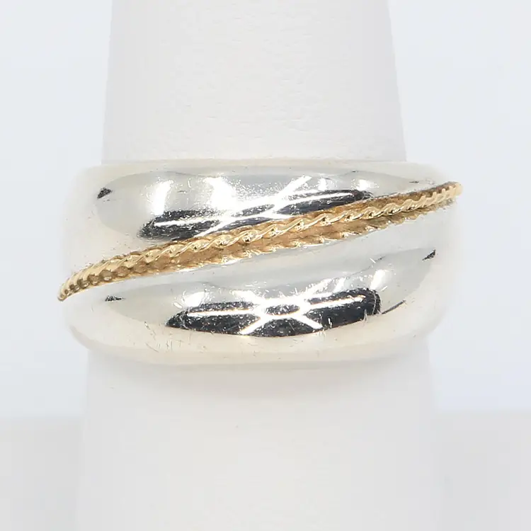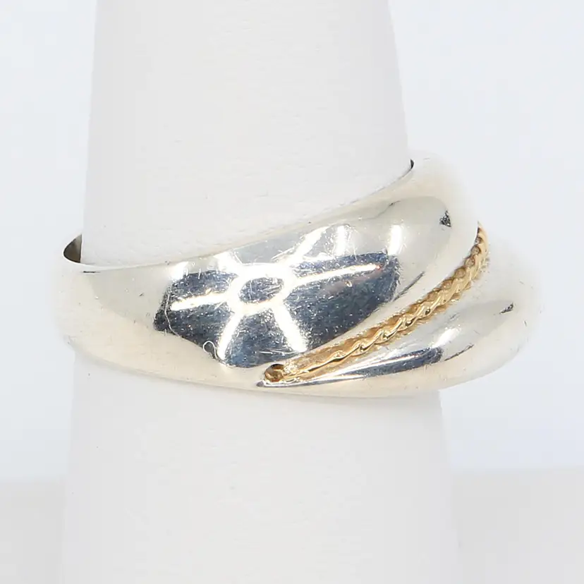 This striking sterling silver ring features a dome design with an embedded 18K yellow gold rope accent, adding a touch of elegance to its chunky, fun 1980s style. The two-tone precious metal combination of sterling silver and 18K gold makes it versatile, pairing easily with other jewelry and outfits, whether dressed up or down. Sized 6.75 and marked SILVER and 18K on the inside, this simple, yet elegant, ring is perfect for any occasion. This vintage chunky sterling silver with 18K gold twisted rope ring offers a bold yet classic look that complements any jewelry collection.