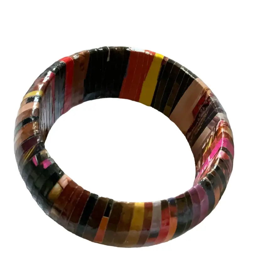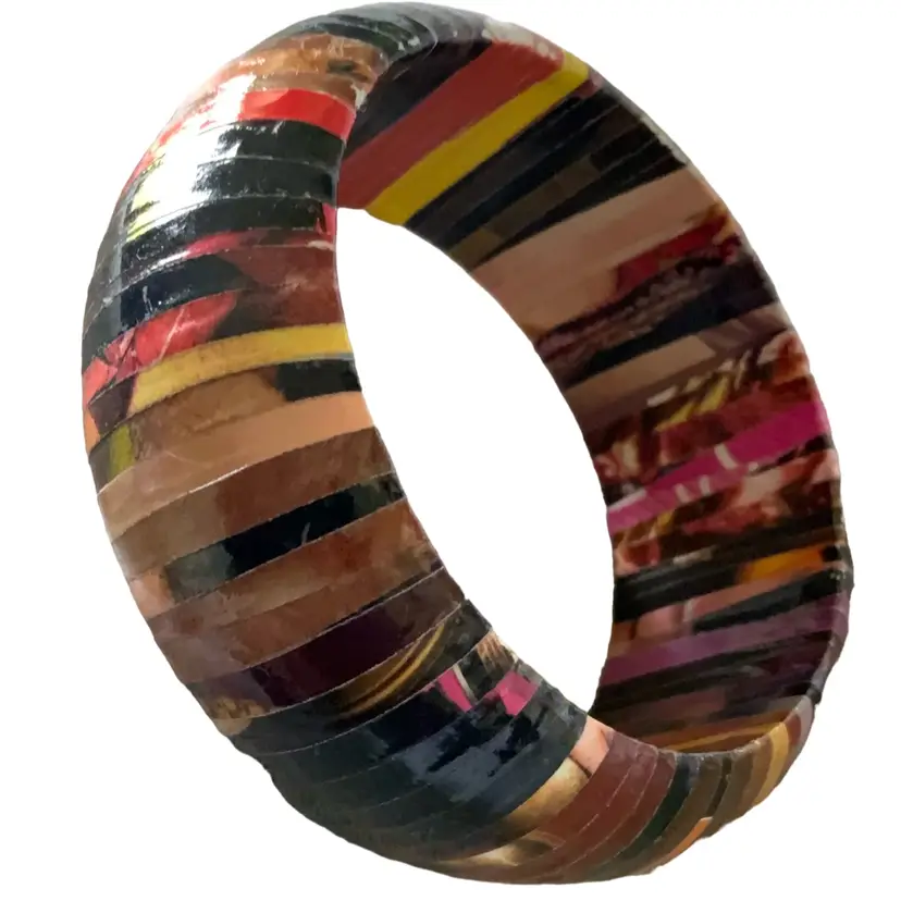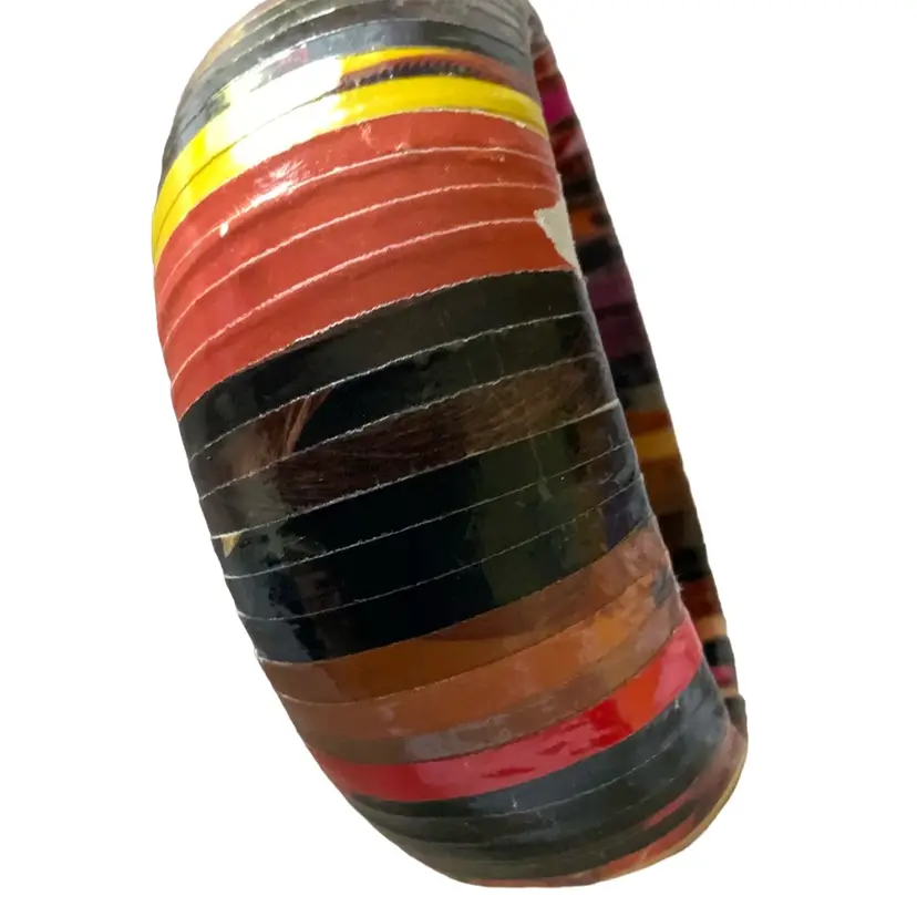 Cool shinny bangle, it looks to be in good condition. Approximately 2.75” diameter and .3” tall. Please review photo. Some sort of hard acrylic and metallic material