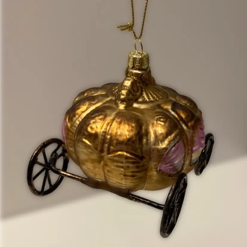 Vintage Cinderella’s glass pumpkin carriage. Beautiful details. This ornament measures 3 1/2” x 3” x 3 1/2” tall. Wheels are metal. In good condition.