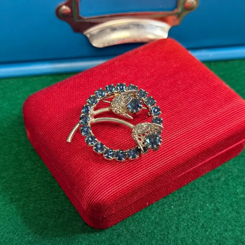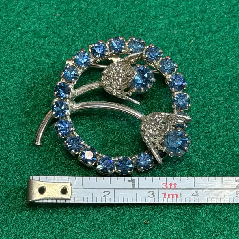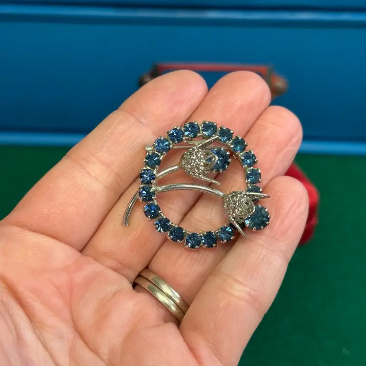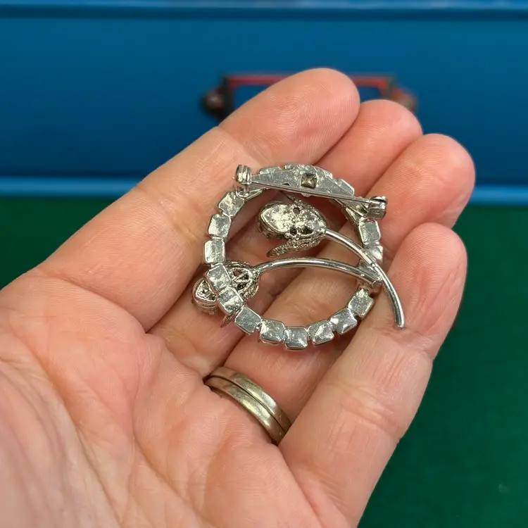 This striking, unmarked brooch is in good condition with no missing rhinestone. It is about 1-1/2 inches wide.