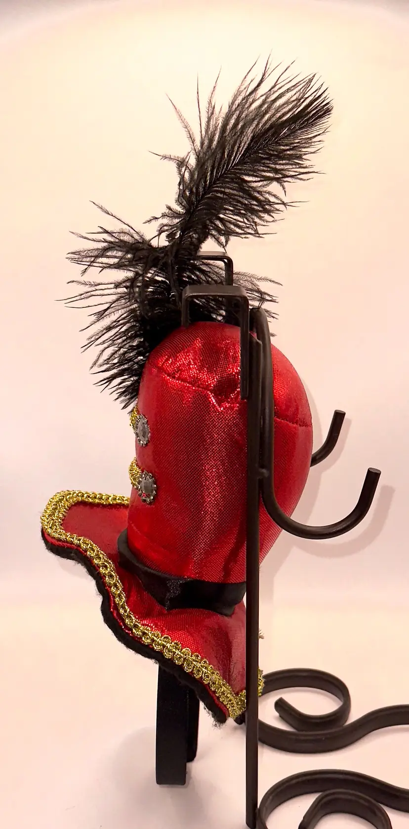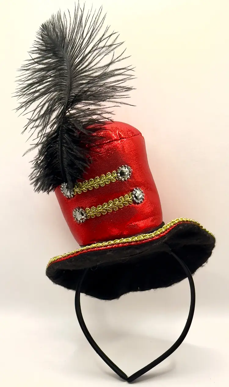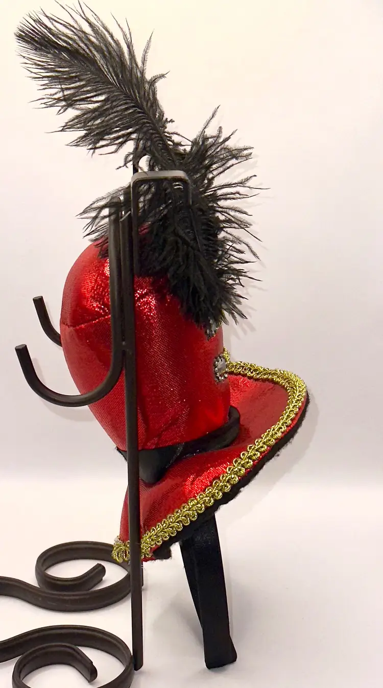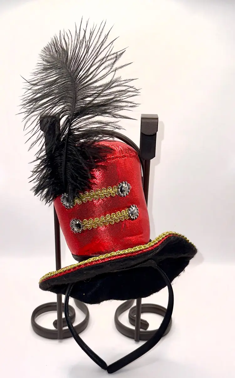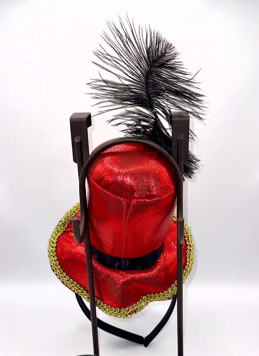 Step into a whimsical world with this vintage circus ringmaster ringleader red top hat headband. Adorned with a striking black feather and gold trim, this headband is perfect for costume parties, holiday events, or just adding a touch of fun to your day. The headband is comfortable to wear and fits most head sizes. Excellent condition with no visible wear. Measures 6x14 inches. Weighs 8oz. Stand not included.