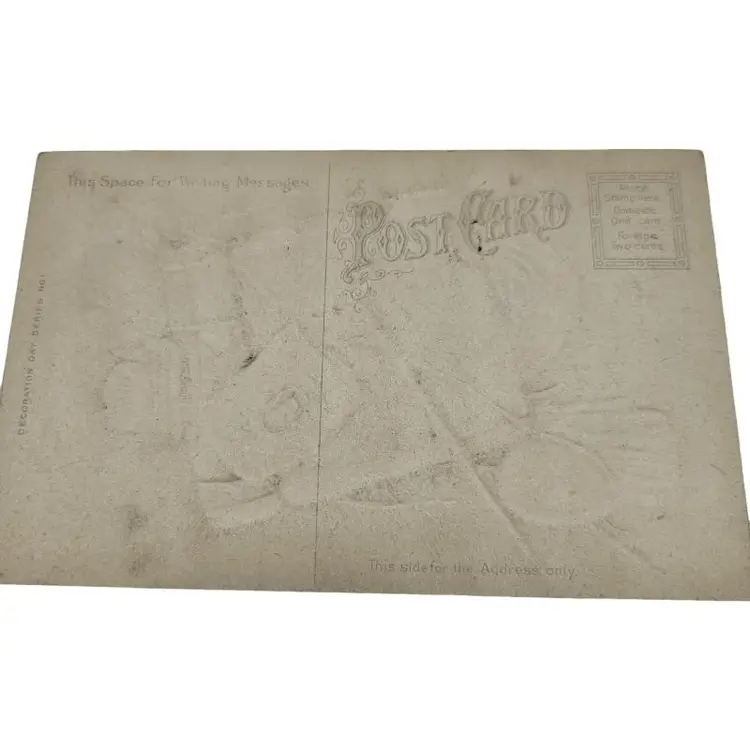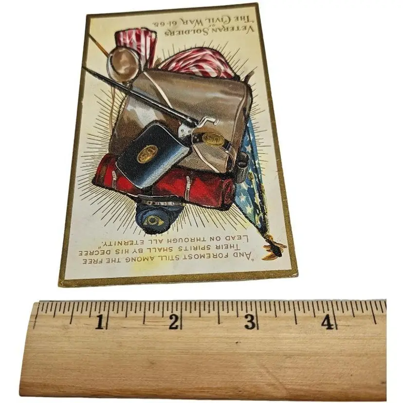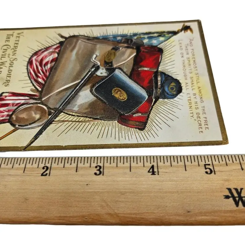 Decorative card featuring Civil War memorabilia. Includes flag, hat, and sword.
