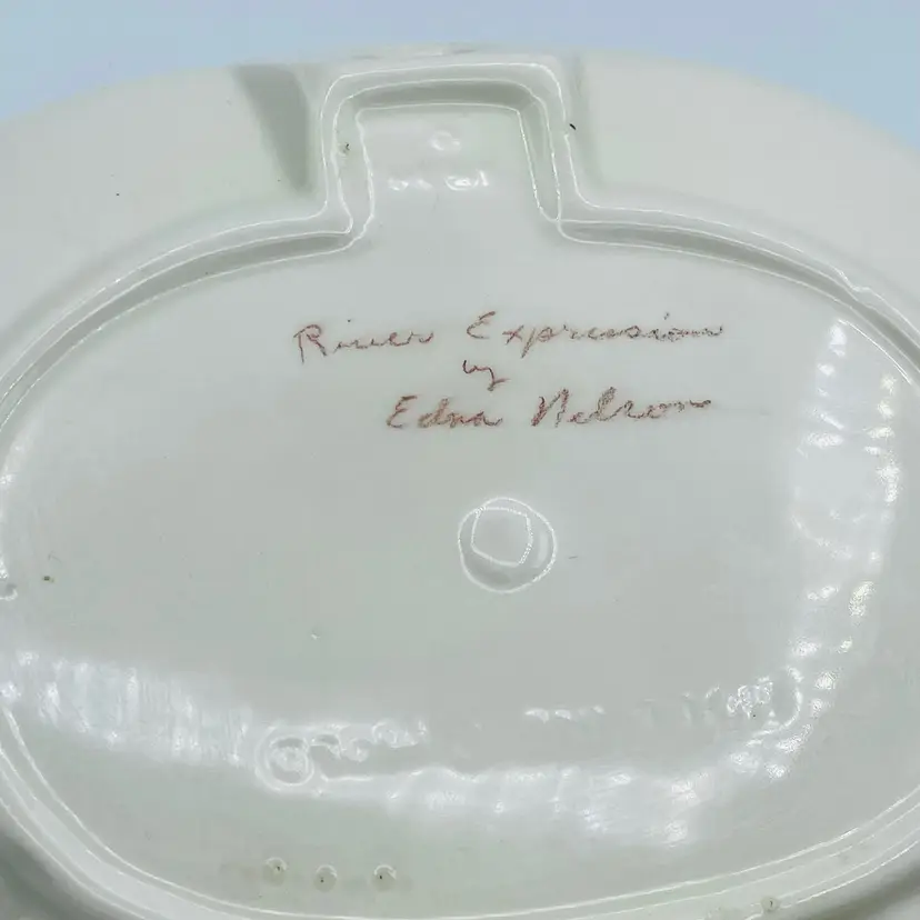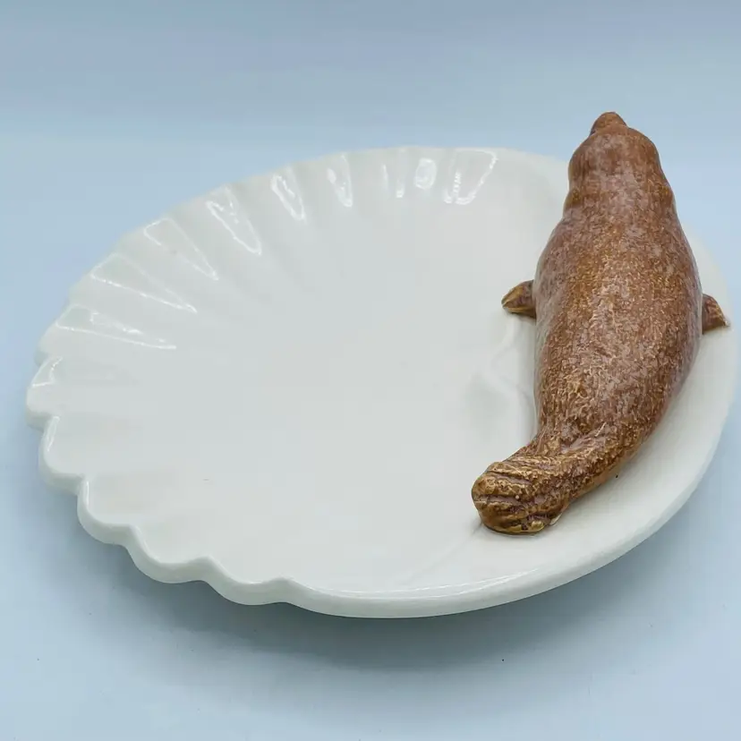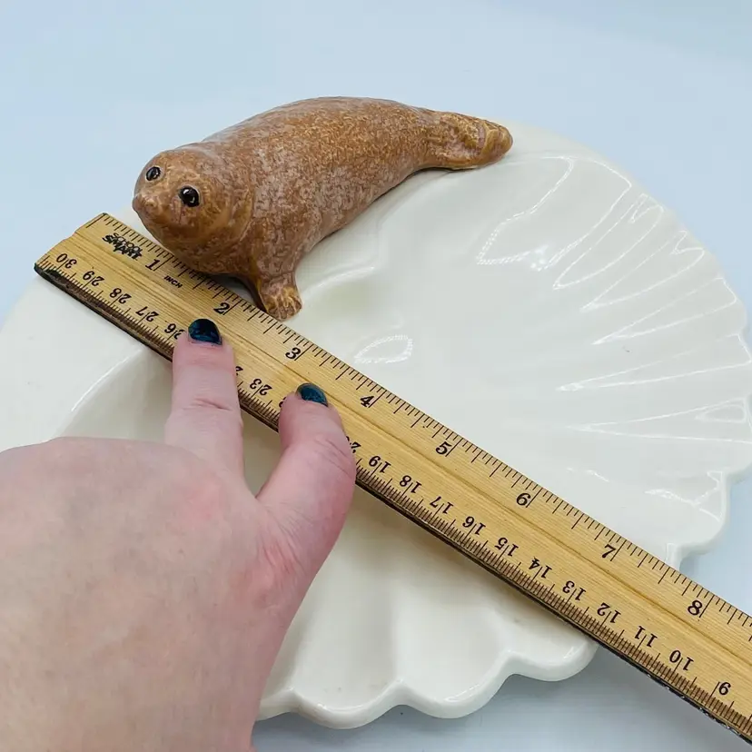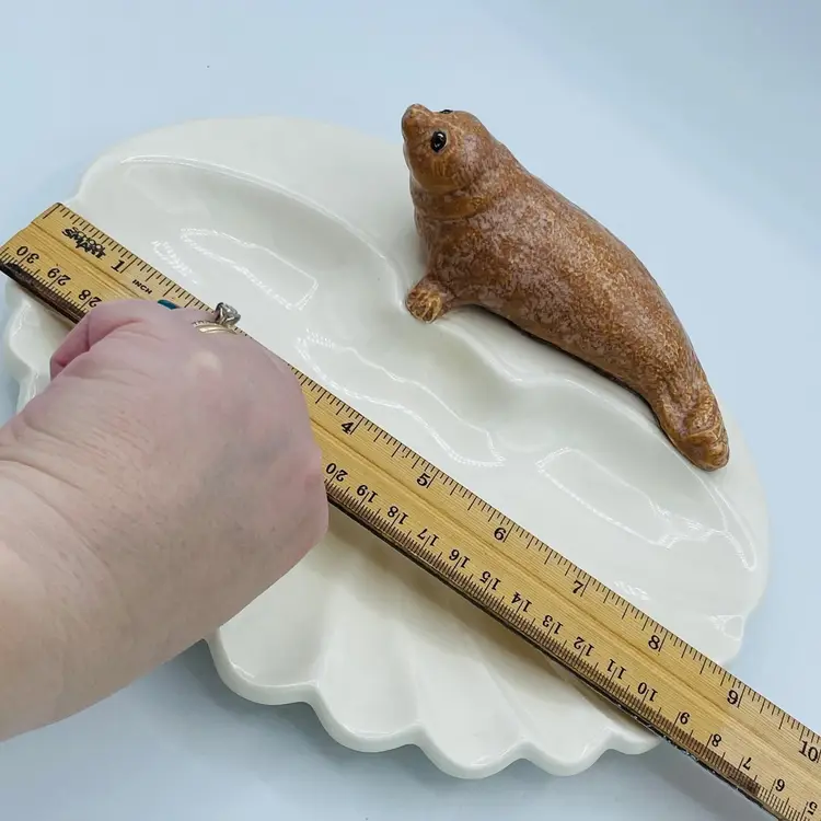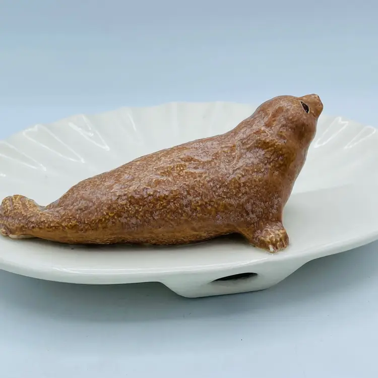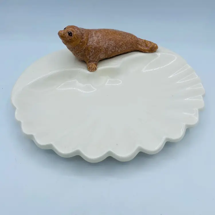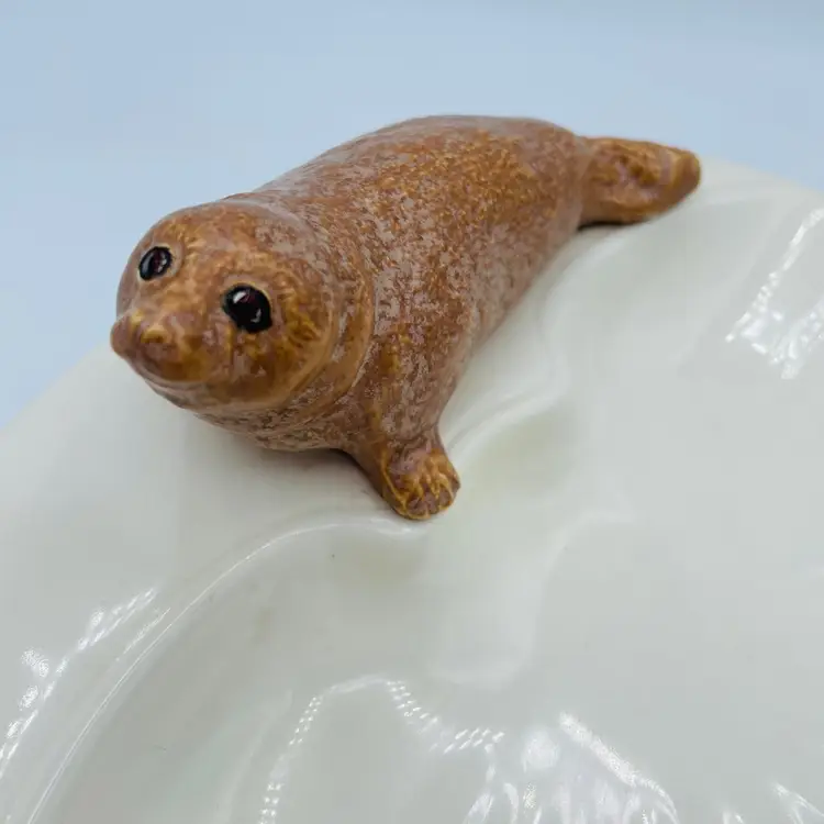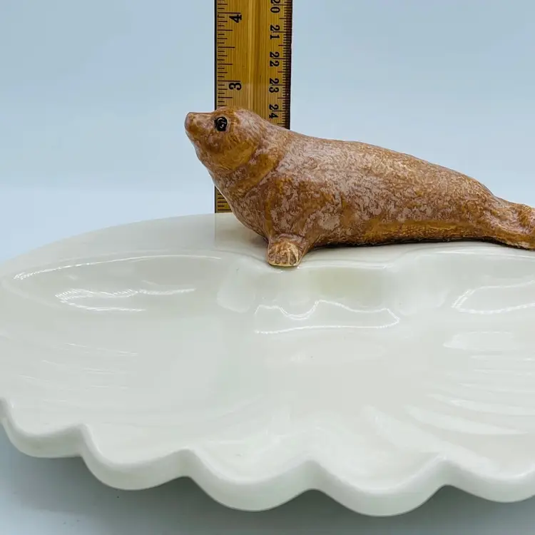 Nice old ceramic piece seal perched on a clam shell base. Appears to be an old ashtray or old trinket dish. Nice decorative mid century antique. Signed by what appears to be Edna Nelson or Edna Nelron on bottom. Titled River Expressions and marked HOLLAND MOLD. No chips or cracks. See all images for full details and more info.