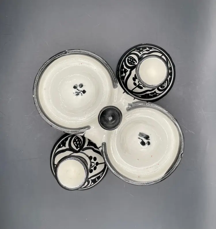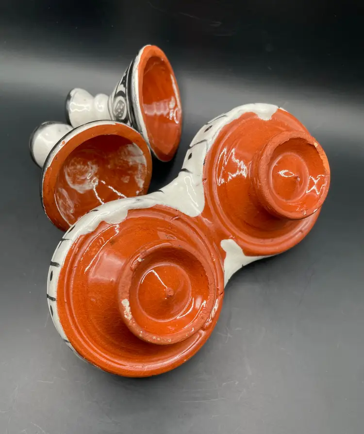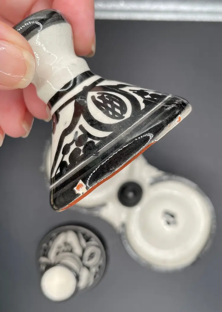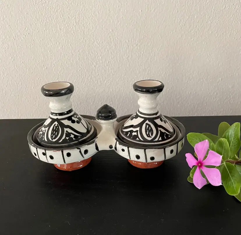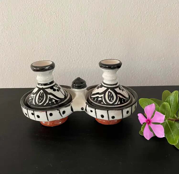 Very cute mini-set of two tagines (with lids). Some light chipping, but pretty good condition overall. Use for decoration or for food service.