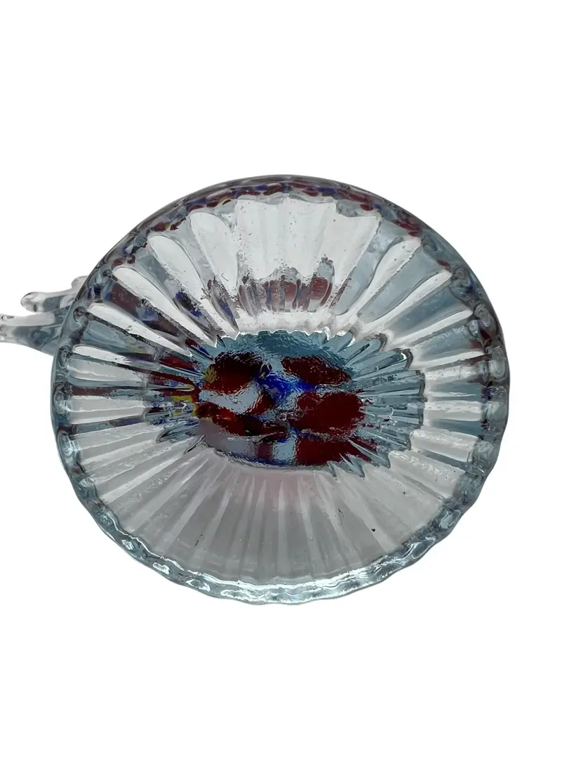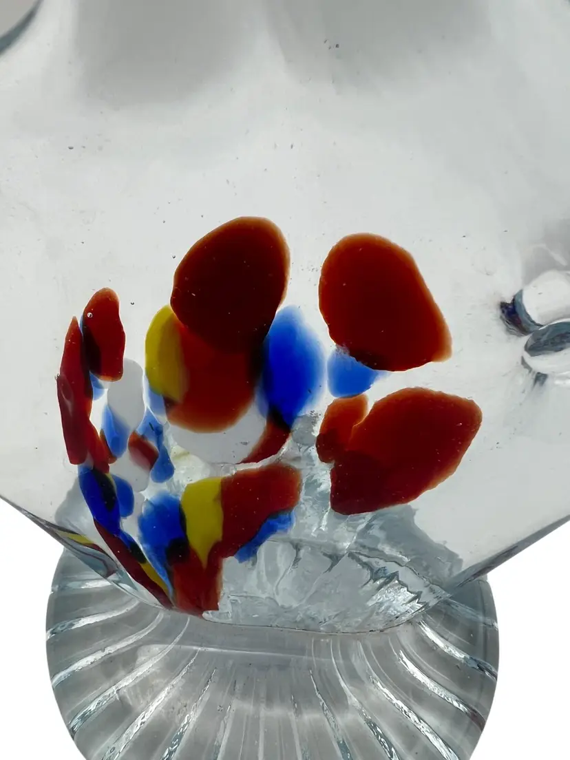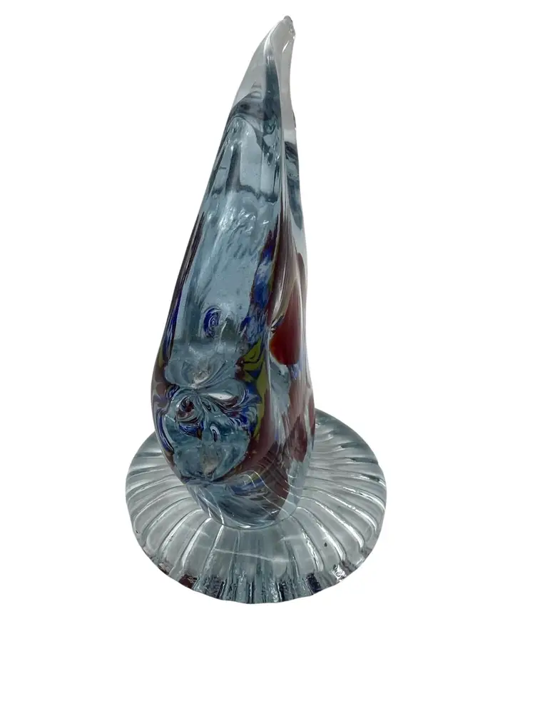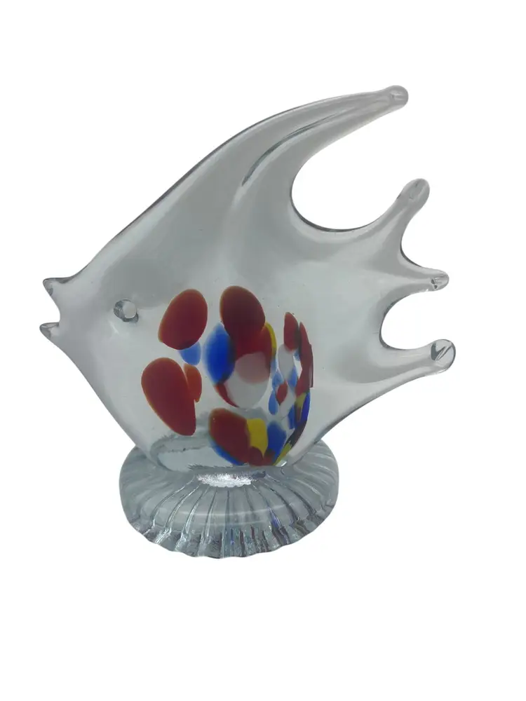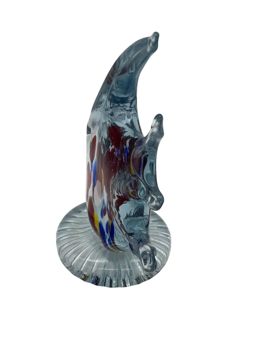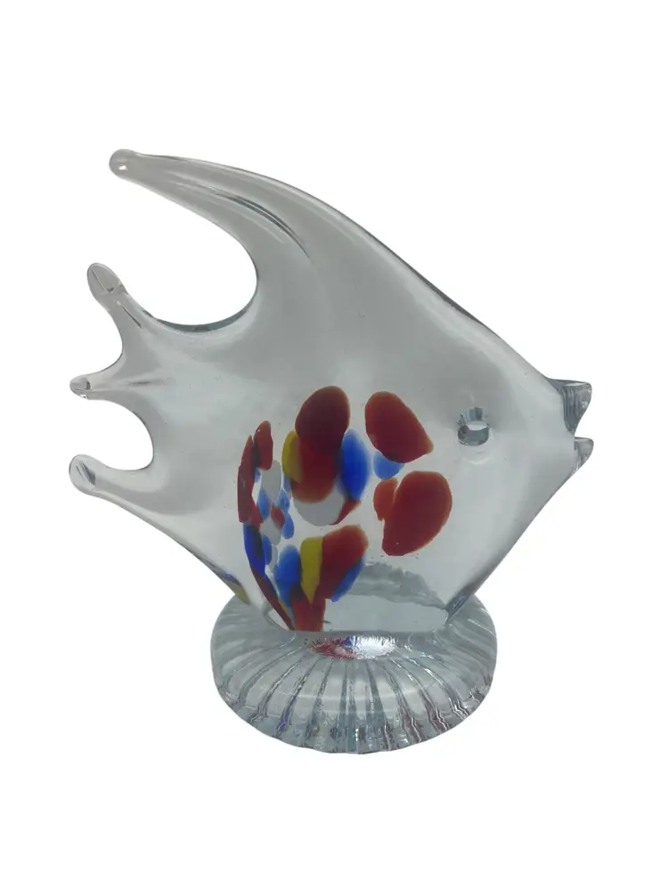 Vintage art glass fish shaped paperweight. It is clear glass with various colored spots inside the glass. It measures approximately 5" tall and 5.25" long. The paperweight weighs approximately 1lb 1oz.