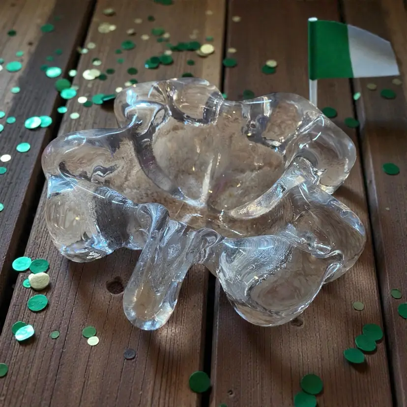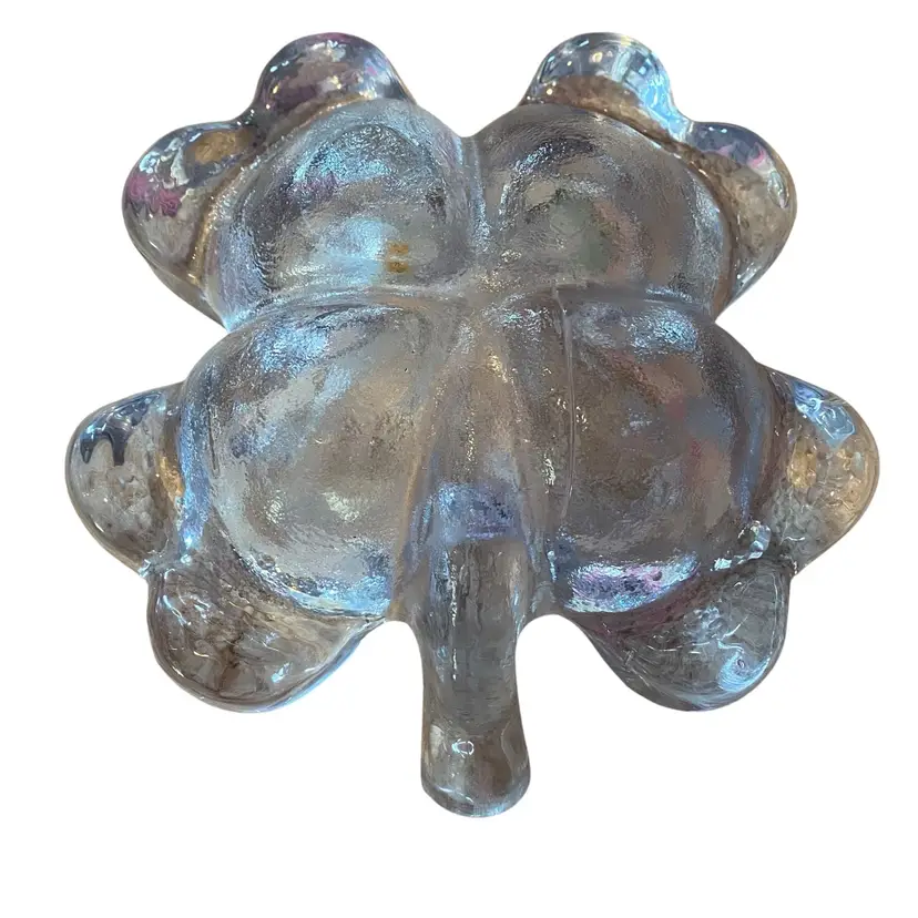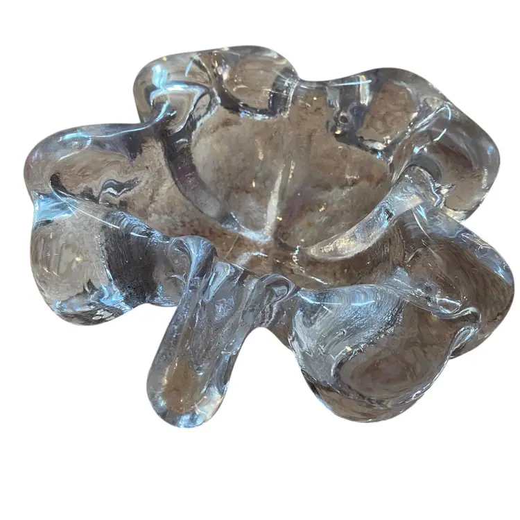 vintage clear crystal glass bowl, often shaped like a four-leaf clover or a flower, which was produced by companies such as Mikasa or sold as a catchall trinket dish. Shamrock. Four leaf clover. Chip on stem very thick glass. Ashtray 2.5 in tall 8in long