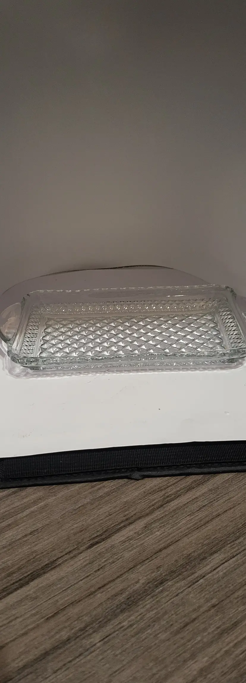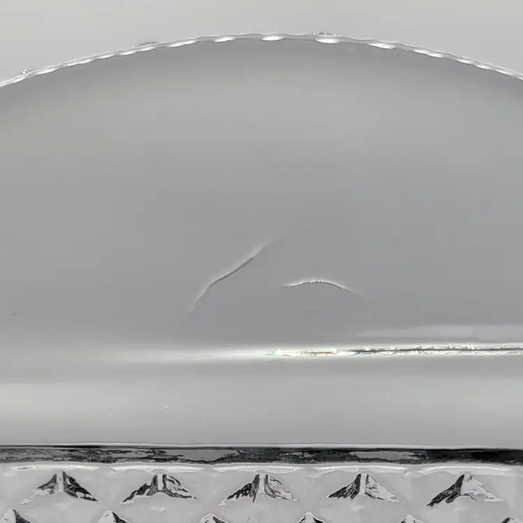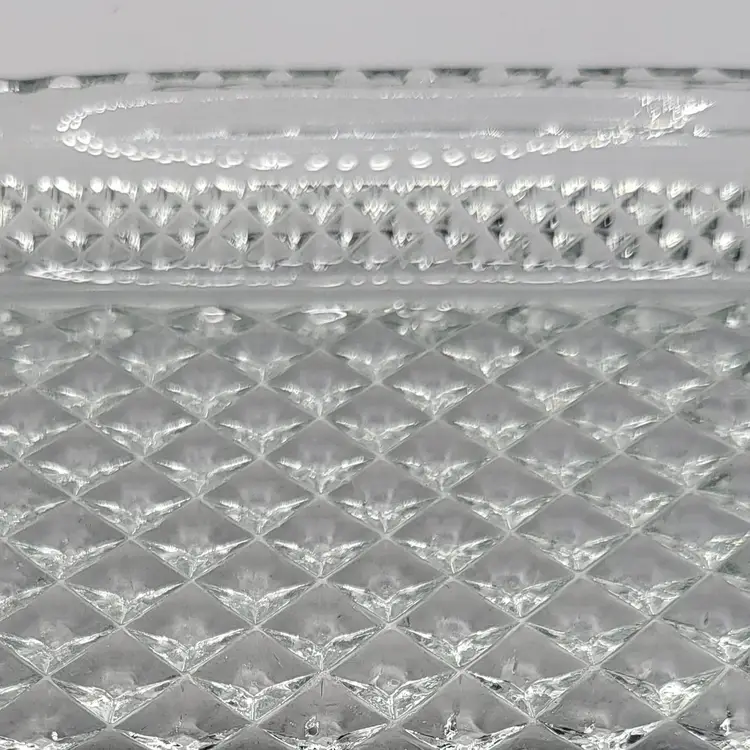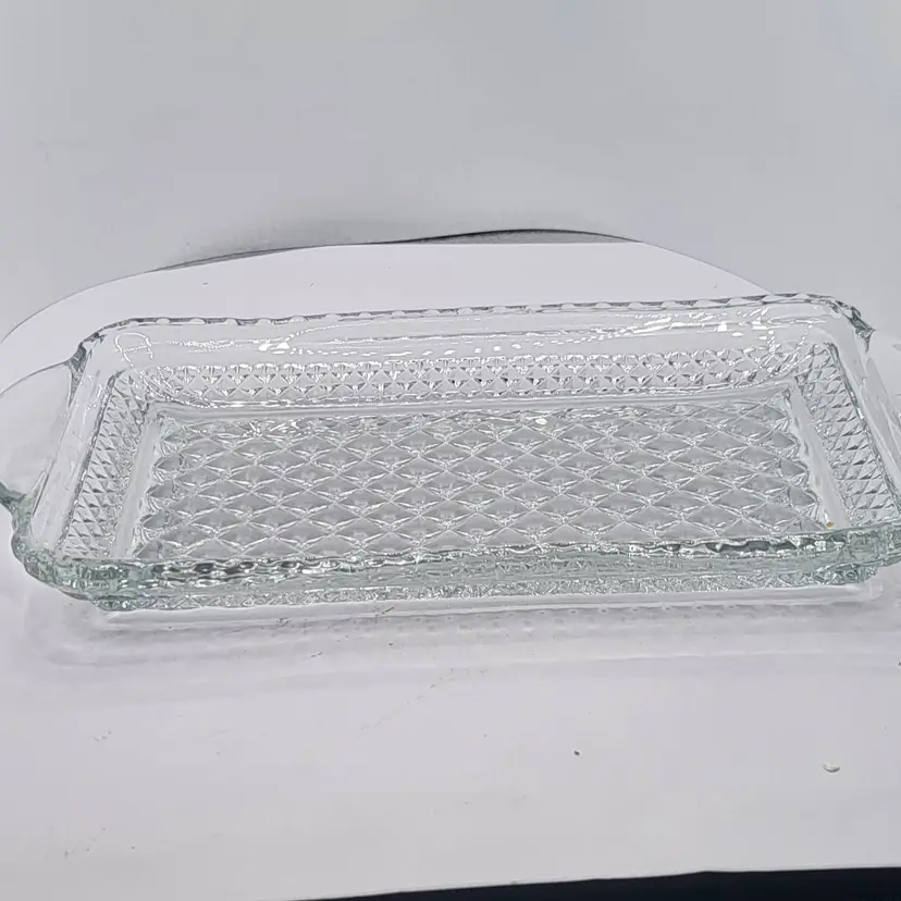 Elegant clear glass serving tray featuring a classic diamond pattern and convenient handles. Perfect for entertaining or as a stylish decor piece! Measures 9 3/4" by 5 1/8" with very unnoticeable tiny scratches on one handle